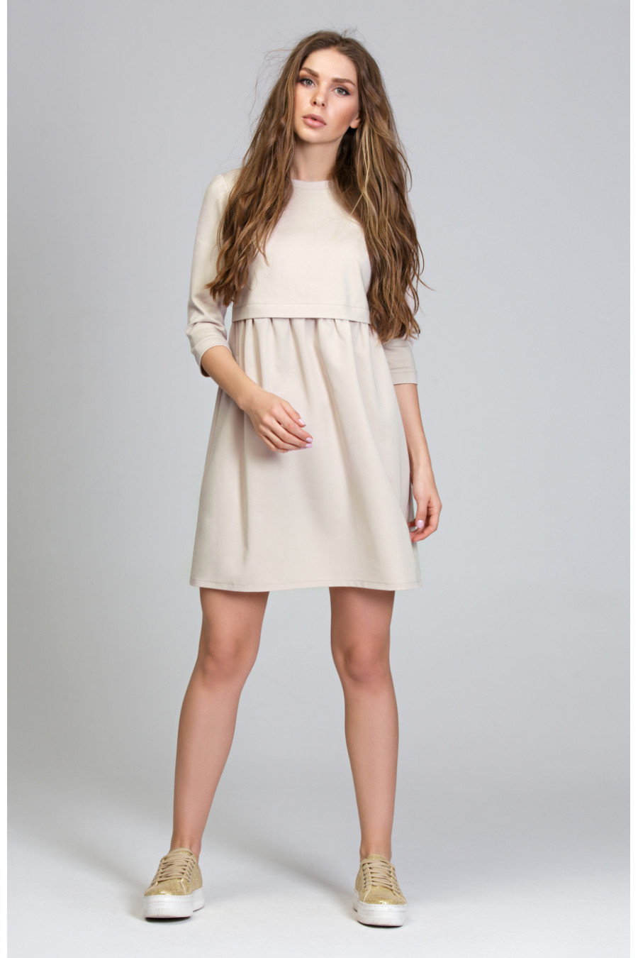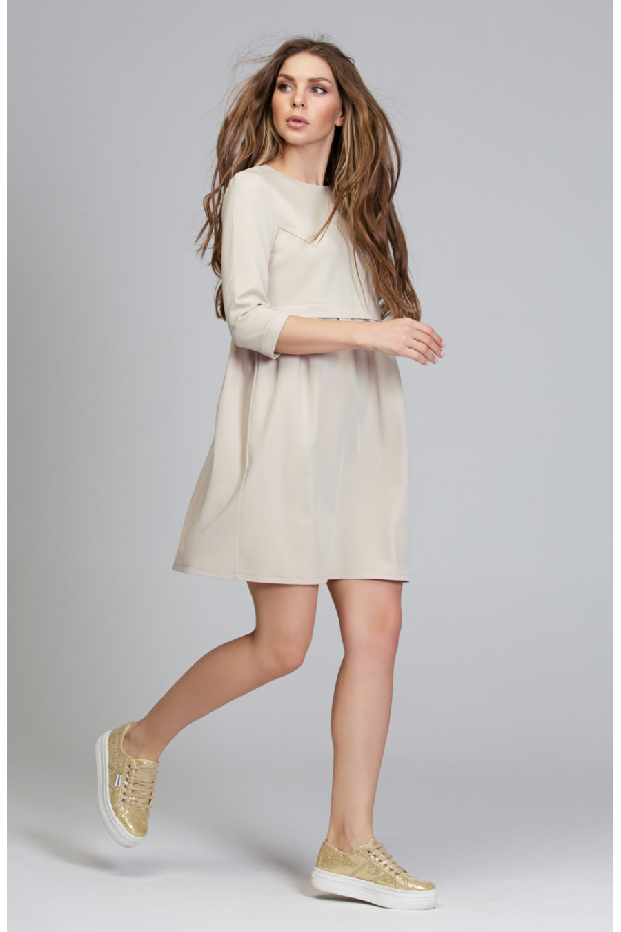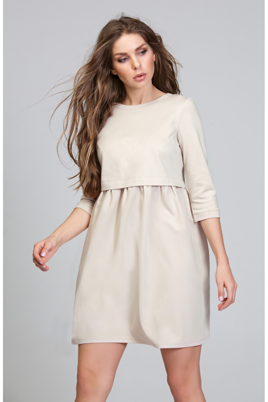 Коктейльное платье комбинированное из двух тканей; плотного трикотажа «алези» и плательной ткани «гальяно». Платье свободного покроя, имеет подрез выше линии талии и юбку на сборке. Вырез горловины не глубокий круглый, обработанный планкой. Рукав втачной ¾.
