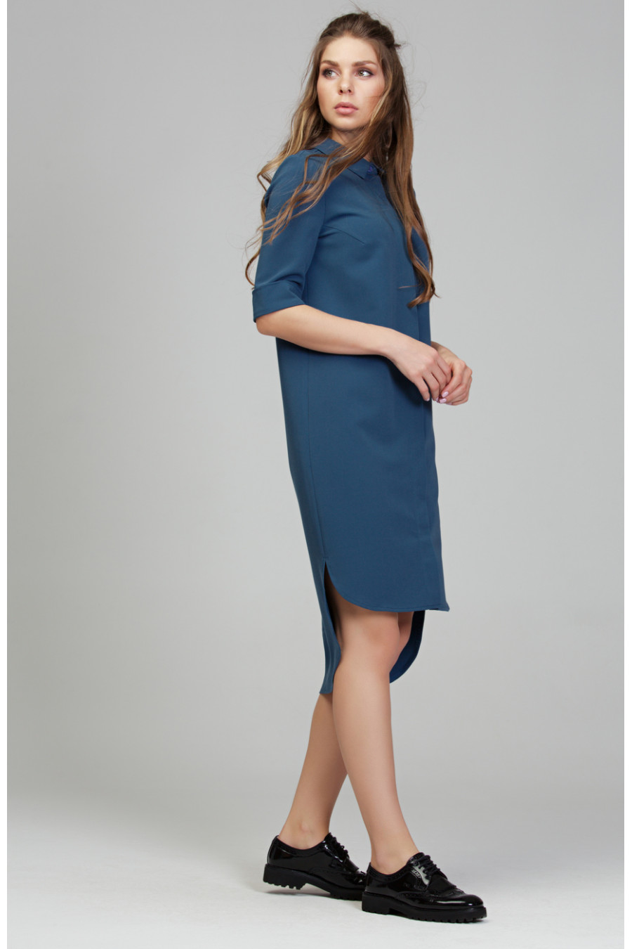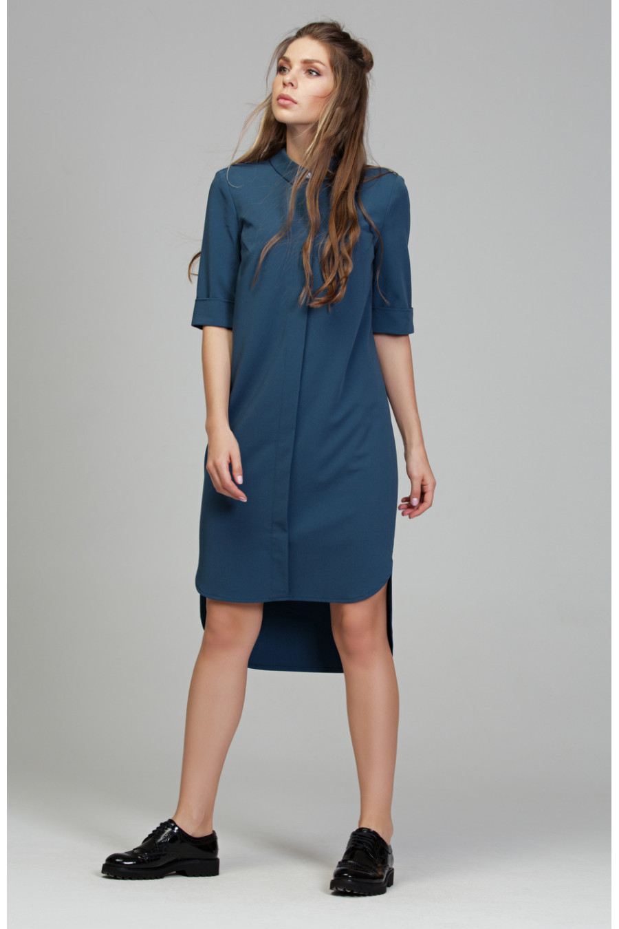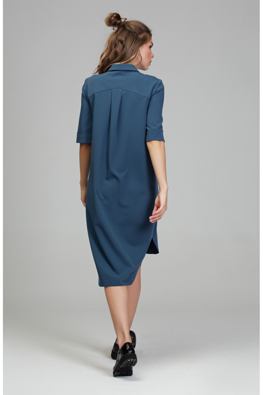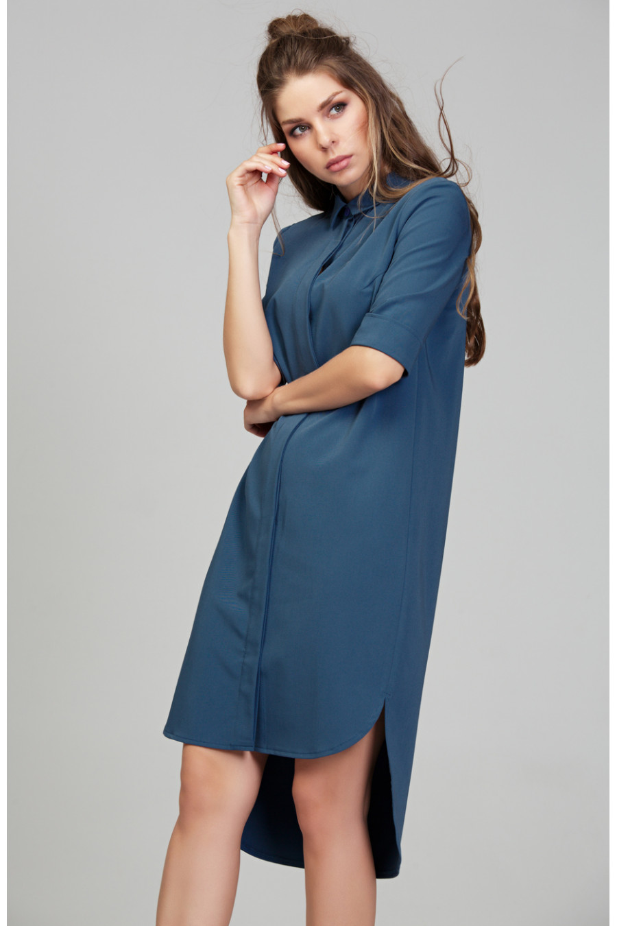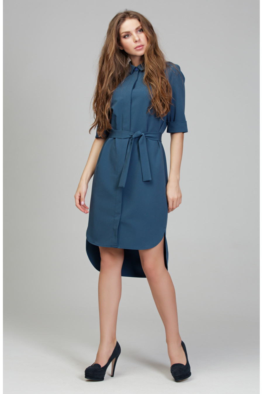 Платье-рубашка из приятной ткани «гальяно». Платье прямого силуэта в комплекте с поясом. На полочке потайная застежка на пуговицы. Низ ассиметричный, сзади длиннее. Воротник отложной со стойкой. На спинке кокетка и небольшая бантовая складка. Рукав втачной длинной до локтя, низ оформлен манжетой.