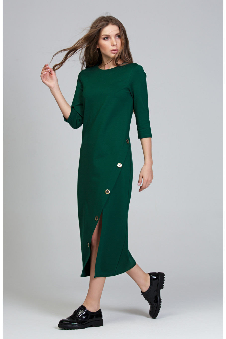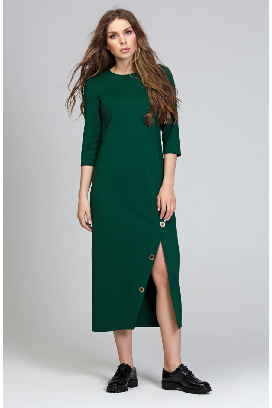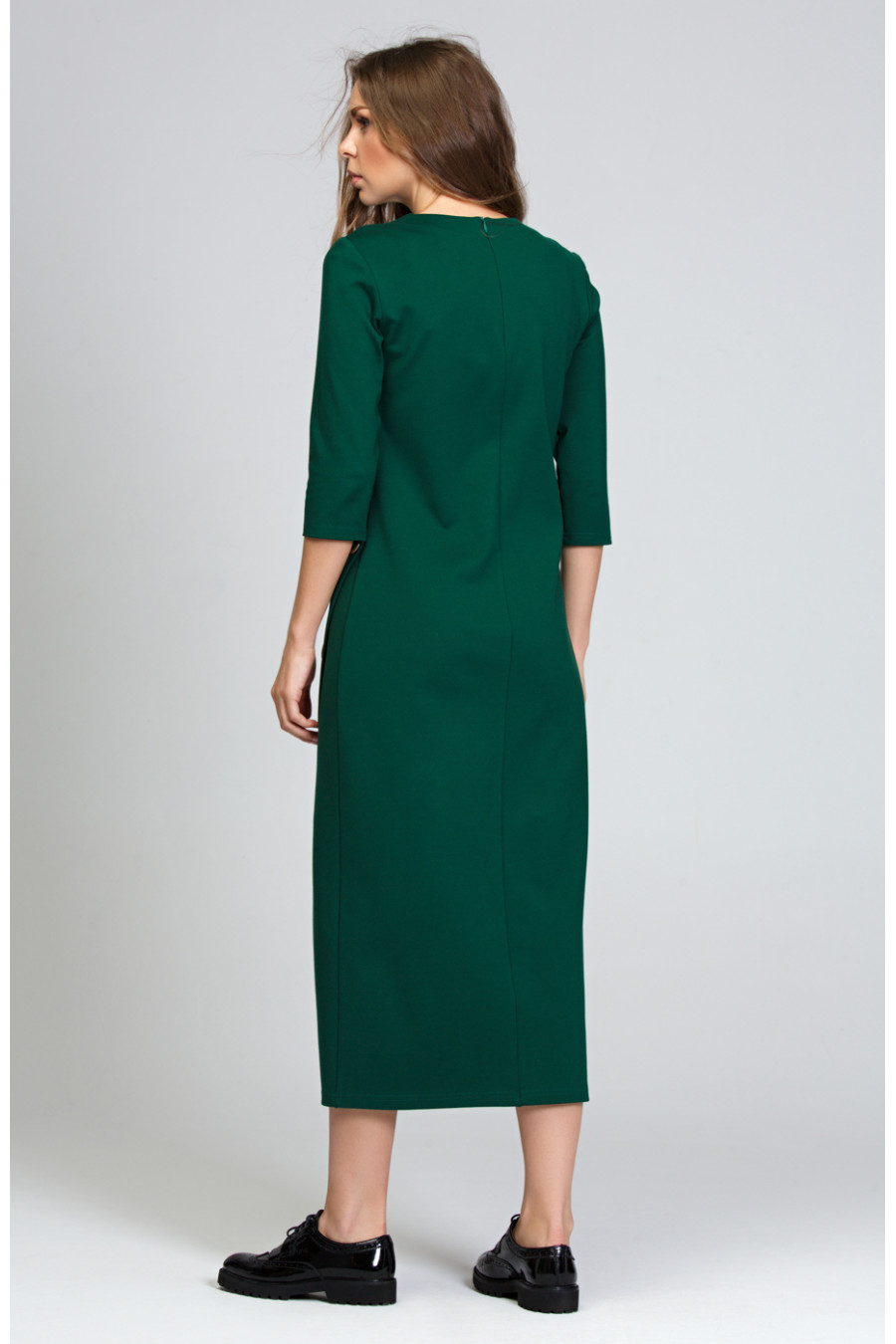 Платье прямого силуэта выполнено из искусственной замши. На спинке средний шов, шлица и углубленный вырез. Рукав узкий до локтя. На спинке и полочке расположены декоративные горизонтальные подрезы, для большей выразительности вдоль швов проходит отстрочка. Фактура ткани – «под замшу», придает модели брутальности и актуальности в этом сезоне.