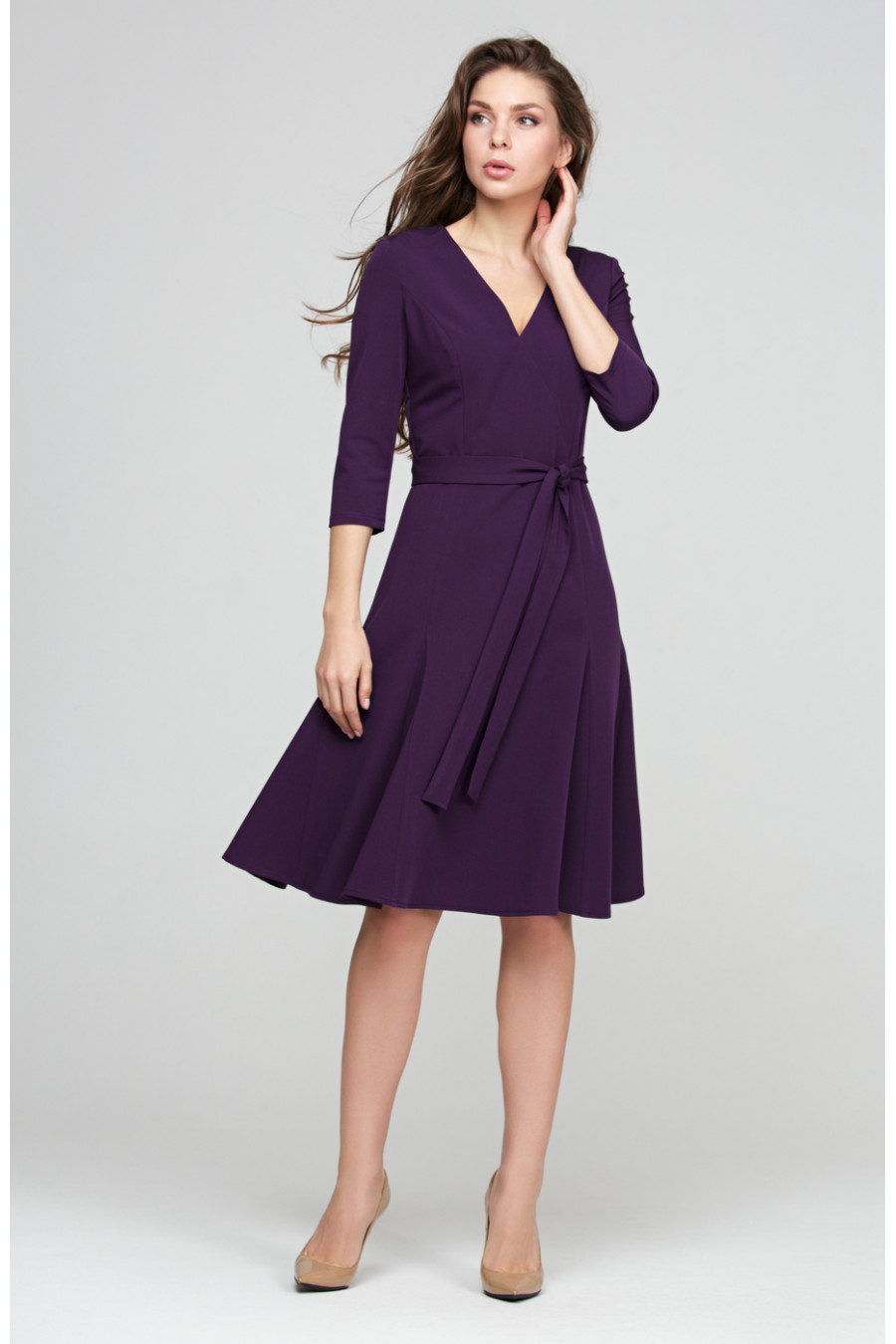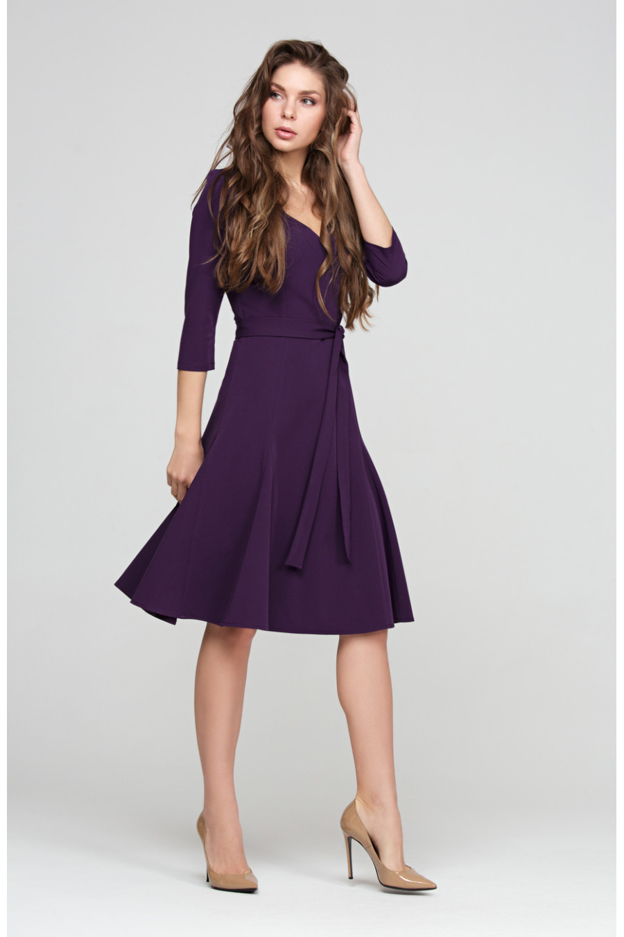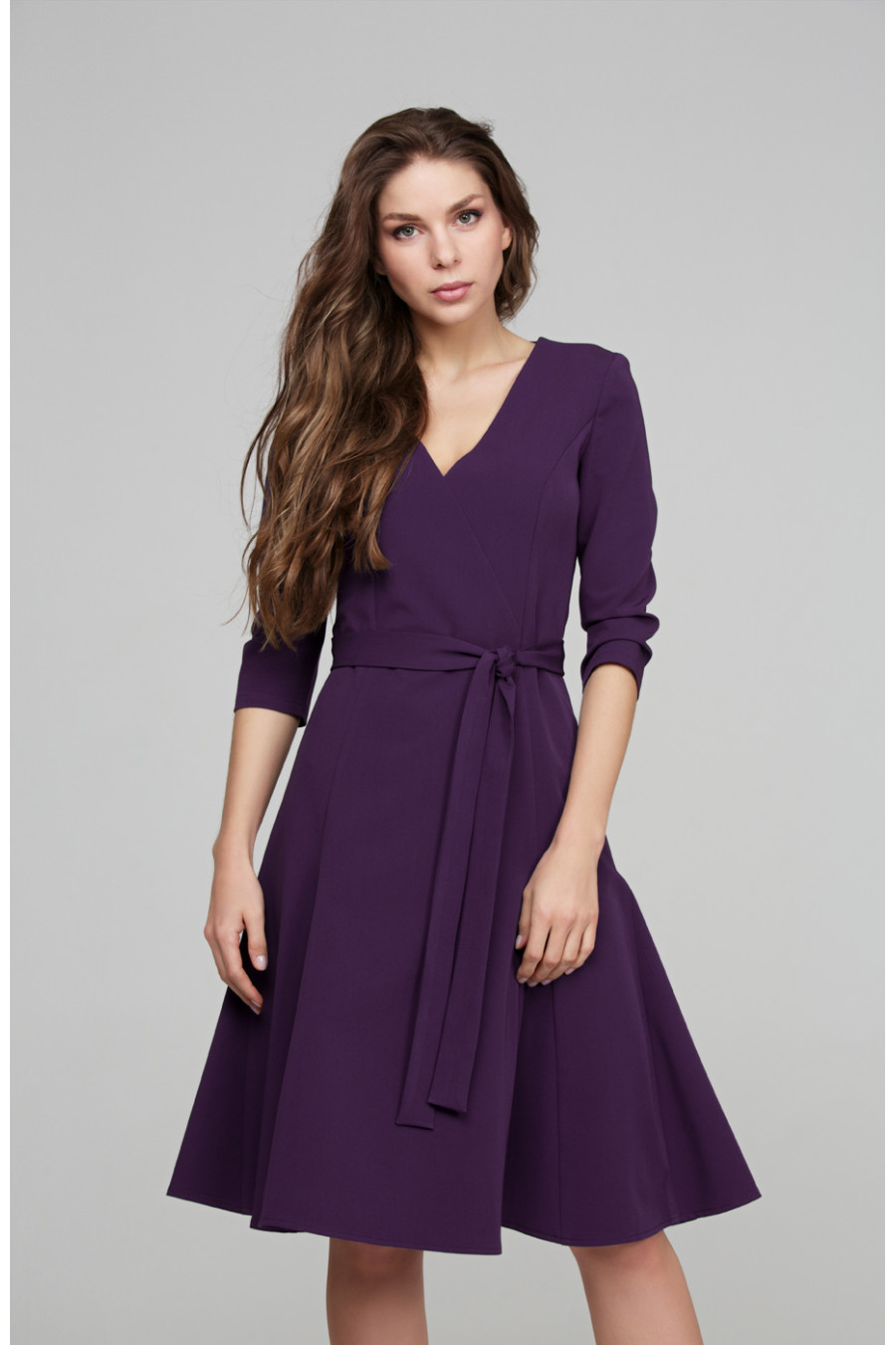 Романтичное платье выполнено из ткани «гальяно». На спинке средний шов и застежка на потайную молнию. Рукав узкий длинной 3/4. Лиф платья выполнен назапах, благодаря чему образуется глубокий V-образный вырез декольте. Юбка платье имеет форму «годе». Платье дополнено поясом из той же ткани.
