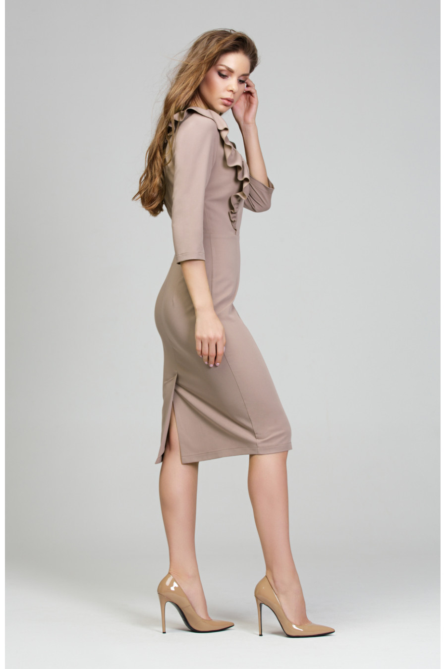Платье «футляр» выполнено из приятной костюмной такни «гальяно». Платье отрезное по линии талии. На спинке в среднем шве застежка на потайную молнию и шлица. На полочке рельевы и декоративные воланы в них. Вырез горловины круглый не глубокий. Рукав втачной, длинной 3/4.