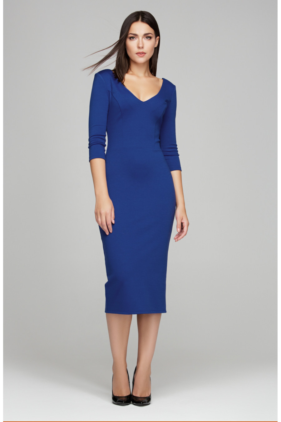 Платье «миди» выполнено из плотного трикотажа «алези». Платье отрезное по линии талии. В среднем шве спинке и застежка на потайную молнию и шлица. Благодаря рельефам на спинке и на полочке, платье отлично сидит на фигуре. Рукав узкий длинной 3/4. На полочке и спинке глубокий V-образный вырез горловины.