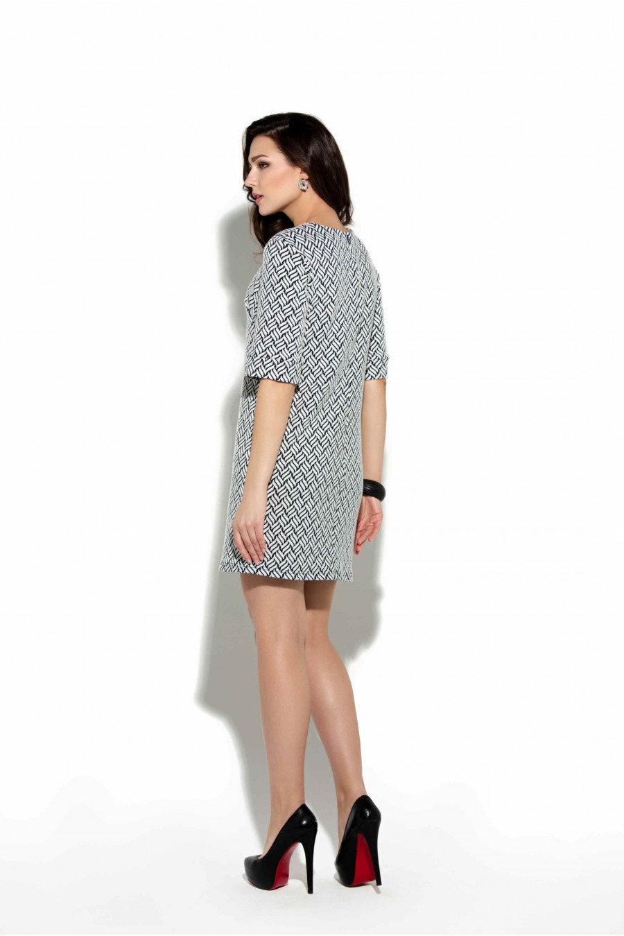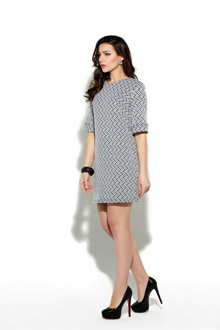 Коктейльное платье прямого силуэта из плотного фактурированного трикотажа с геометрическим рисунком. Не глубокий круглый вырез горловины обработан обтачкой. Широкий втачной рукав до локтя обработан манжетой. На полочке расположены две длинные диагональные вытачки, направленные из боковых швов. В среднем шве спинки - потайная молния. Конструктивно простое платье, выполненное из ткани модного черно-белого орнамента «елочка», несомненно, является трендом сезона.