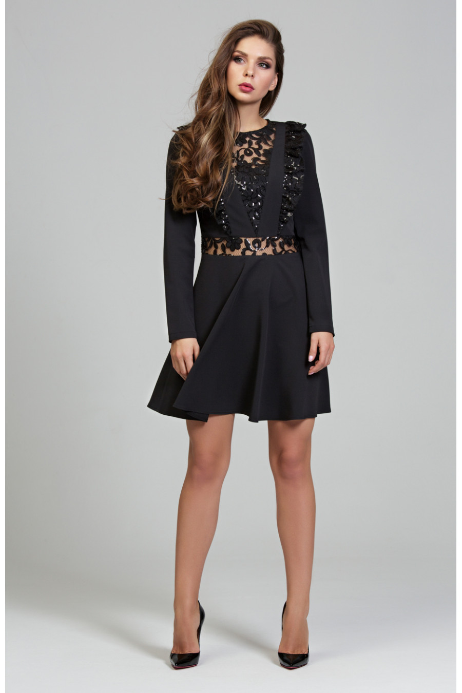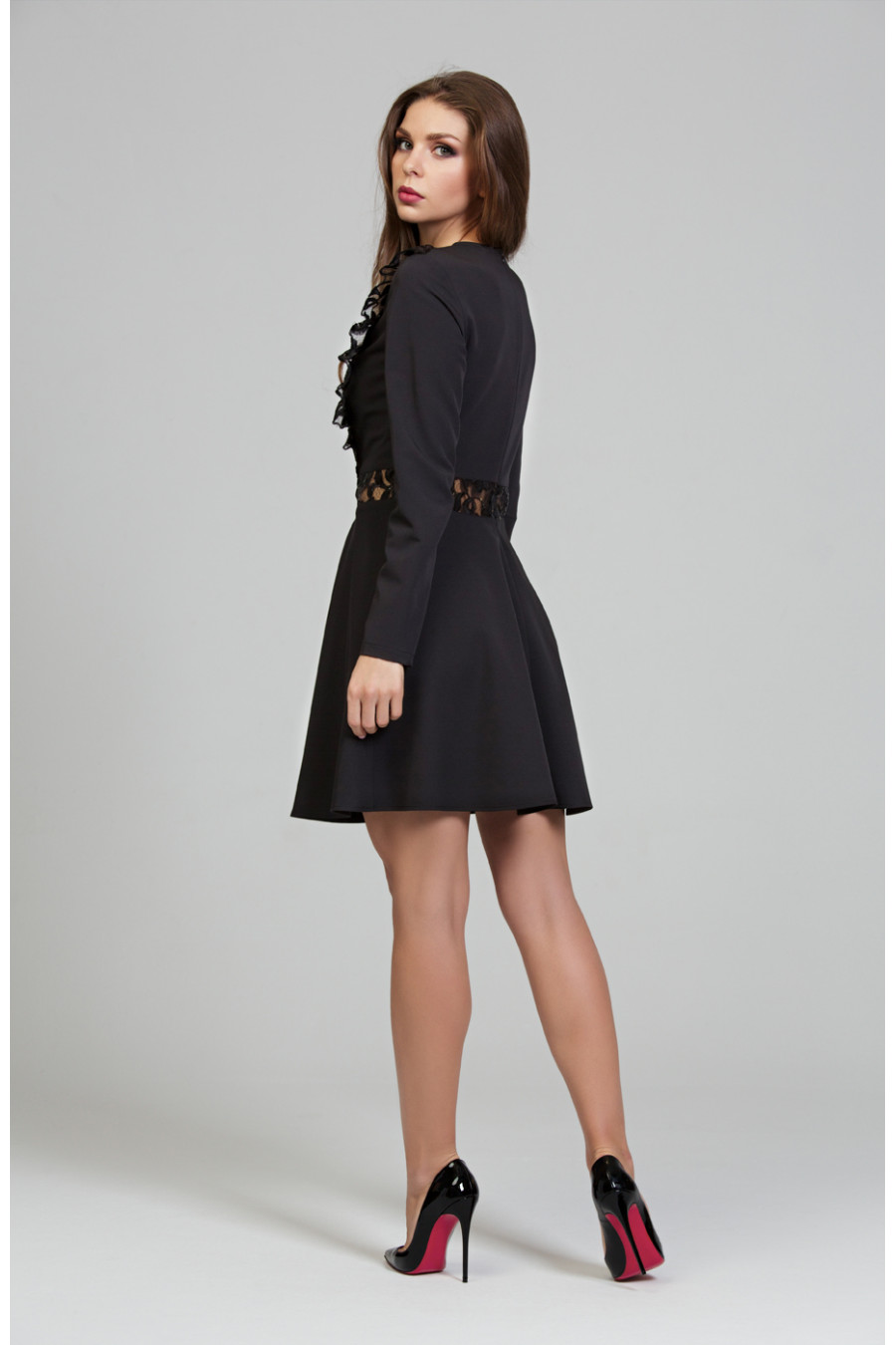 Нарядное платье из приятной костюмной ткани «гальяно». Платье отрезное по линии талии. На спинке в среднем шве застежка на потайную молнию. На полочке рельевы и декоративные воланы в них. Также на полочке и по линии талии введены вставки из нарядного кружева с пайетками. Вырез горловины круглый не глубокий. Юбка платья имеет форму «полусолнце». Рукав втачной длинный.