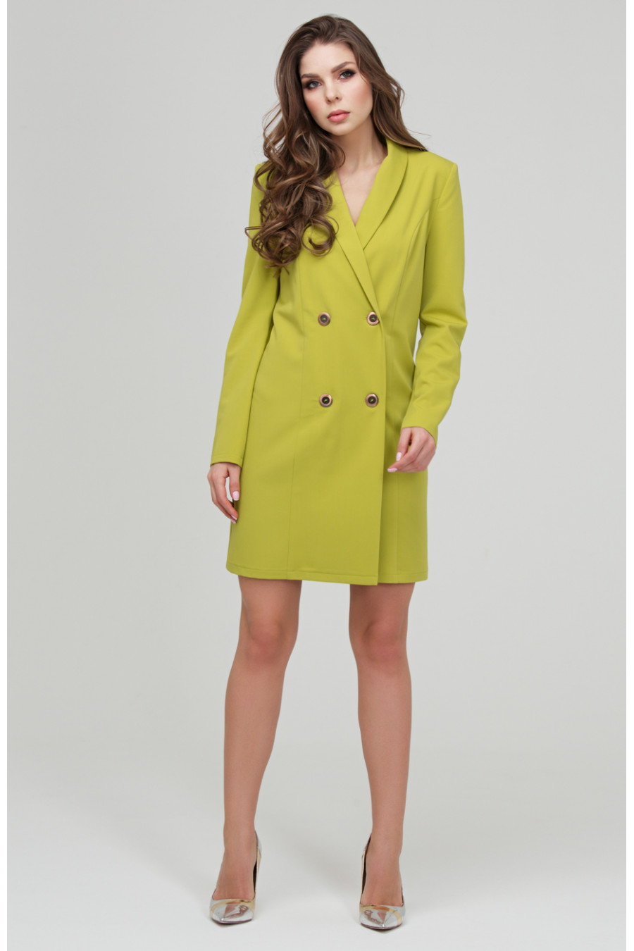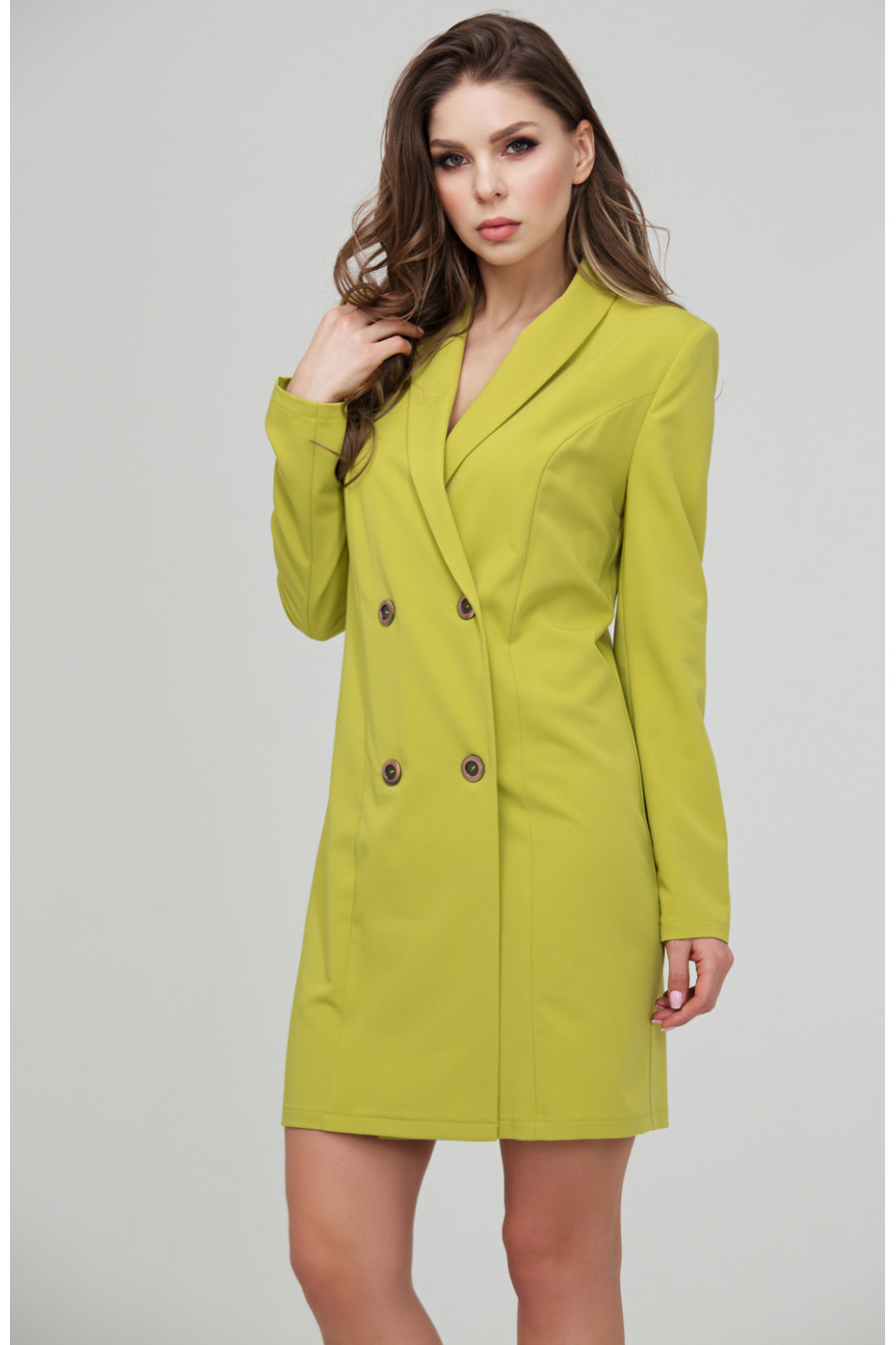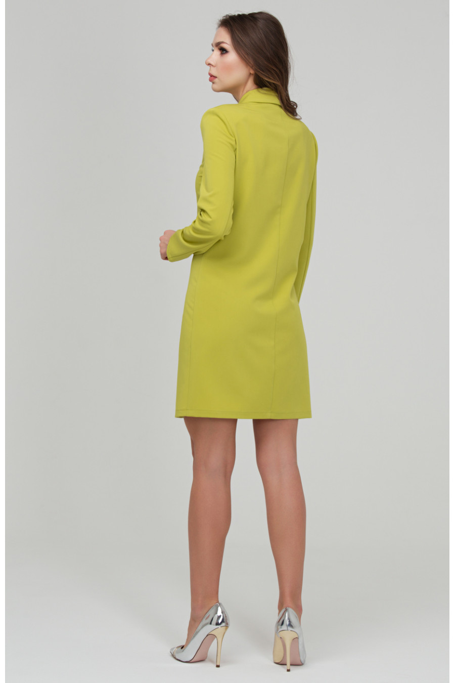Элегантное двубортное платье длиной «мини». Данная модель выполнена из приятной костюмной ткани «гальяно». На полочке введены рельефы. Спинка со средним швом. Горловина платья оформлена воротником «шалька». Платье двубортное с застежкой на металлические пуговицы. Рукав втачной длинный.