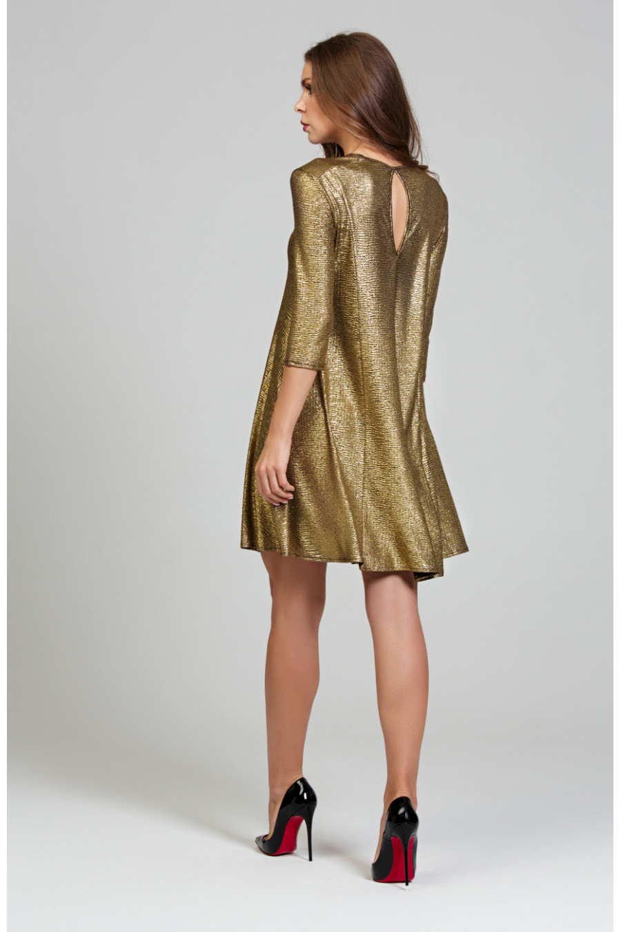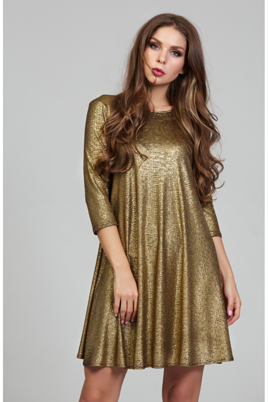 Нарядное платье из превосходного золотого трикотажа. Свободный, расклешенный силуэт платья, достигнут благодаря конструктивным линиям. Горловина и вырез «капля» в среднем шве платья обработаны тонким кантом. Рукав втачной длинной ¾. В плечевом шве на полочке и спинке кокетка.