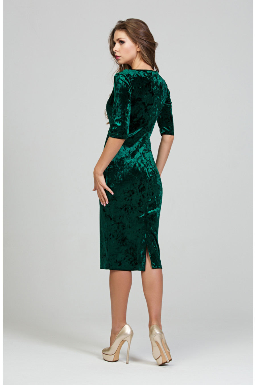 Элегантное платье-«футляр» из великолепного бархата. Глубокий вырез горловины придает модели женственность и сексуальность. На полочке нагрудная вытачка, что позволяет отлично посадить платье на фигуру. Рукав длинной ¾ втачной. На спинке в среднем шве – шлица.
