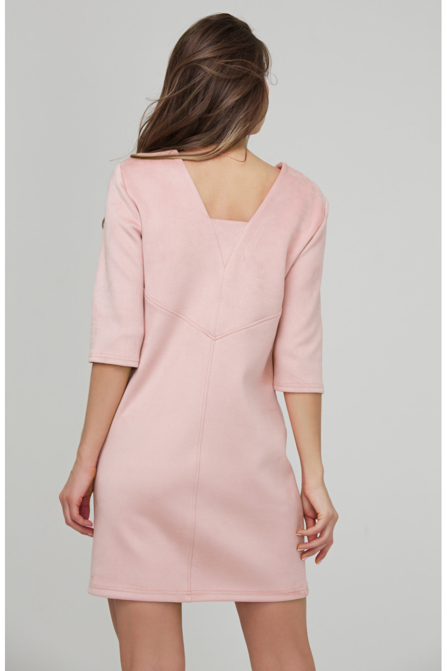 Платье прямого силуэта выполнено из искусственной замши. На спинке средний шов и углубленный вырез. Рукав узкий до локтя. На полочке расположен декоративные вертикальный шов. Для большей выразительности вдоль швов на платье проходит отстрочка. Фактура ткани – «под замшу», придает модели брутальности и актуальности в этом сезоне.