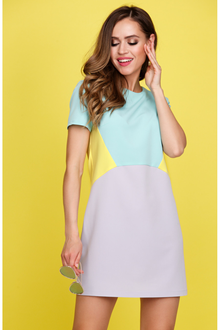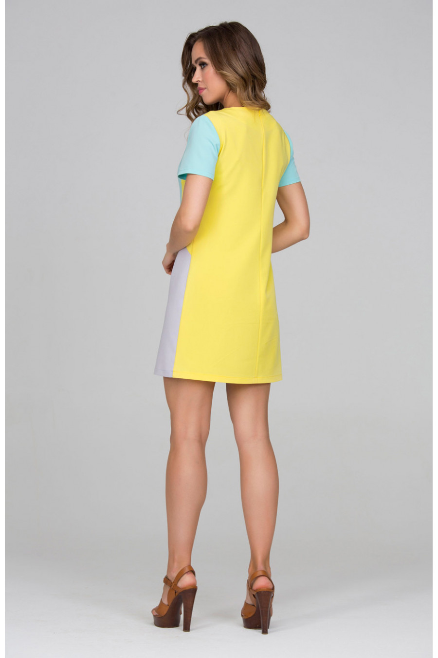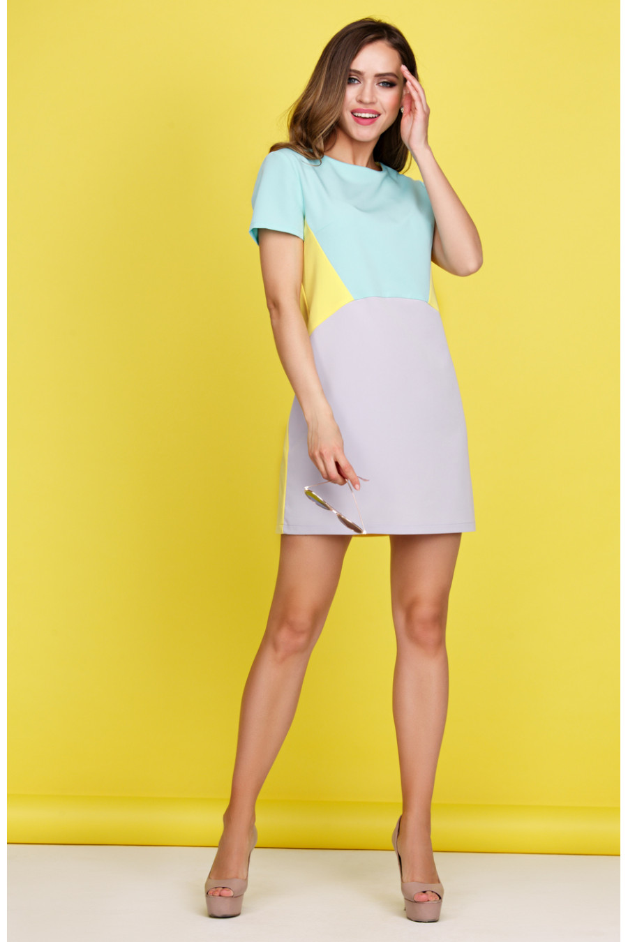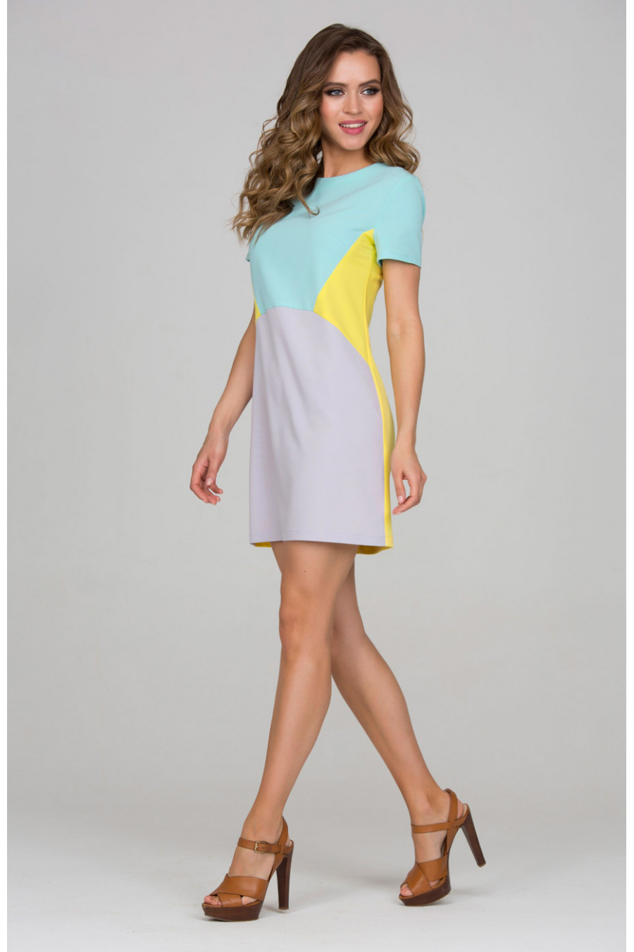 Коктейльное платье «мини» из приятной ткани «гальяно». Платье слегка приталенного силуэта, выполнено из комбинации трех цветов ткани. Вырез горловины не глубокий круглый. Рукав втачной выше локтя. В среднем шве спинке застежка на потайную молнию.