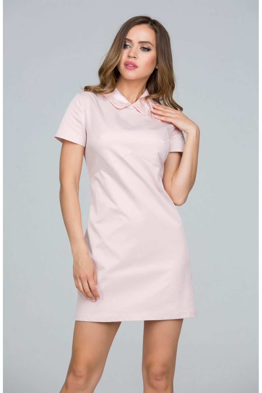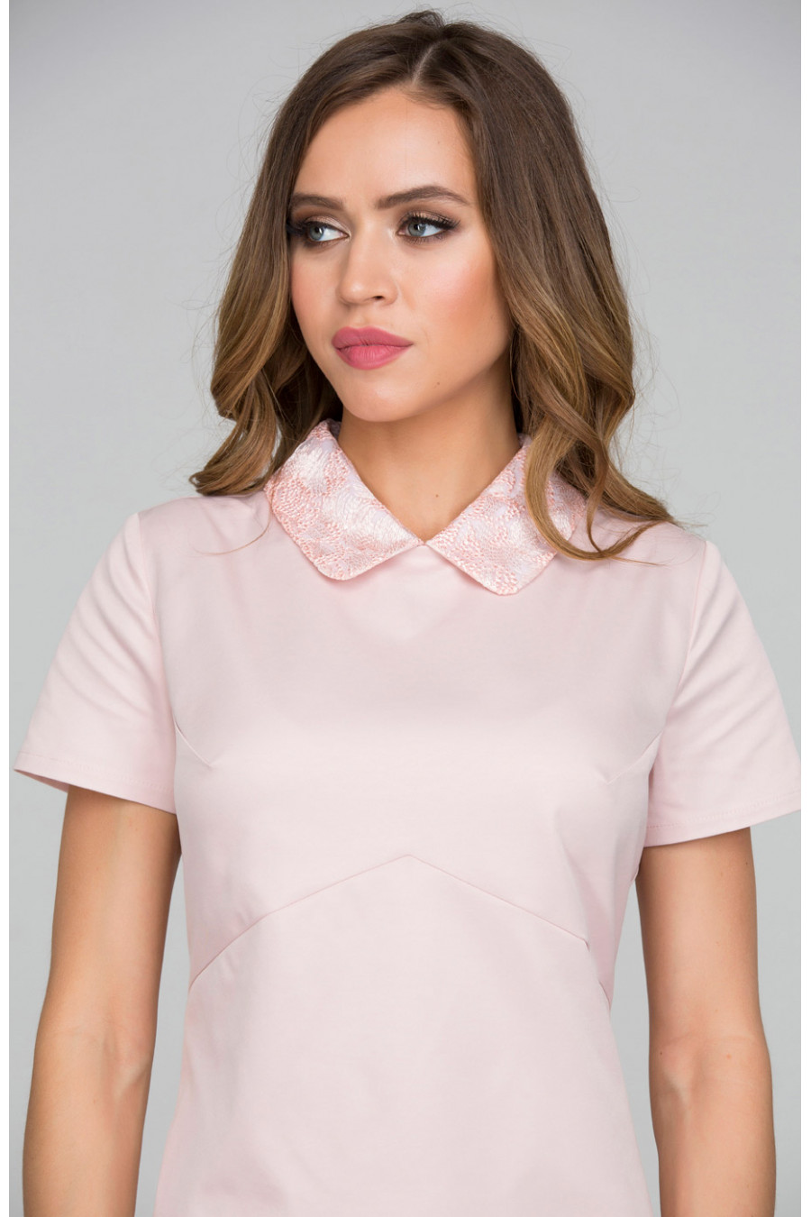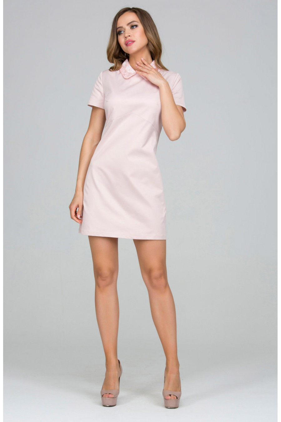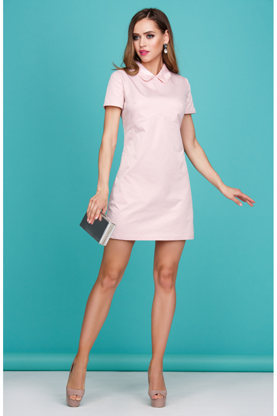Коктейльное платье «мини» выполнено из приятной плательной ткани. На спинке средний шов и застежка на потайную молнию. На полочке нагрудные вытачки и декоративный подрез. Рукав втачной короткий. Горловина обработана отложным воротничком декорированным кружевом.