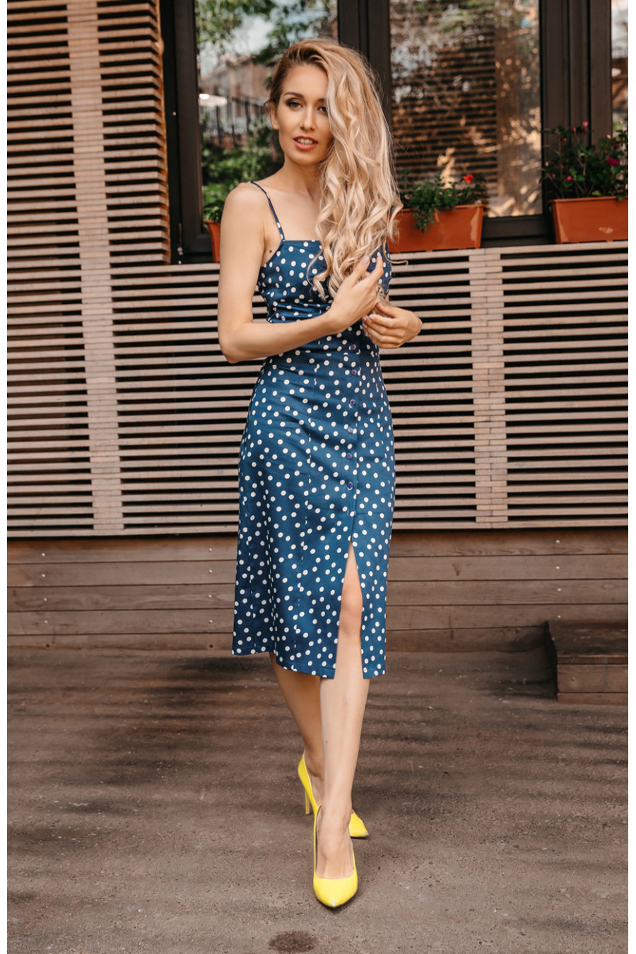 Платье футляр выполненное из хлопковой ткани с небольшим добавлением эластана. Лиф платья фиксируется на лямках с регуляторами. Платье прилегающего силуэта с рельефами на полочке и спинке, отрезное по линии талии. На полочке платья застегивается на пуговицы. Вырез декольте глубокий с открытыми плечами.