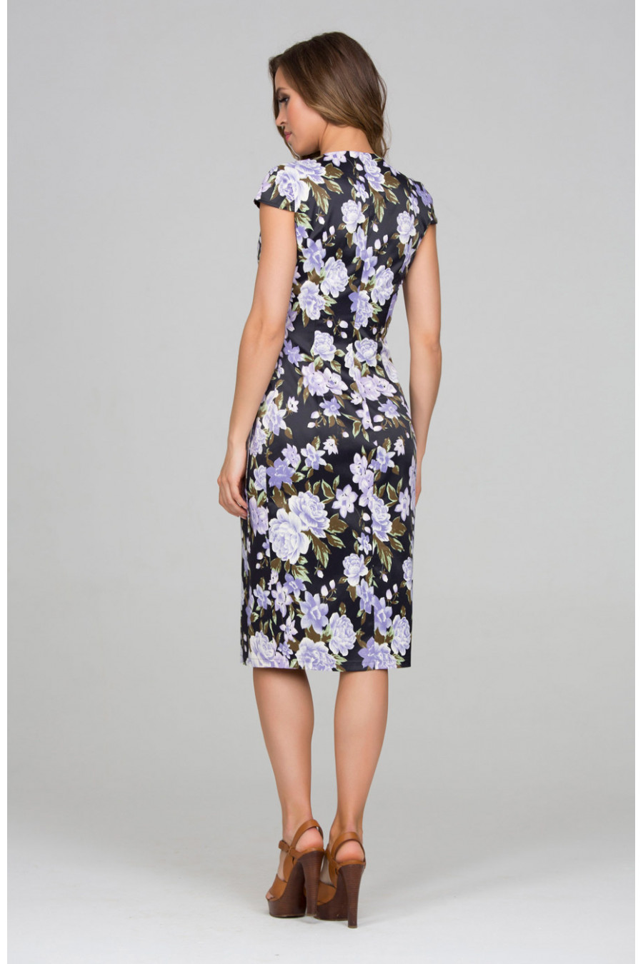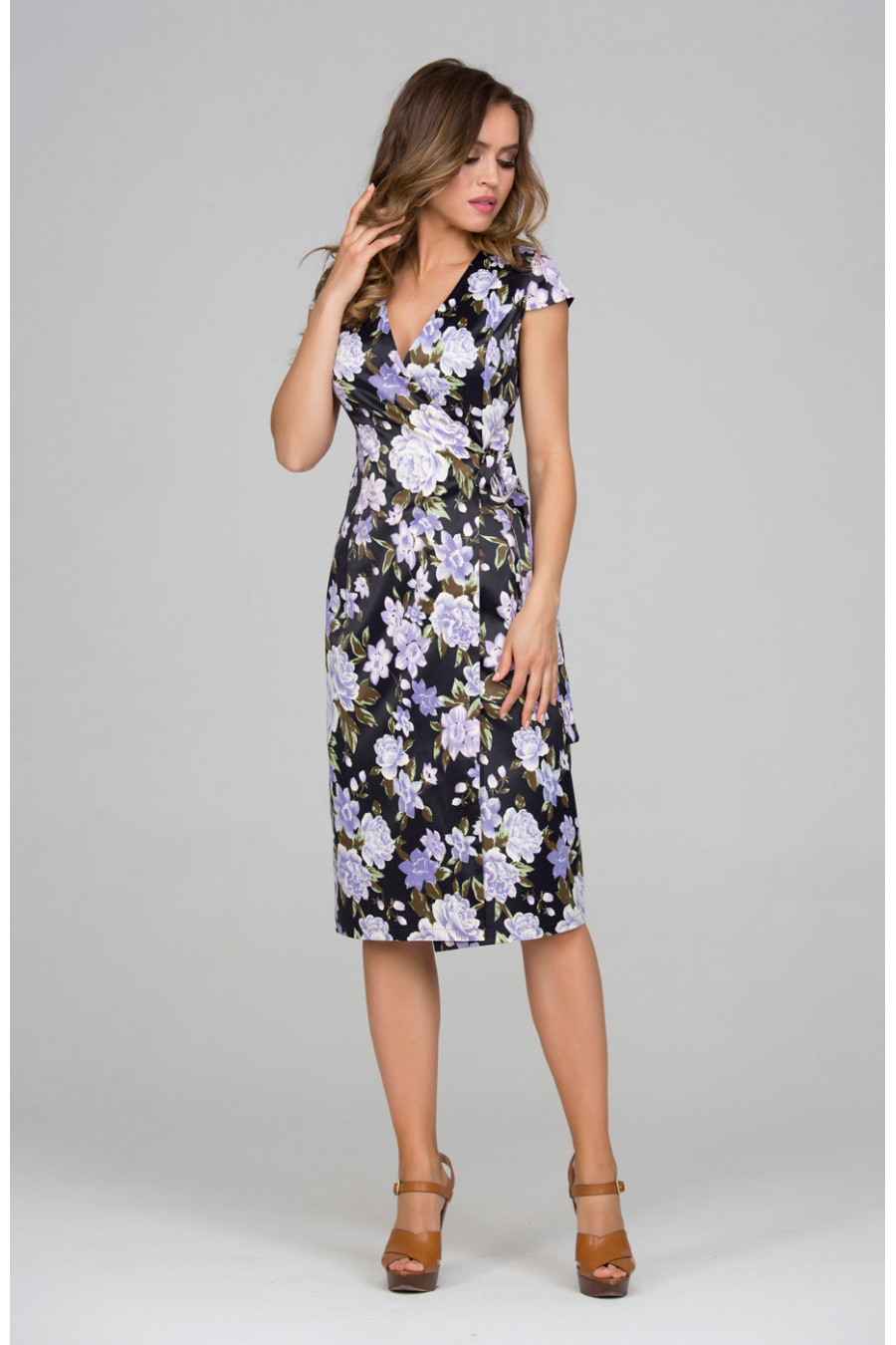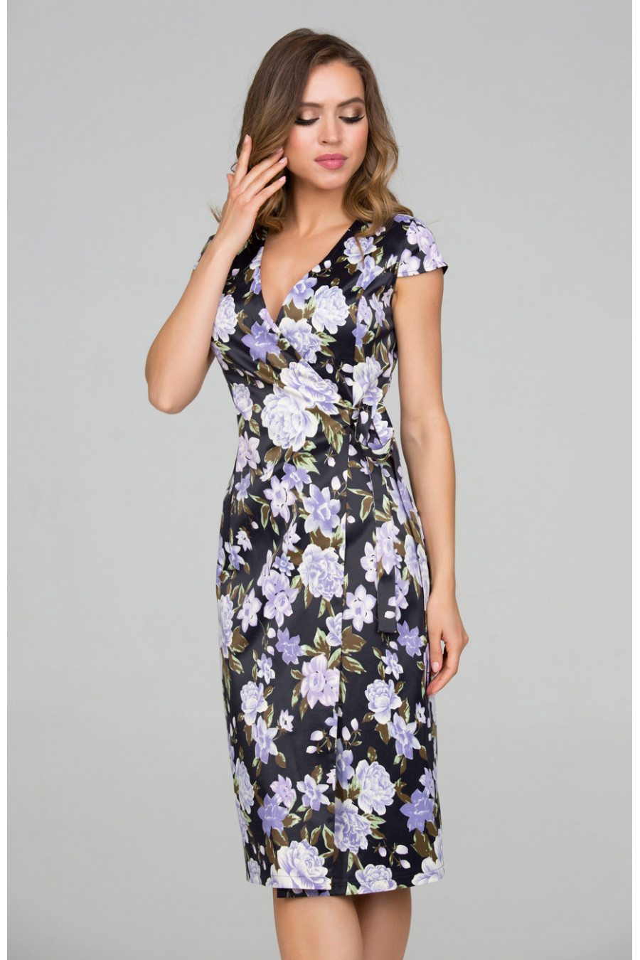 Платье прилегающего силуэта из атласной ткани с летним цветочным принтом. Лиф платья выполнен «назапах», благодаря чему образуется глубокий V-образный вырез декольте. На полочке платья введены рельефы,на спинке талиевые вытачки.