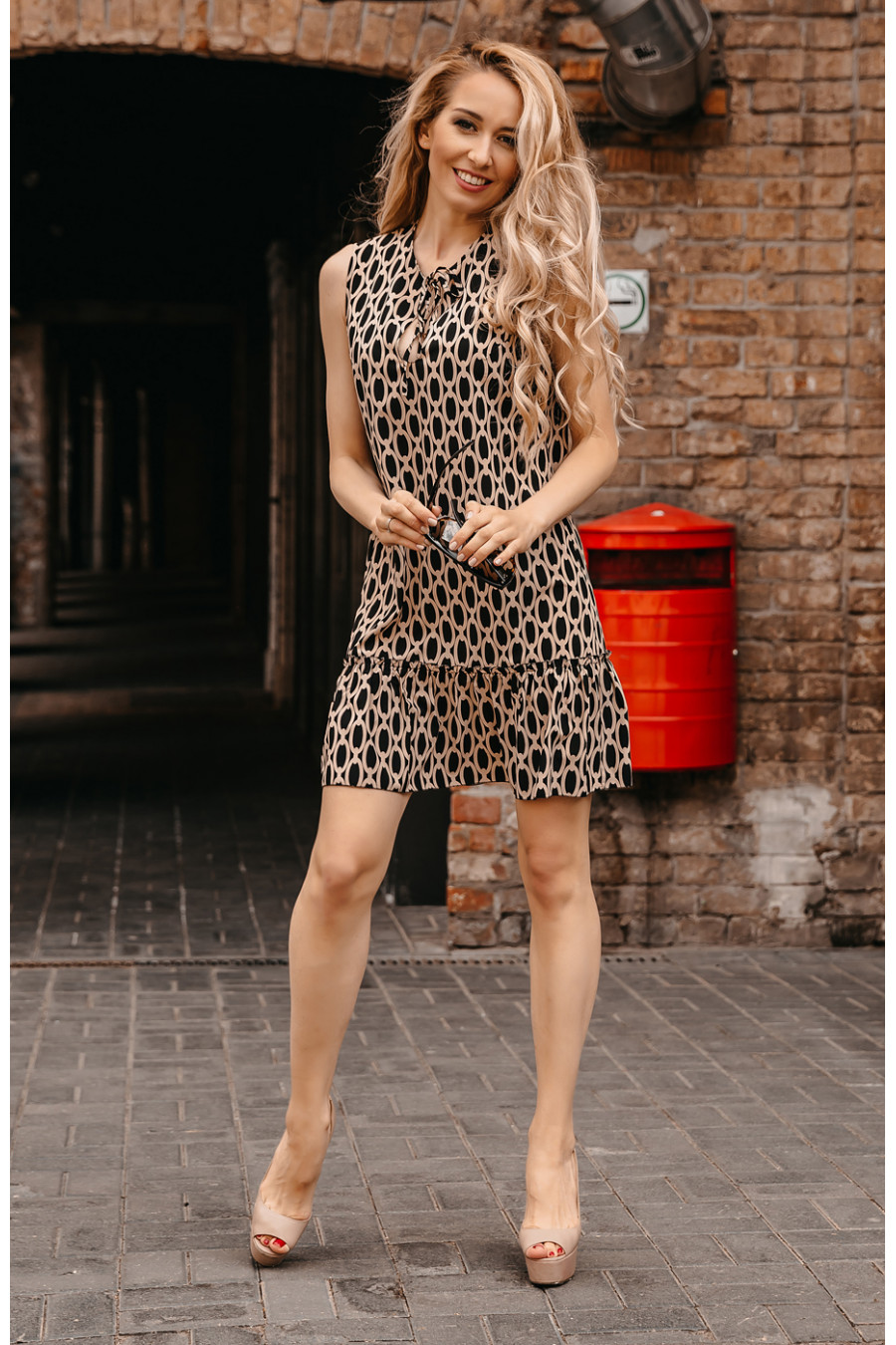 Коктейльное платье прямого силуэта с воланом по низу. На полочке вырез «капля» и завязка на бант. На полочке и спинке введены нагрудные вытачки. Вырез горловины круглый не глубокий.
