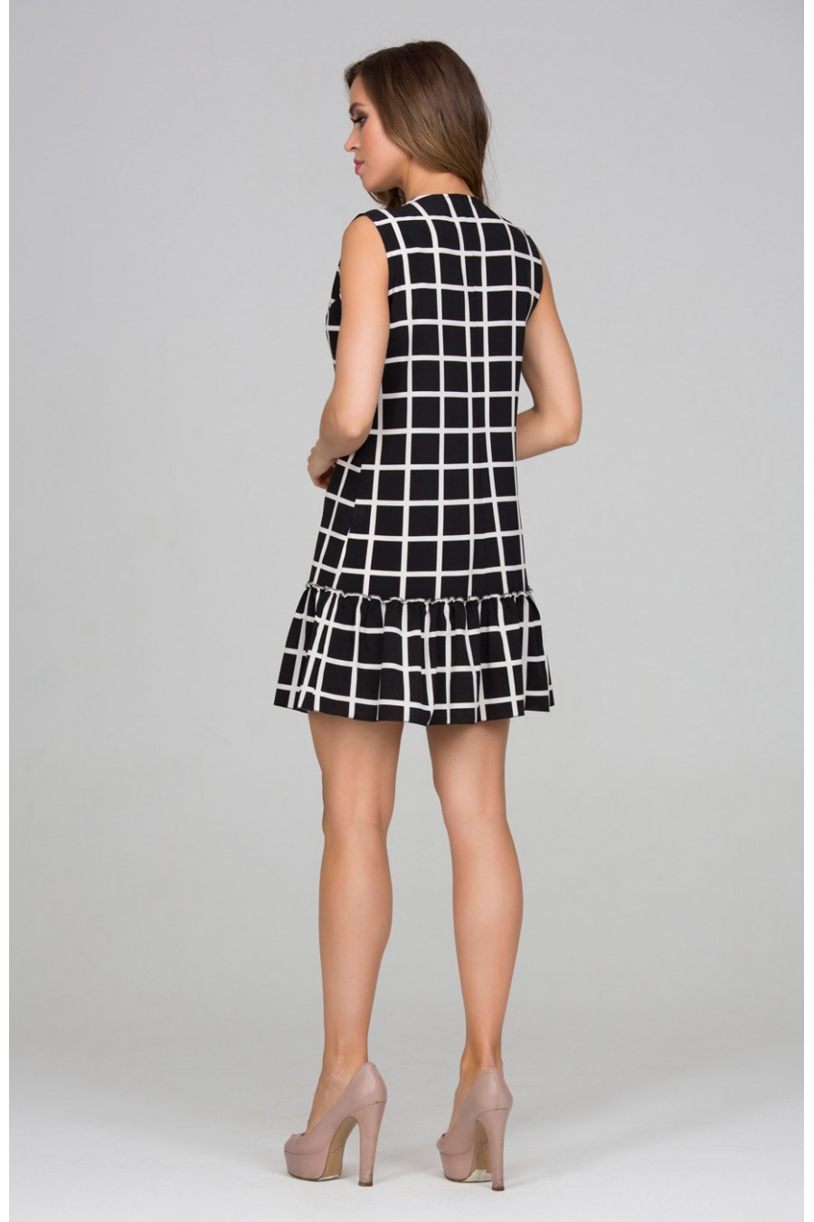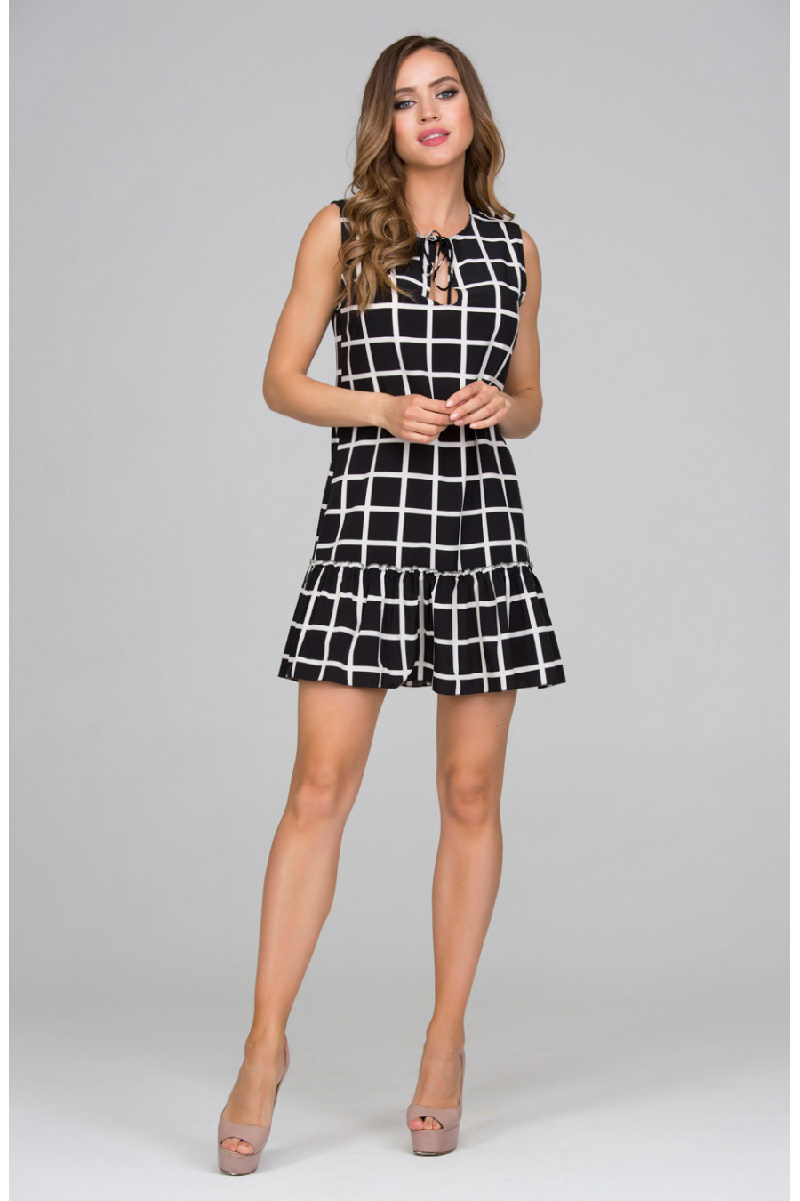 Коктейльное платье прямого силуэта с воланом по низу. На полочке вырез «капля» и завязка на бант. На полочке и спинке введены нагрудные вытачки. Вырез горловины круглый не глубокий.