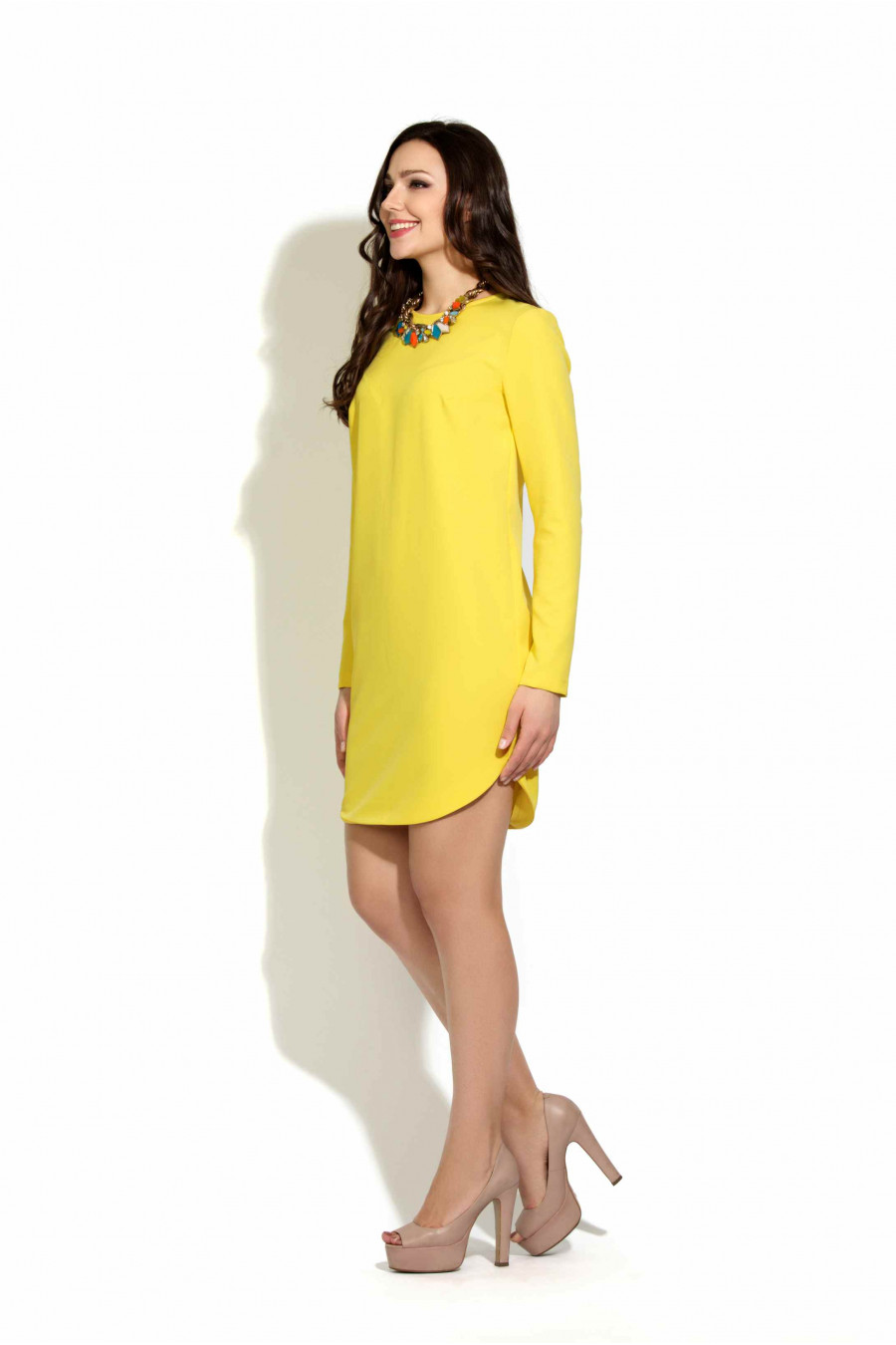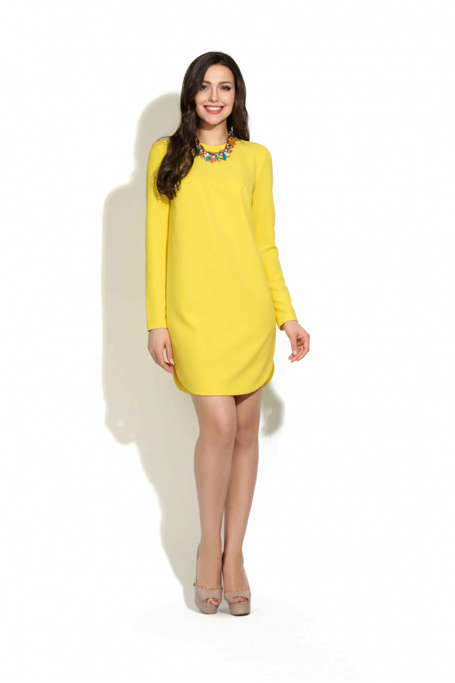 Коктейльное платье из легкой костюмной ткани. Платье прямого силуэта. На полочке нагрудные вытачки. Горловина круглая не глубокая, обработанная узкой бейкой. Рукав втачной длиный с локтевой вытачкой. На спинке средний шов и потайная застежка на молнию. Низ платья фигурный – овальный, обработанный подкройной обтачкой.