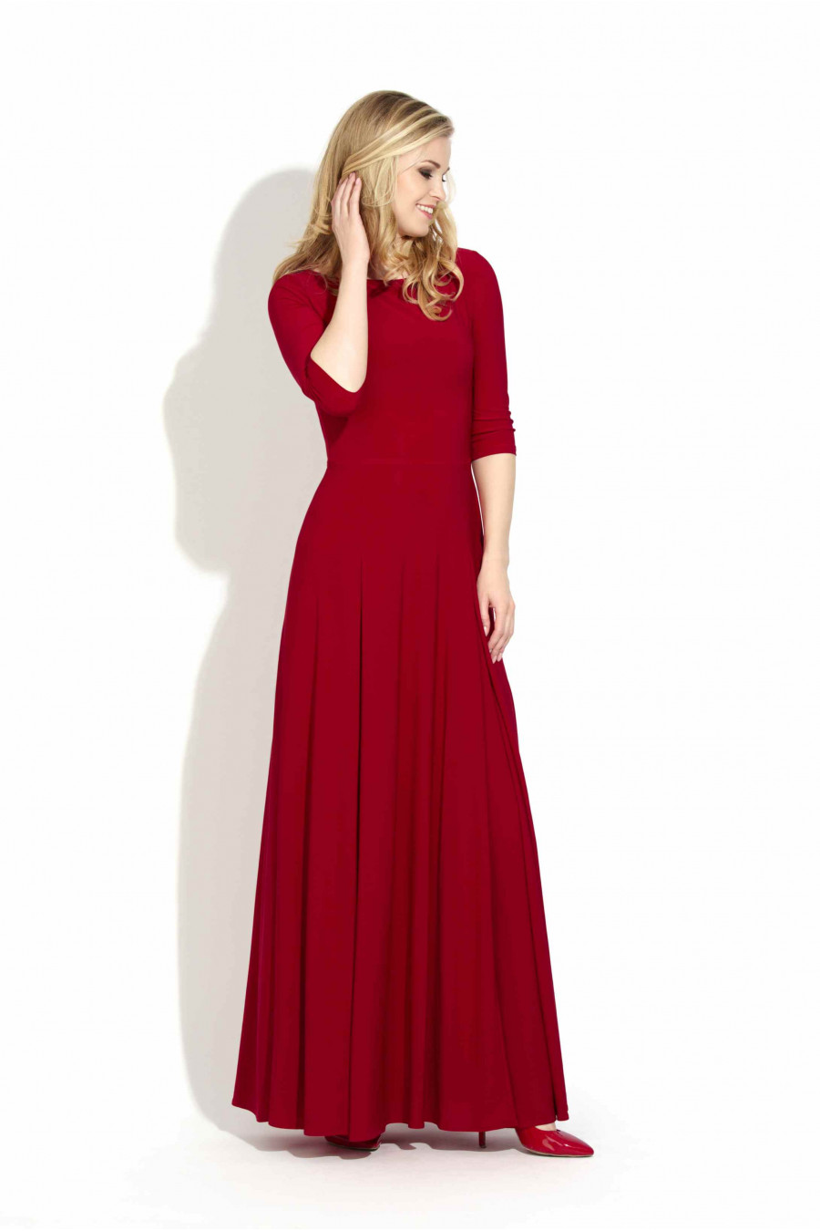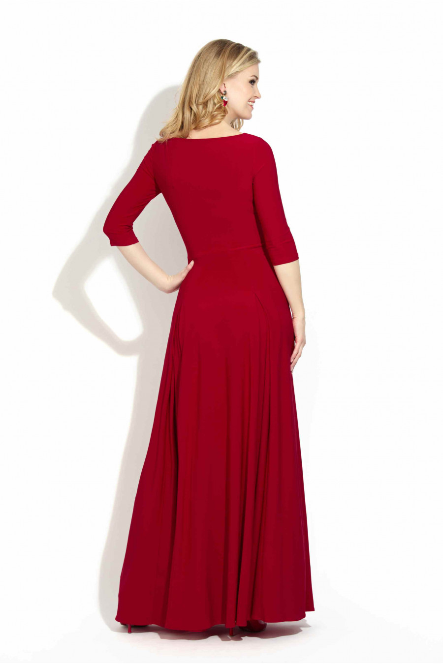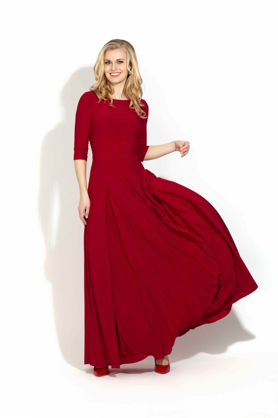 Эффектное платье длиной в пол из тонкого мягкого трикотажа «масло». Платье отрезное по линии талии. Лиф платья выполнен из двойного слоя трикотажа, что скрывает пролегание нижнего белья. Юбка представляет собой шестиклинную основу, клинья которой сильно расклешены к низу, а между клиньев на полочке и спинке вшиты конусные вставки, что дополнительно увеличивает ширину юбки по низу. Рукав втачной длинной 3/4. Вырез горловины – не глубокий «лодочка», что придает модели женственности и сексуальности.