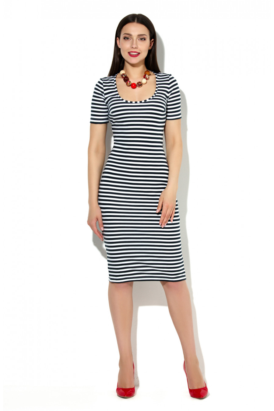 Платье-футляр из хлопковой трикотажной ткани с принтом «тельняшка». Прилегающий силуэт платья, достигнут благодаря боковым швам и нагрудной вытачки. Рукав выше линии локтя втачной. Несомненно, данная модель придаст яркости, элегантности и актуальности Вашему образу.