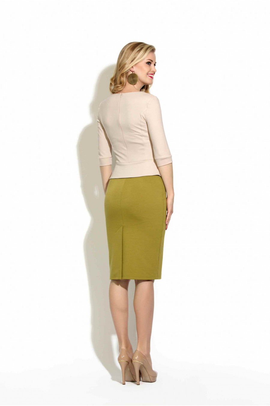 Платье-футляр прилегающего силуэта из трикотажа «джерси». Платье отрезное по линии талии, с узкой баской. Эффектность платью придают конструктивные линии и сочетание разных по цвету тканей, благодаря которым создается впечатление, что на платье надет жакет. Для придания приталенного силуэта в лиф платья введены фигурные рельефы, а так же вытачки на заднем полотнище юбки. В среднем шве спинки потайная молния и шлица. Рукав с манжетой чуть выше локтя. Силуэт юбки «карандаш».