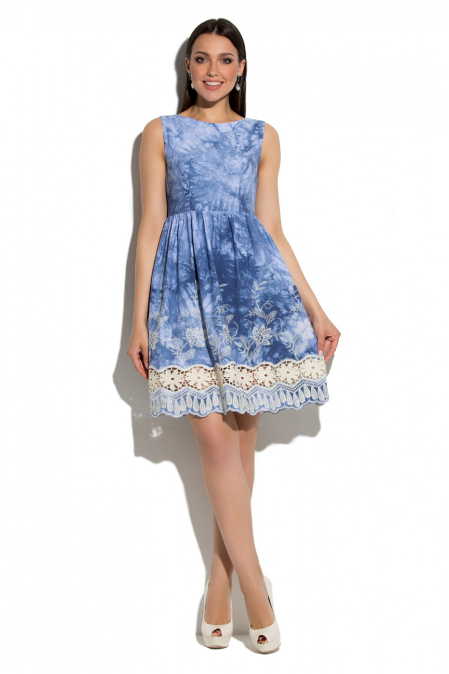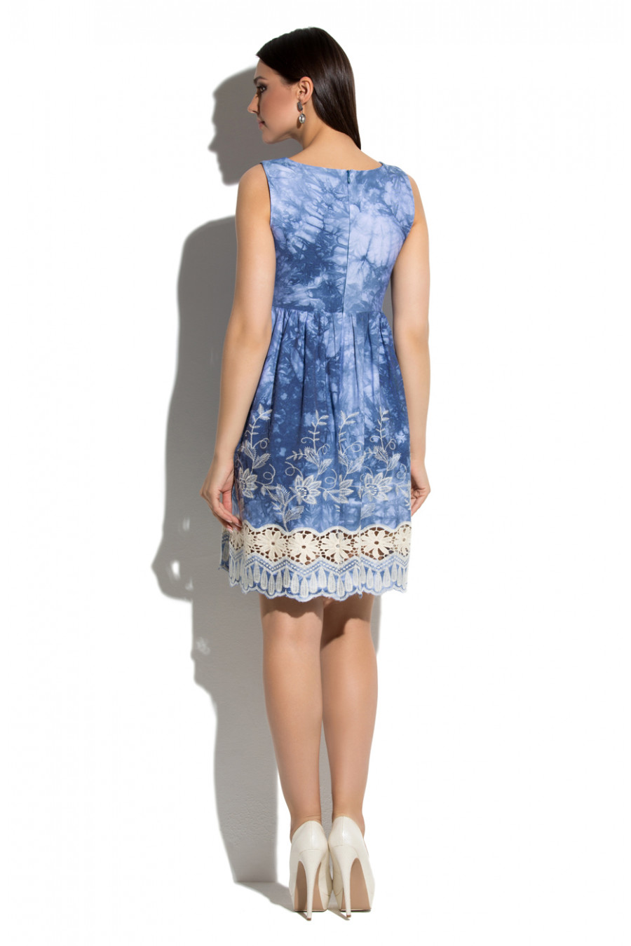 Коктейльное платье из тонкой джинсовой ткани с кружевом. Платье отрезное, немного выше линии талии. Юбка выше колена с густой сборкой на линии соединения с лифом. На полочке для идеальной посадки изделия по фигуре введены рельефы. В среднем шве спинки потайная молния. Вырез горловины круглый. Отделочным элементом является кружево по низу платья.