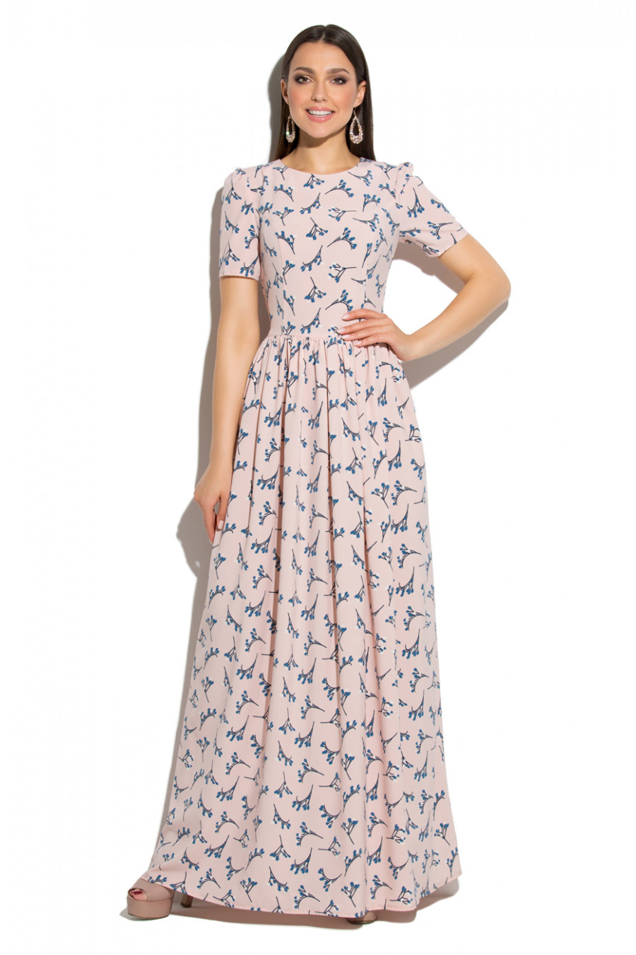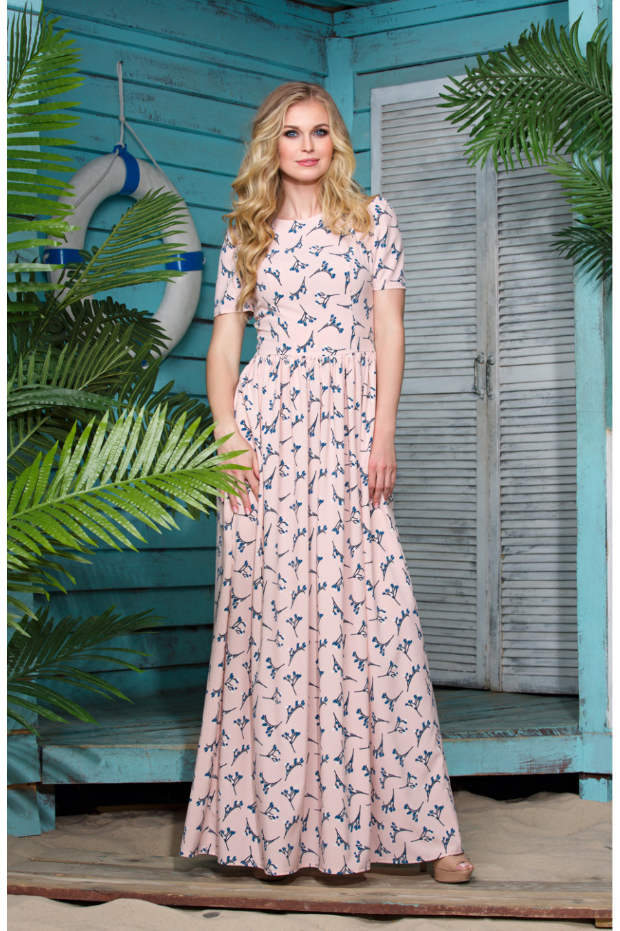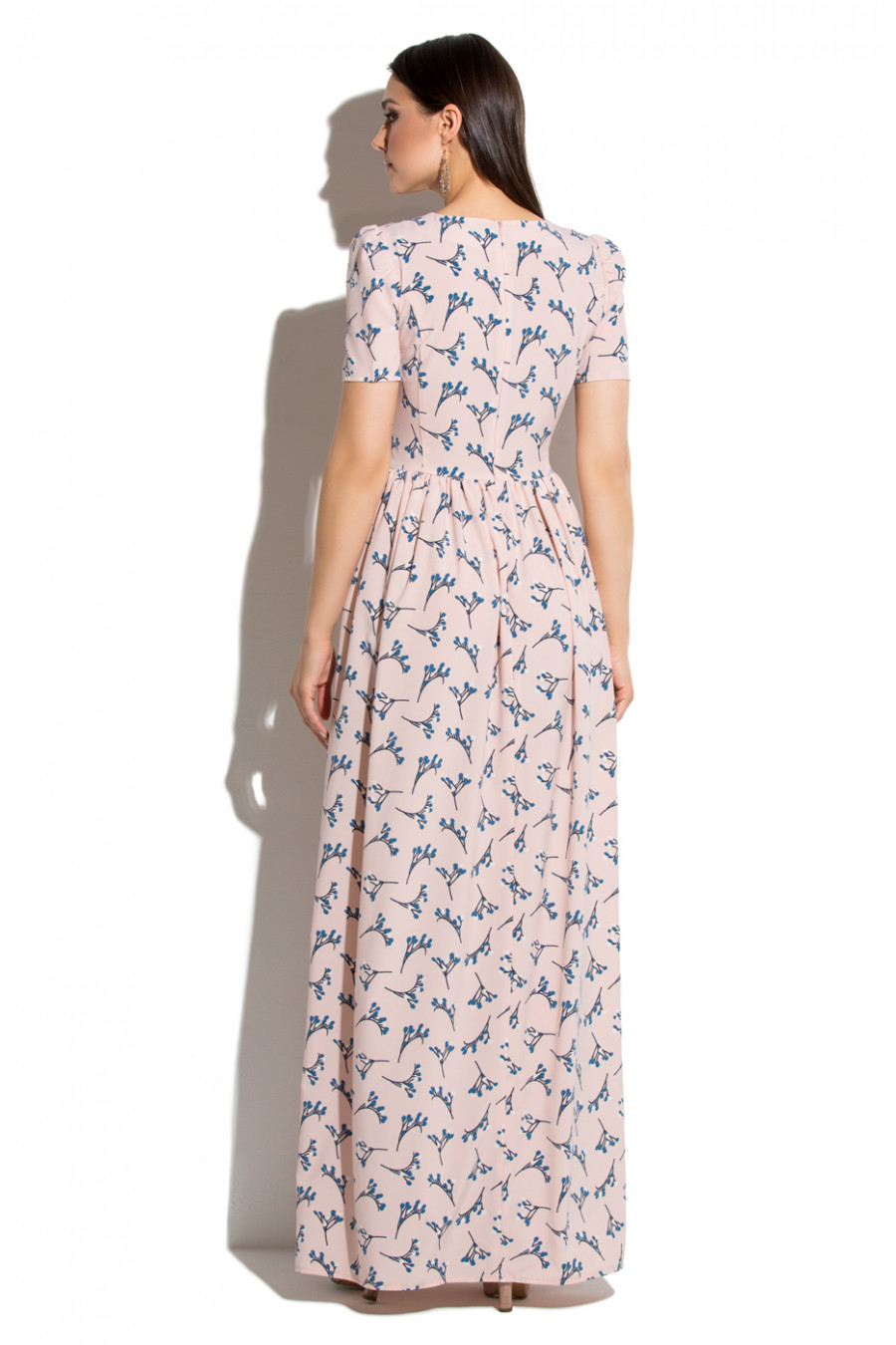 Платье в пол из легкой плательной ткани. Платье отрезное по линии талии. Длинная юбка платья имеет сильное расклешение к низу, а также сборку по линии талии. Благодаря такому крою, платье эффектно струится при ходьбе. На спинке и полочке, для лучшей посадки изделия по фигуре, введены рельефы, в среднем шве спинки потайная молния. Вырез горловины круглый, обработан обтачкой. Рукав короткий-фонарик.