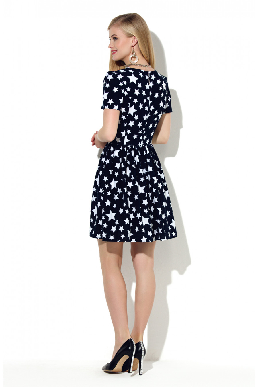 Коктейльное платье из ткани штапель с модным принтом «звезды». Платье отрезное по линии талии. Юбка выше колена с густой сборкой по линии талии. На спинке и полочке, для лучшей посадки изделия по фигуре введены рельефы, в среднем шве спинки потайная молния. Вырез горловины круглый - обработан обтачкой. Рукав короткий-фонарик. Материал из которого выполнено платье штапель - это ткань изготавливаемая из хлопка и вискозы. Ткань штапель гигроскопична, тело в такой ткани дышит и дарит ощущение прохлады.