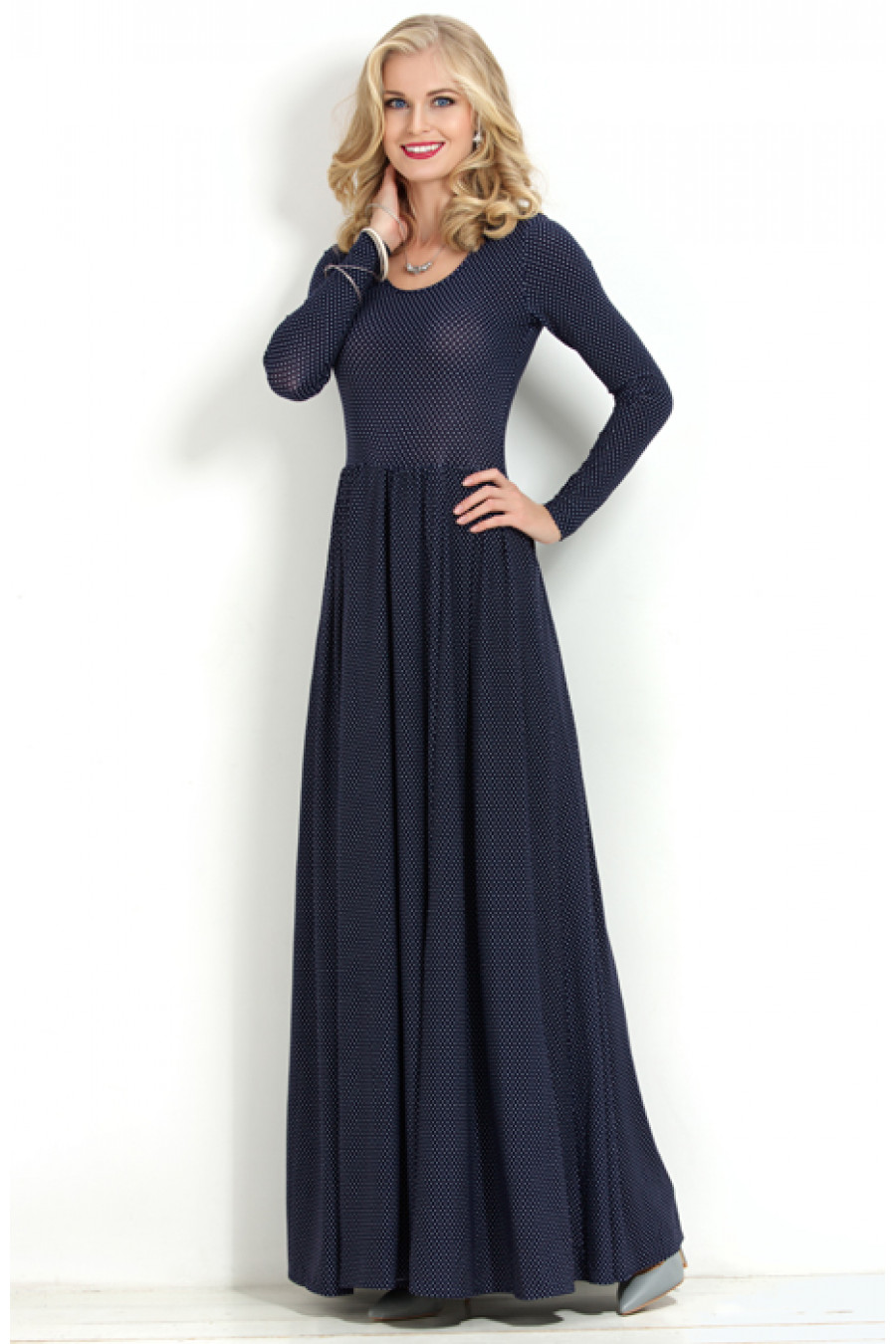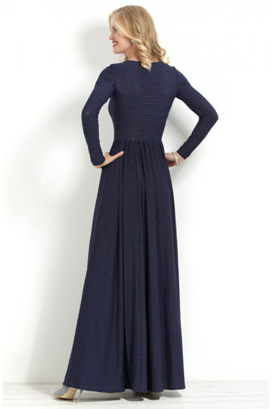 Шикарное длинное платье в пол из трикотажа. Платье отрезное по линии талии. Длинная юбка платья имеет сильное расклешение к низу, и сборку по линии талии, благодаря такому крою, она эффектно струиться при ходьбе, что придает сексуальности и загадочности. Рукав втачной длинный. Вырез горловины средней глубины, обработан узким кантом. Длина – 149-152 см (зависит от размера).