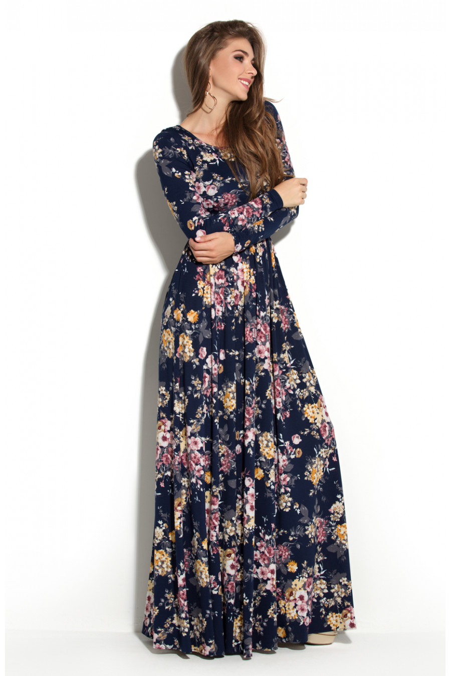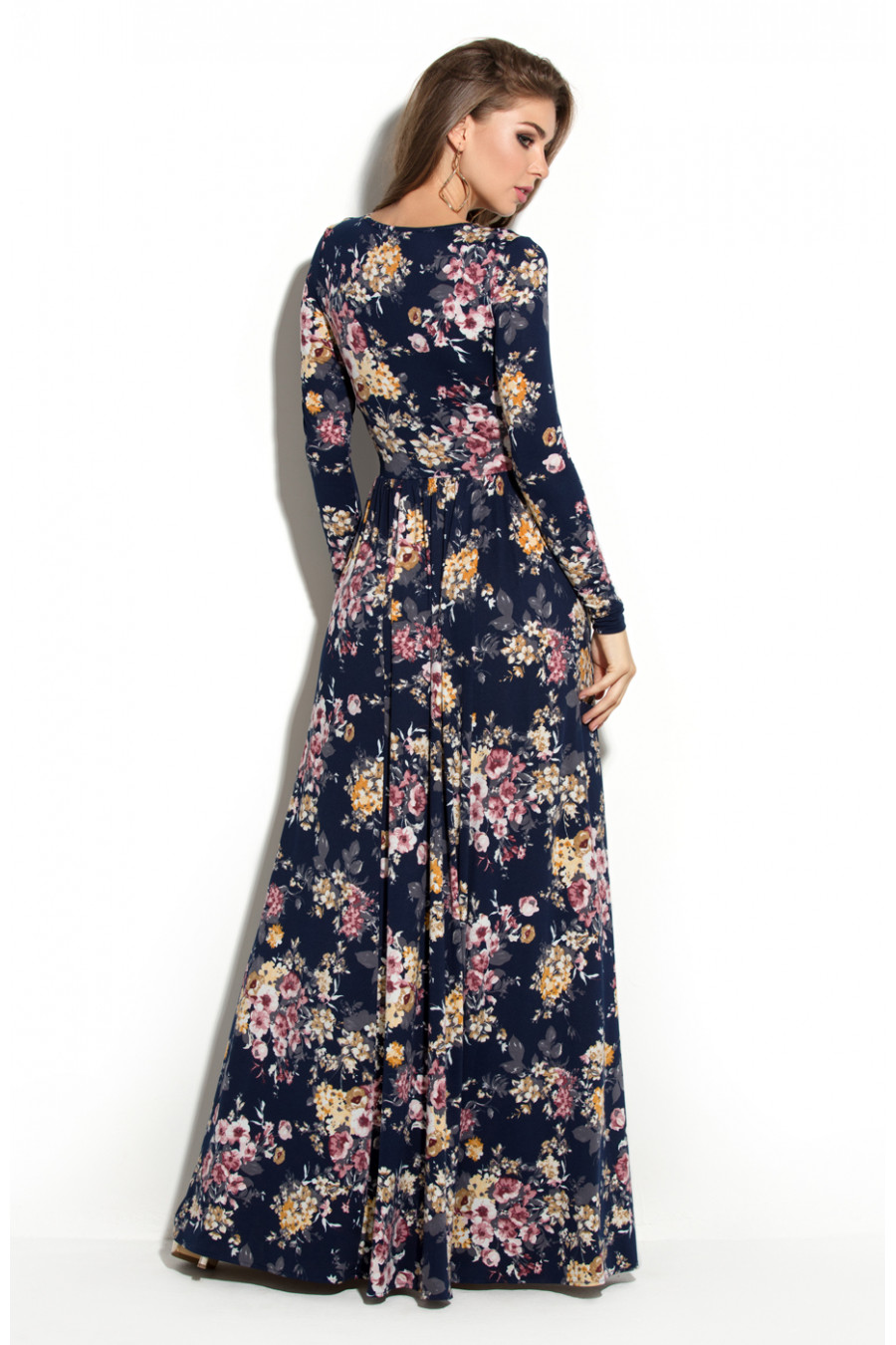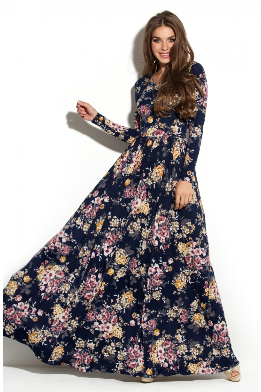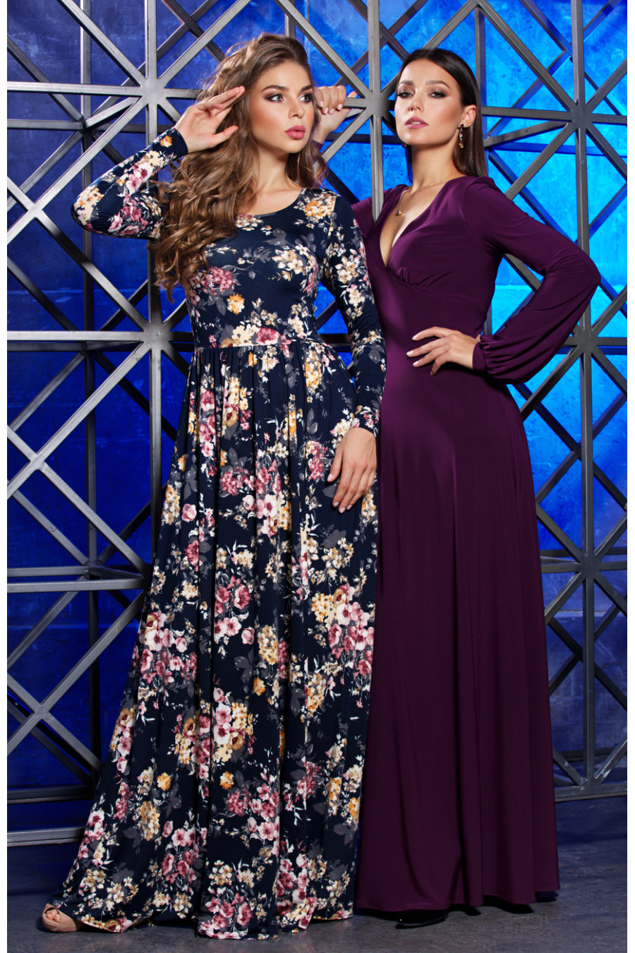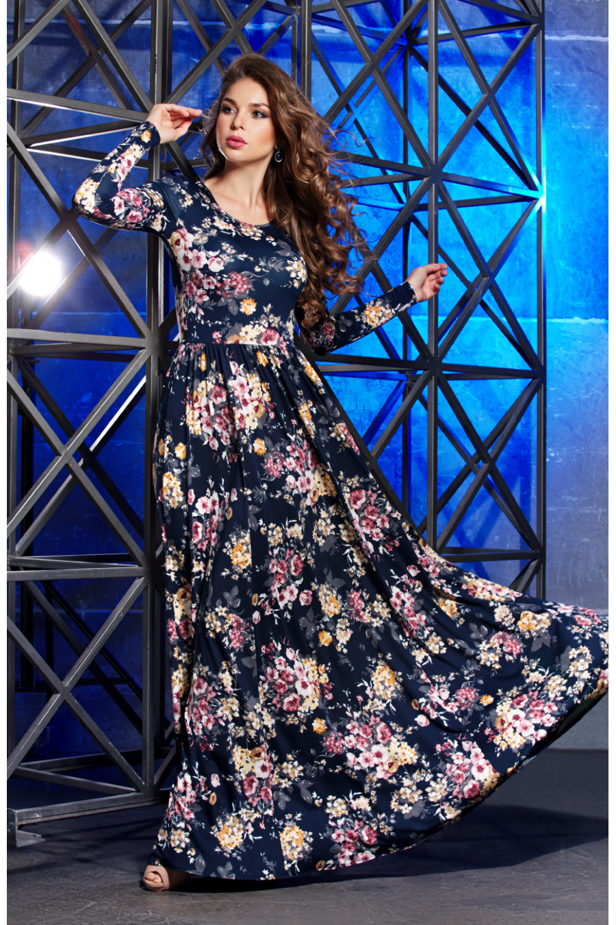 Шикарное длинное платье в пол из трикотажа. Платье отрезное по линии талии. Длинная юбка платья имеет сильное расклешение к низу, и сборку по линии талии. Благодаря такому крою, юбка эффектно струиться при ходьбе, что придает сексуальности и загадочности. Рукав втачной длинный. Вырез горловины круглый не глубокий, обработан узким кантом.