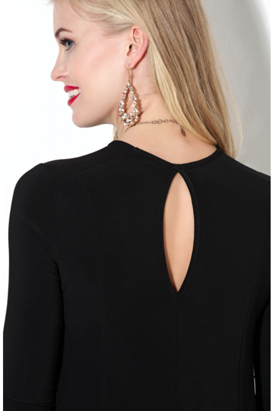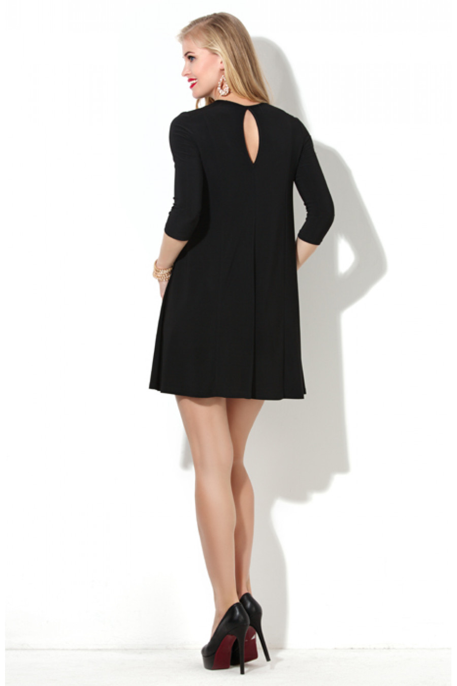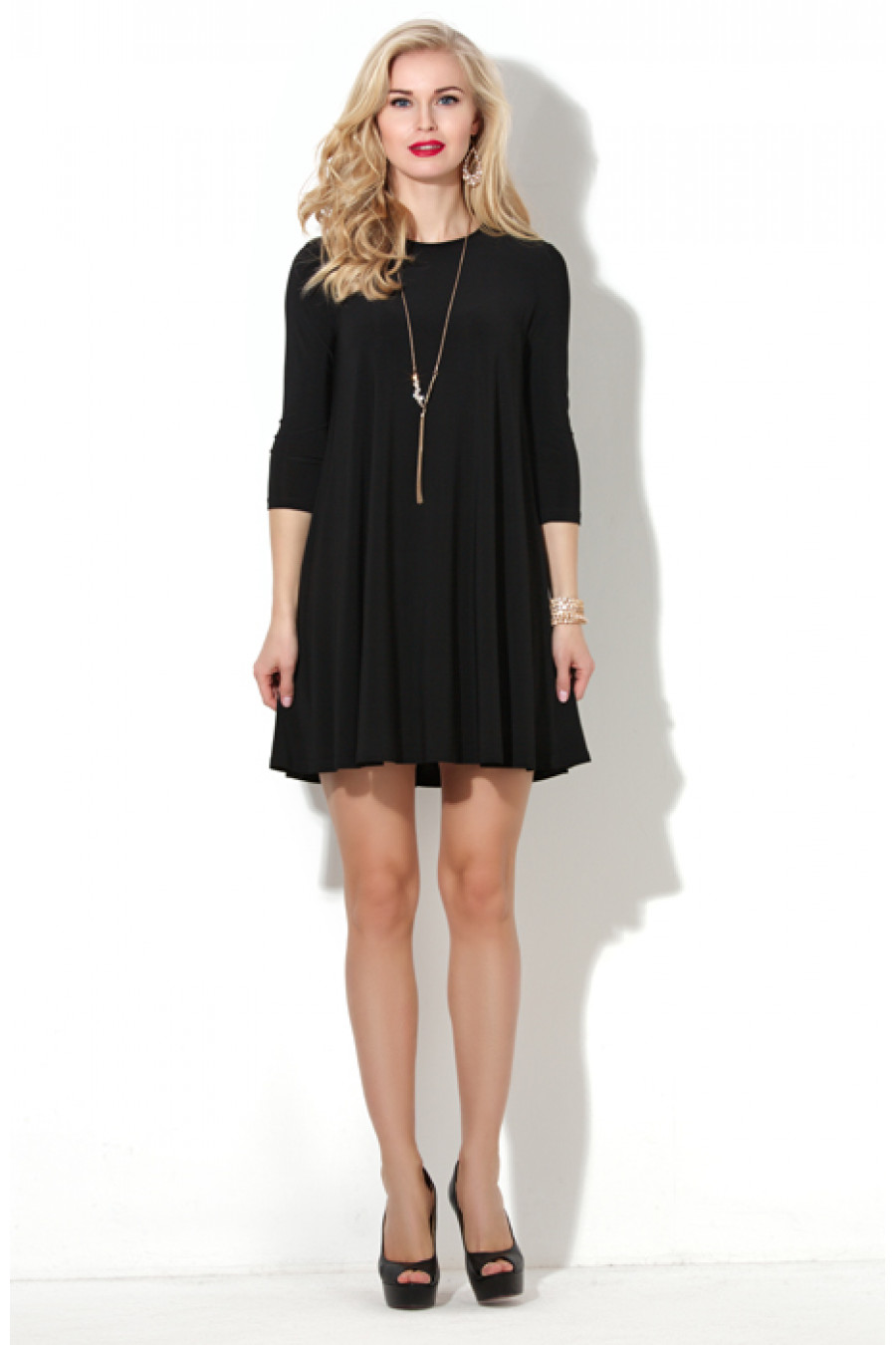 Коктельное платье из трикотажа «масло». Свободный, расклешенный силуэт платья достигнут благодаря конструктивным линиям. Горловина и вырез «капля» в среднем шве платья обработаны тонким кантом. Рукав втачной 3/4. В плечевом шве на полочке и спинке кокетка. Длина – 80-82 см (зависит от размера).