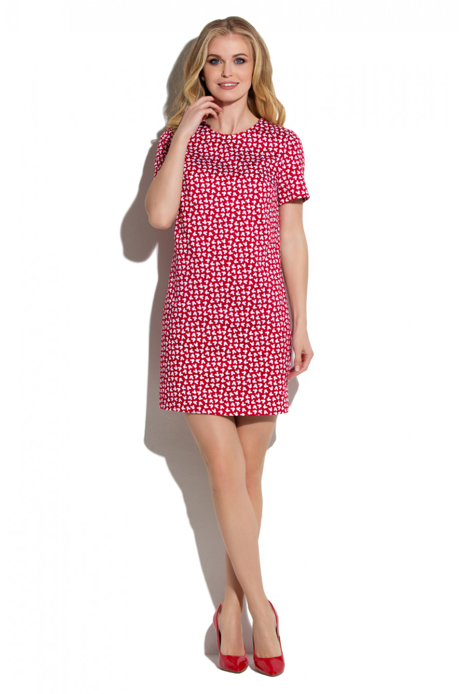 Прямое платье из хлопка с добавлением эластана. Платье простого кроя, на полочке вытачки, на спинке средний шов и талиевые вытачки. Вырез горловины круглый. Рукава короткие втачные. Прямой, свободный силуэт платья подходит обладательницам всех типов фигур, а последние несколько сезонов он еще является и модным трендом.