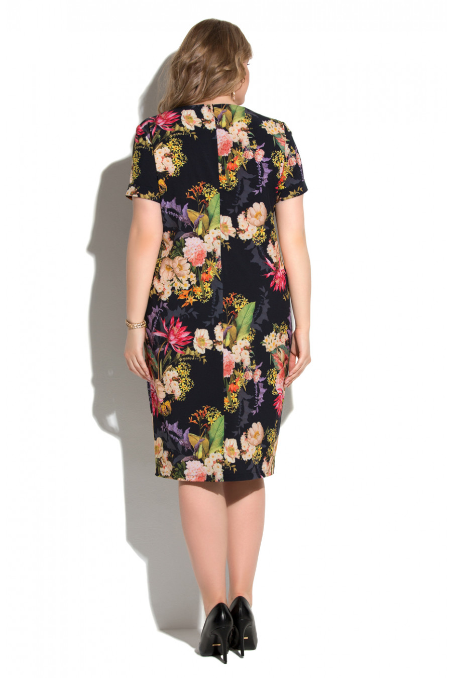 Коктельное платье прямого силуэта из легкой ткани, напоминающей натуральный шелк. Вырез горловины круглый, обработан обтачкой. На спинке средний шов. Рукав втачной с отворотом.