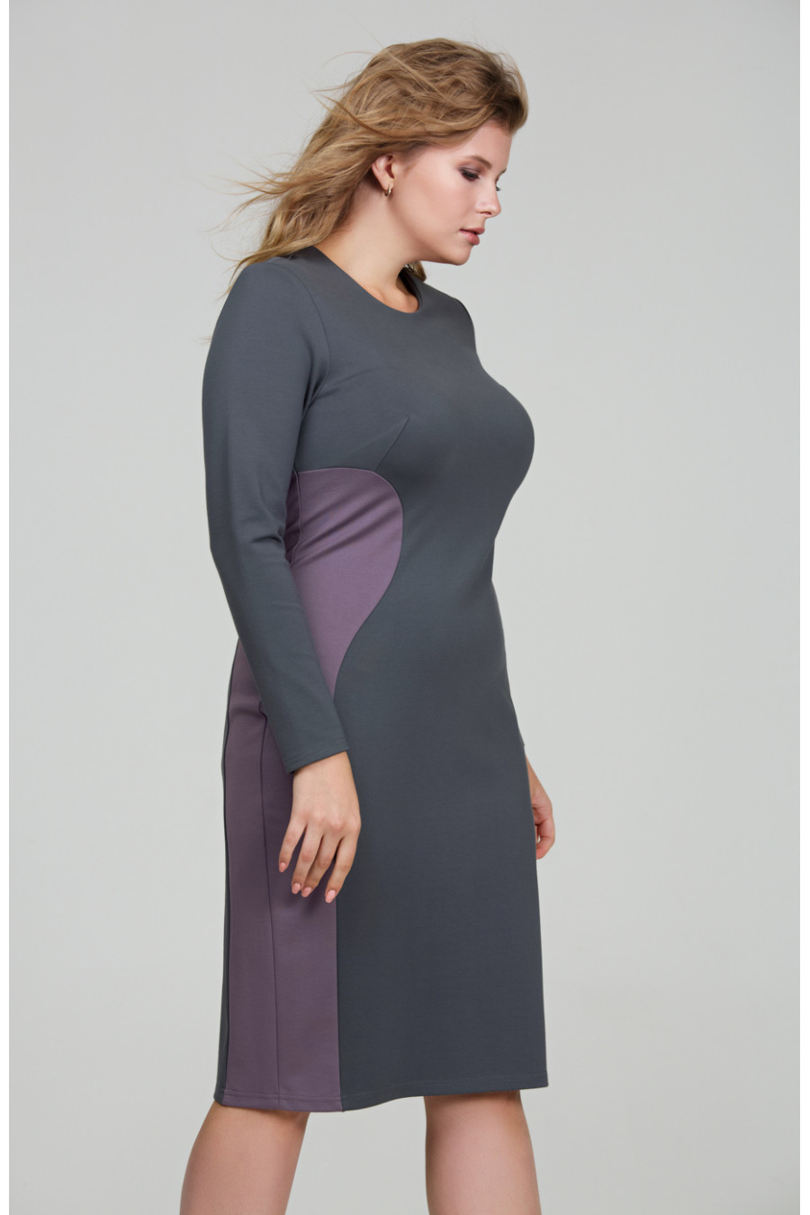 Элегантное платье футляр из плотного трикотажа «джерси». Приталенный силуэт платью придают фигурные рельефы на полочке и спинке. Боковые детали платья выполнены из черной ткани. Благодаря такому контрастному сочетанию цветов, платье делает фигуру визуально стройнее. Вырез горловины круглый не глубокий. В среднем шве спинки застежка на потайную молнию и шлица.