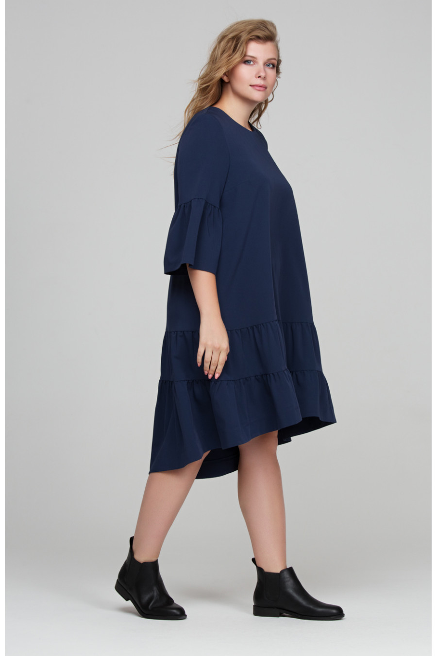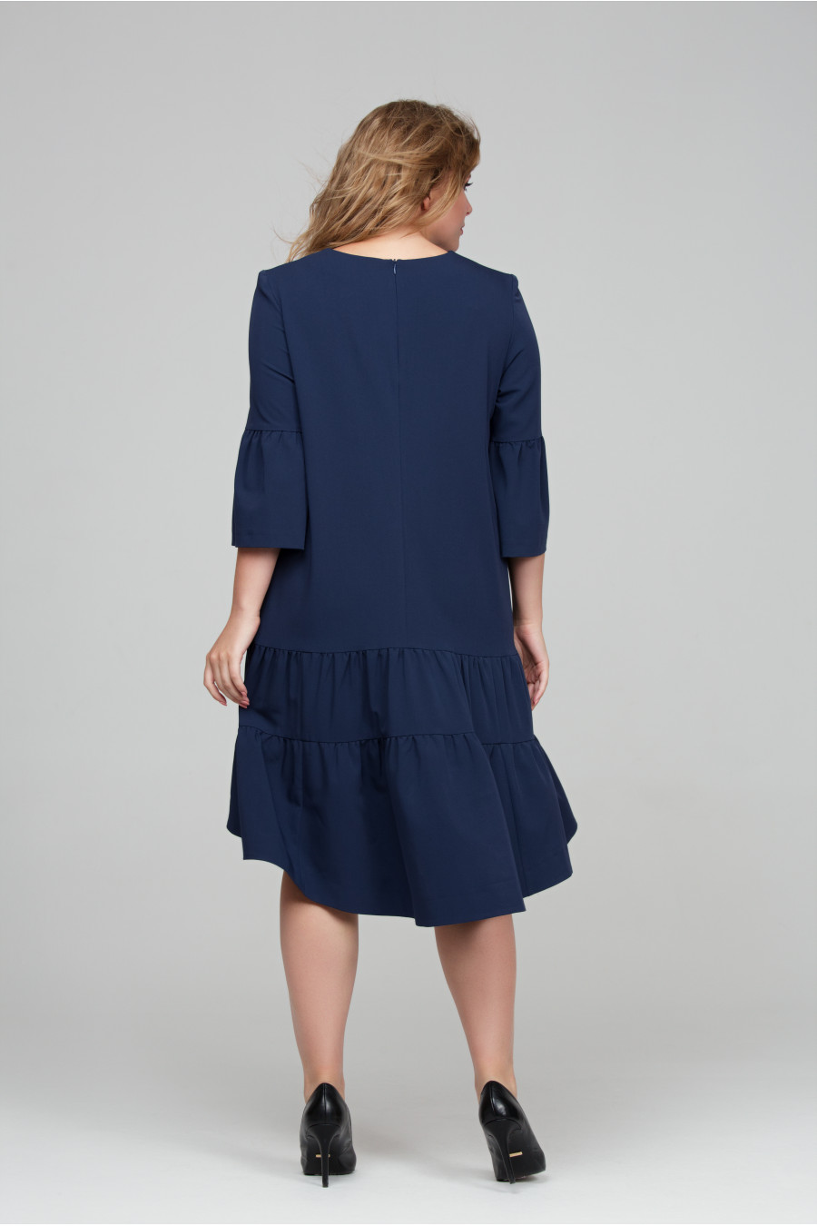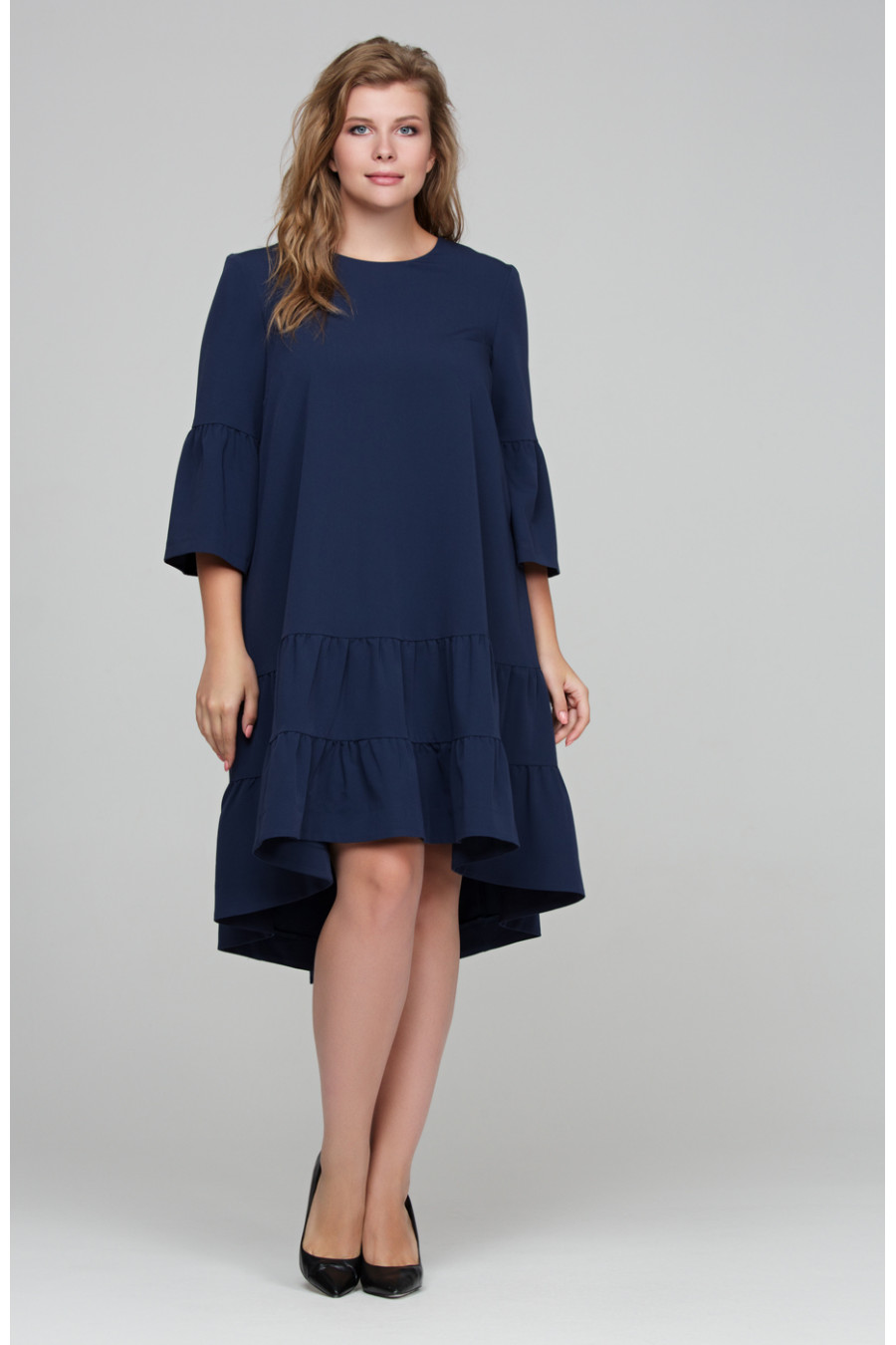Коктейльное платье широкого покроя из плательной ткани «гальяно». Вырез горловины не глубокий круглый. В среднем шве спинки застежка на потайную молнию. Рукав втачной длинной ¾, с воланом и сборкой. Низ платья ассиметричный, сзади длиннее. По низу платья также расположены два волана со сборкой.