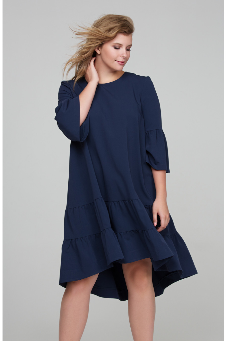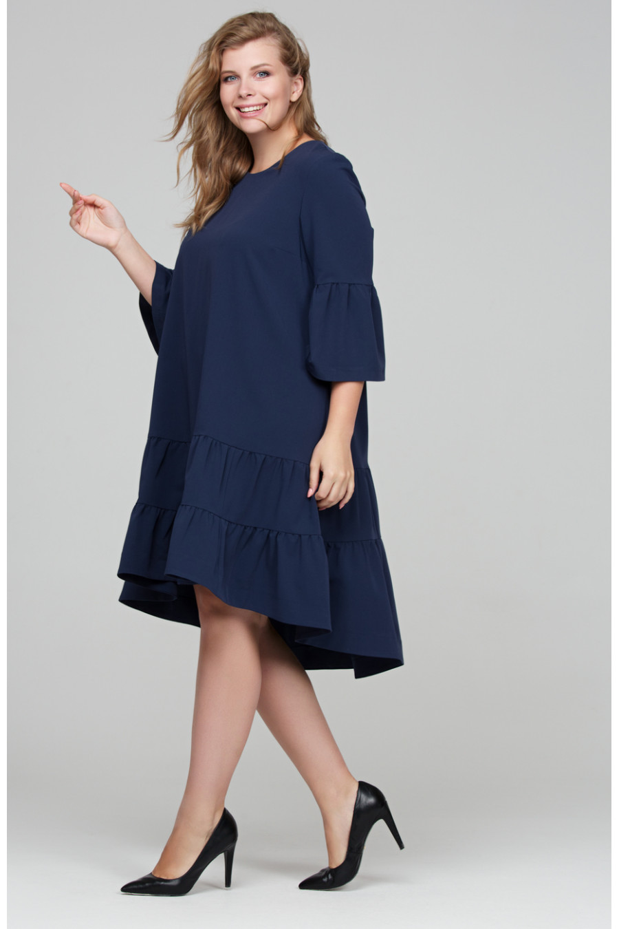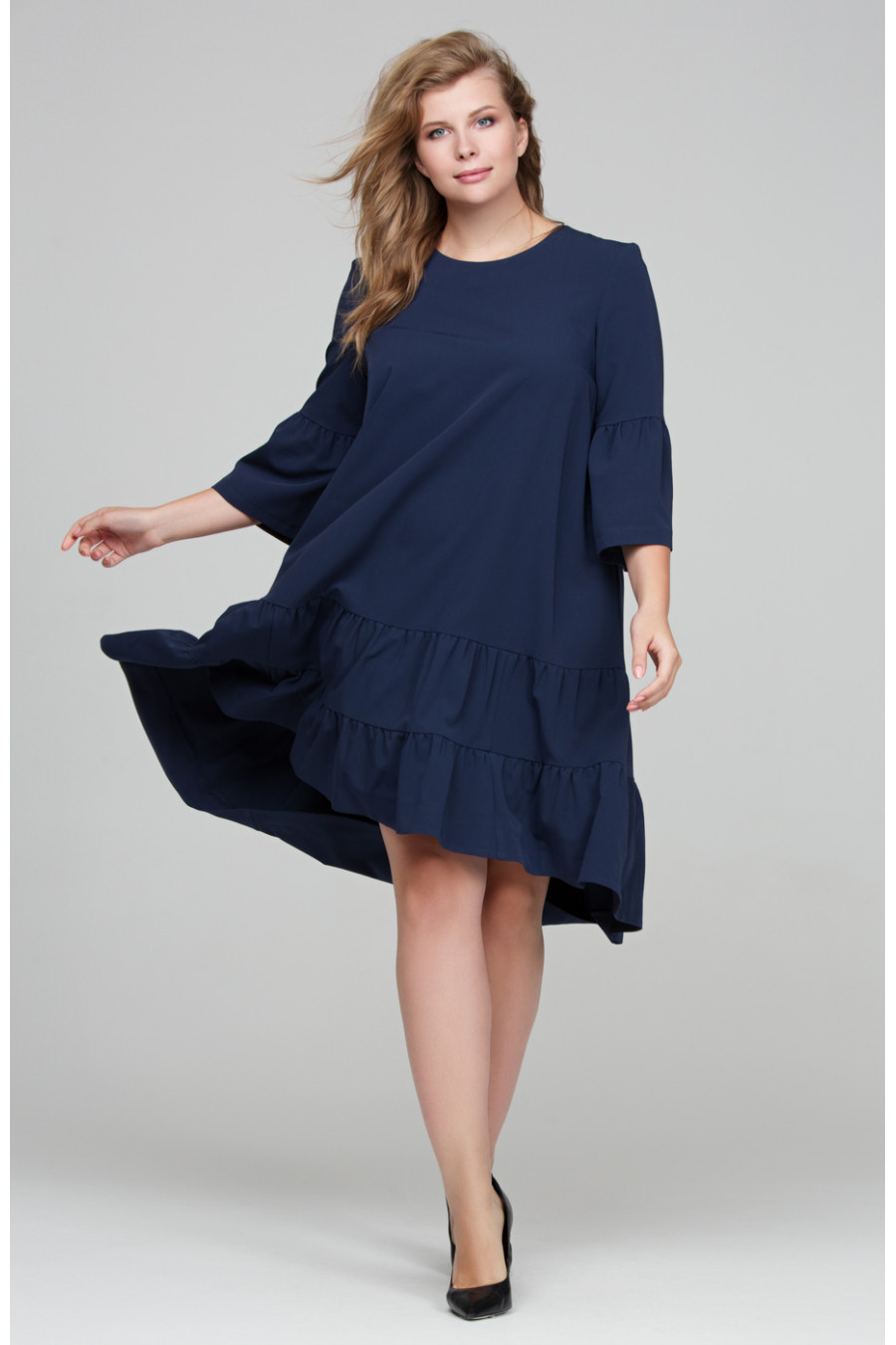 Коктейльное платье широкого покроя из плательной ткани «гальяно». Вырез горловины не глубокий круглый. В среднем шве спинки застежка на потайную молнию. Рукав втачной длинной ¾, с воланом и сборкой. Низ платья ассиметричный, сзади длиннее. По низу платья также расположены два волана со сборкой.