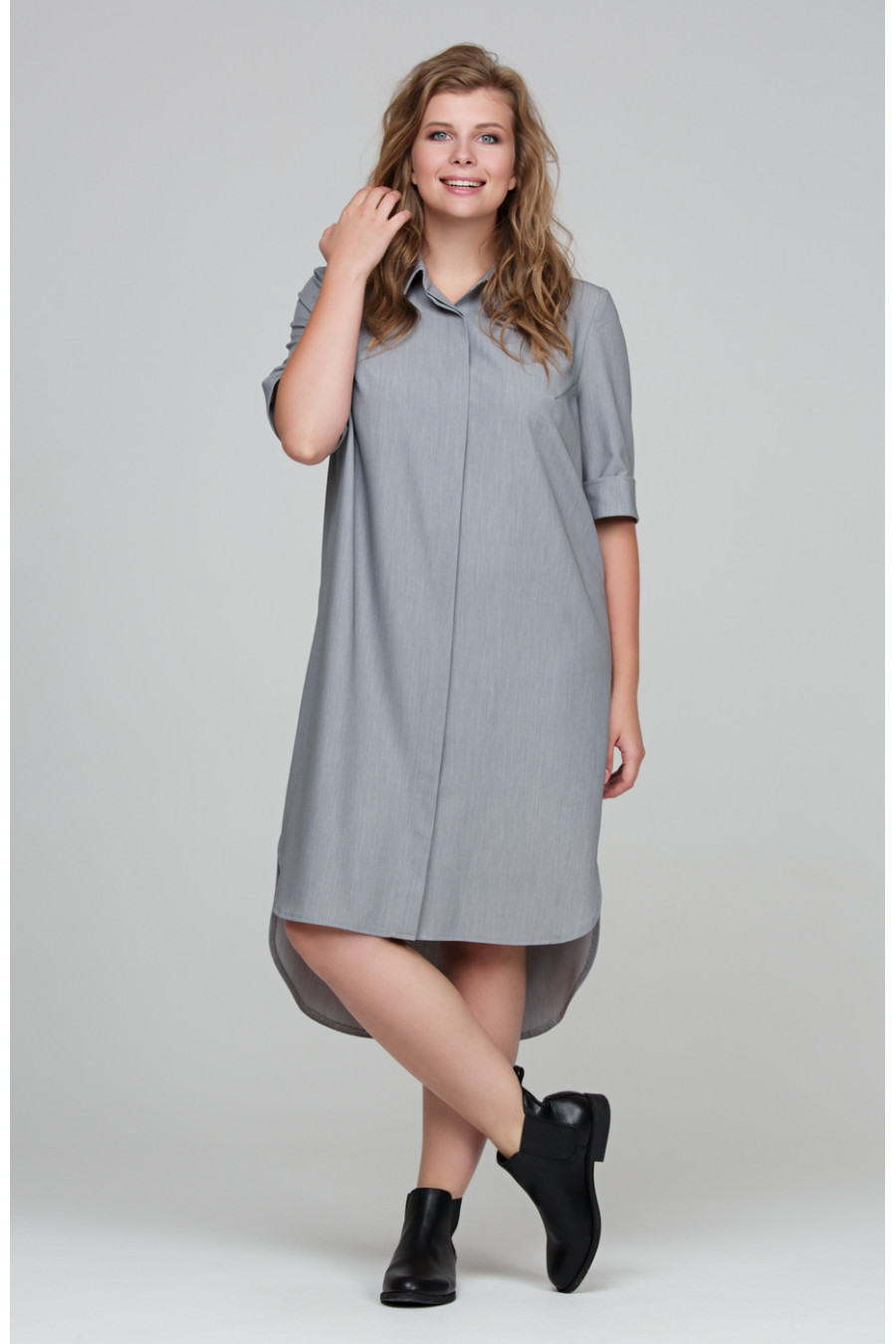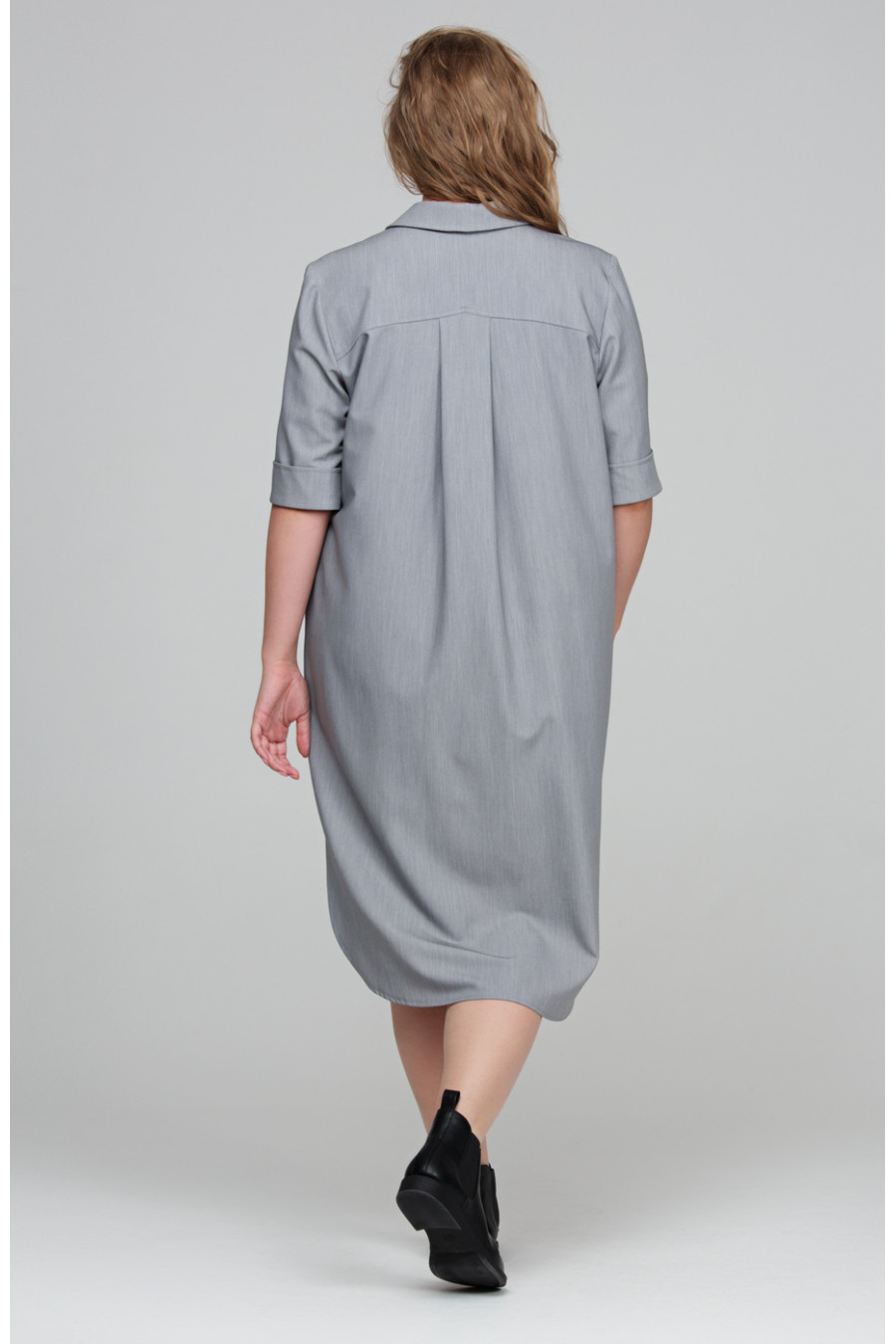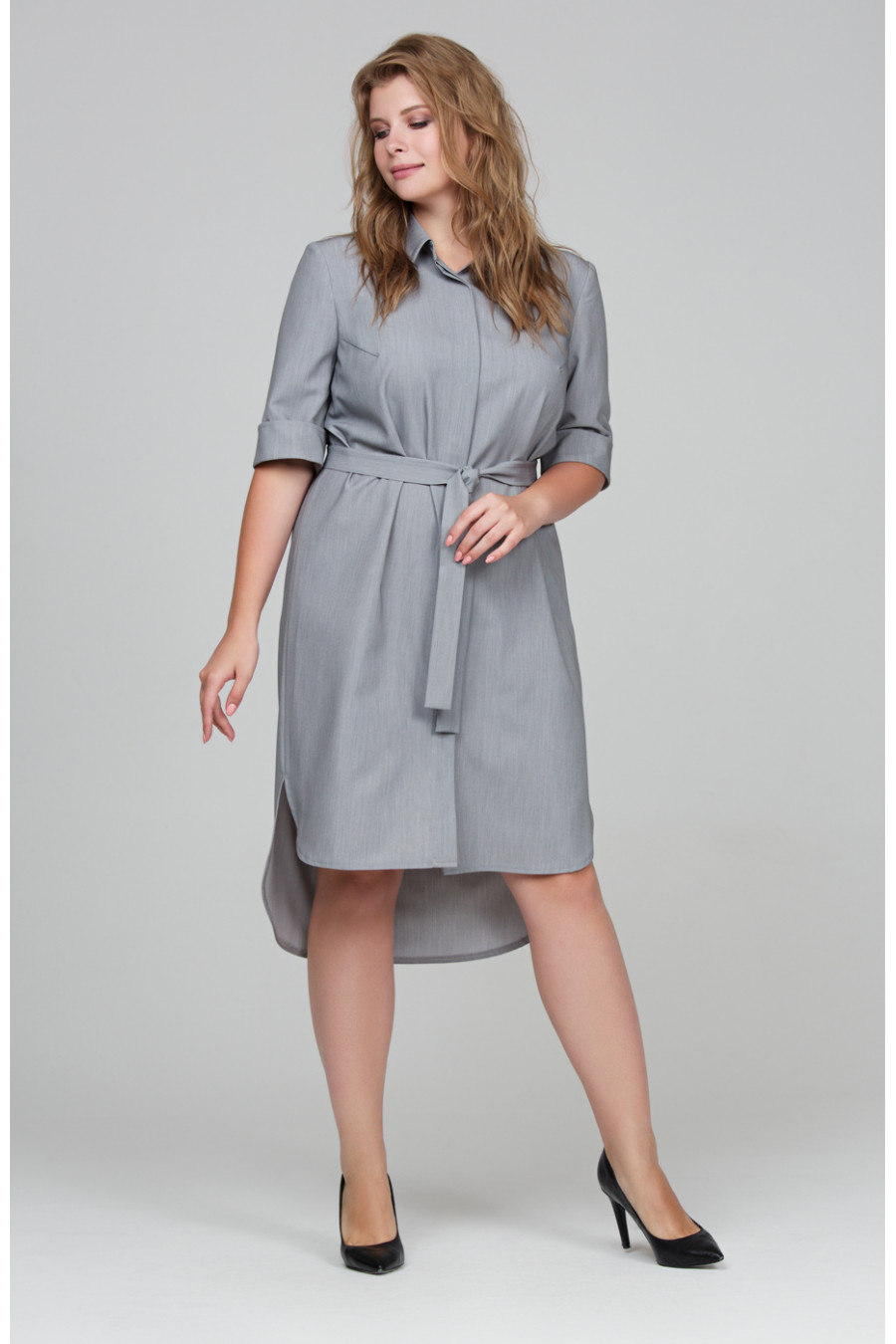 Платье-рубашка из приятной ткани «гальяно». Платье прямого силуэта в комплекте с поясом. На полочке потайная застежка на пуговицы. Низ ассиметричный, сзади длиннее. Воротник отложной со стойкой. На спинке кокетка и небольшая бантовая складка. Рукав втачной длинной до локтя, низ оформлен манжетой.