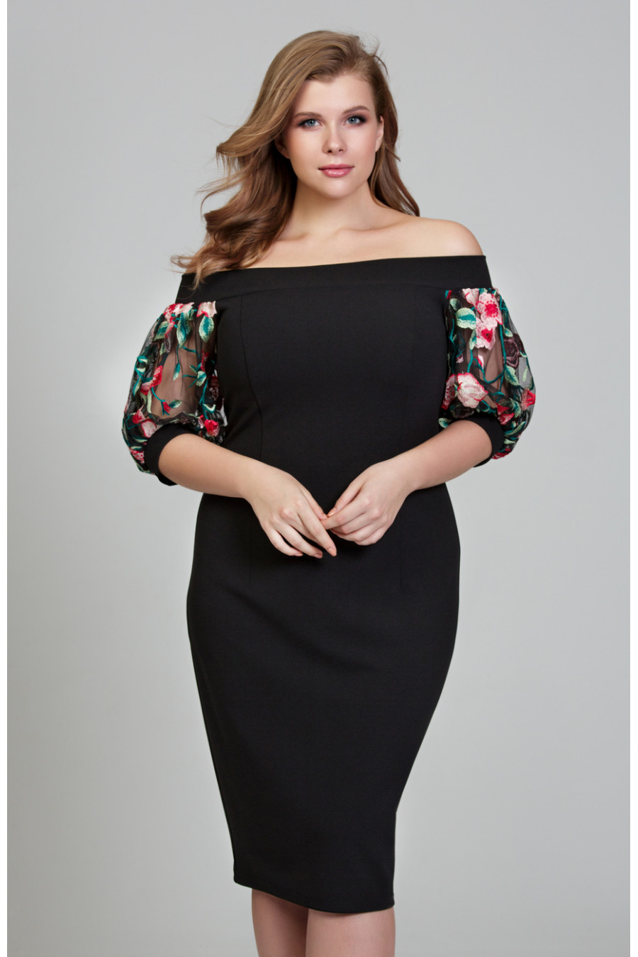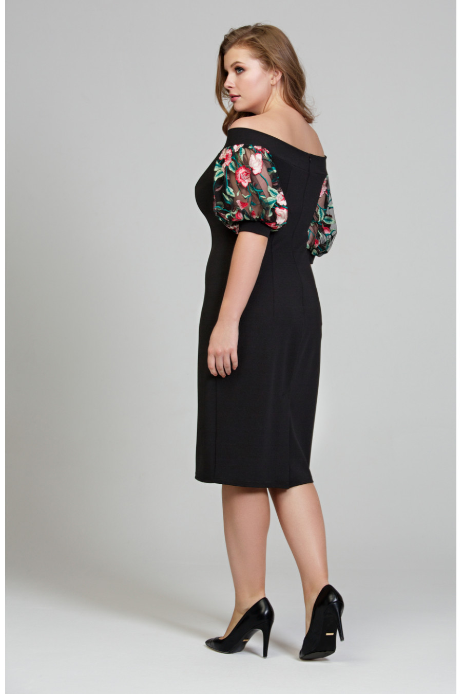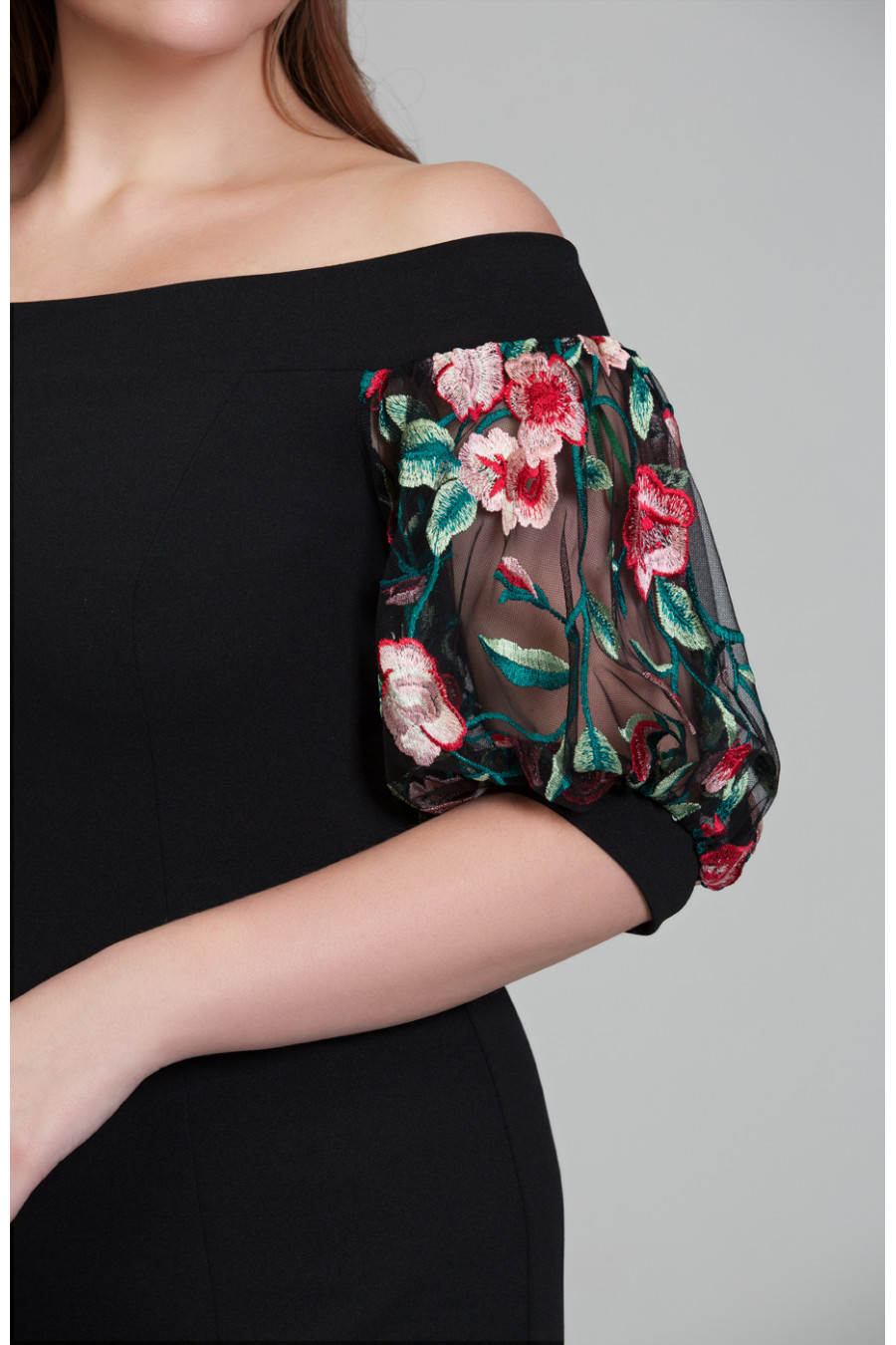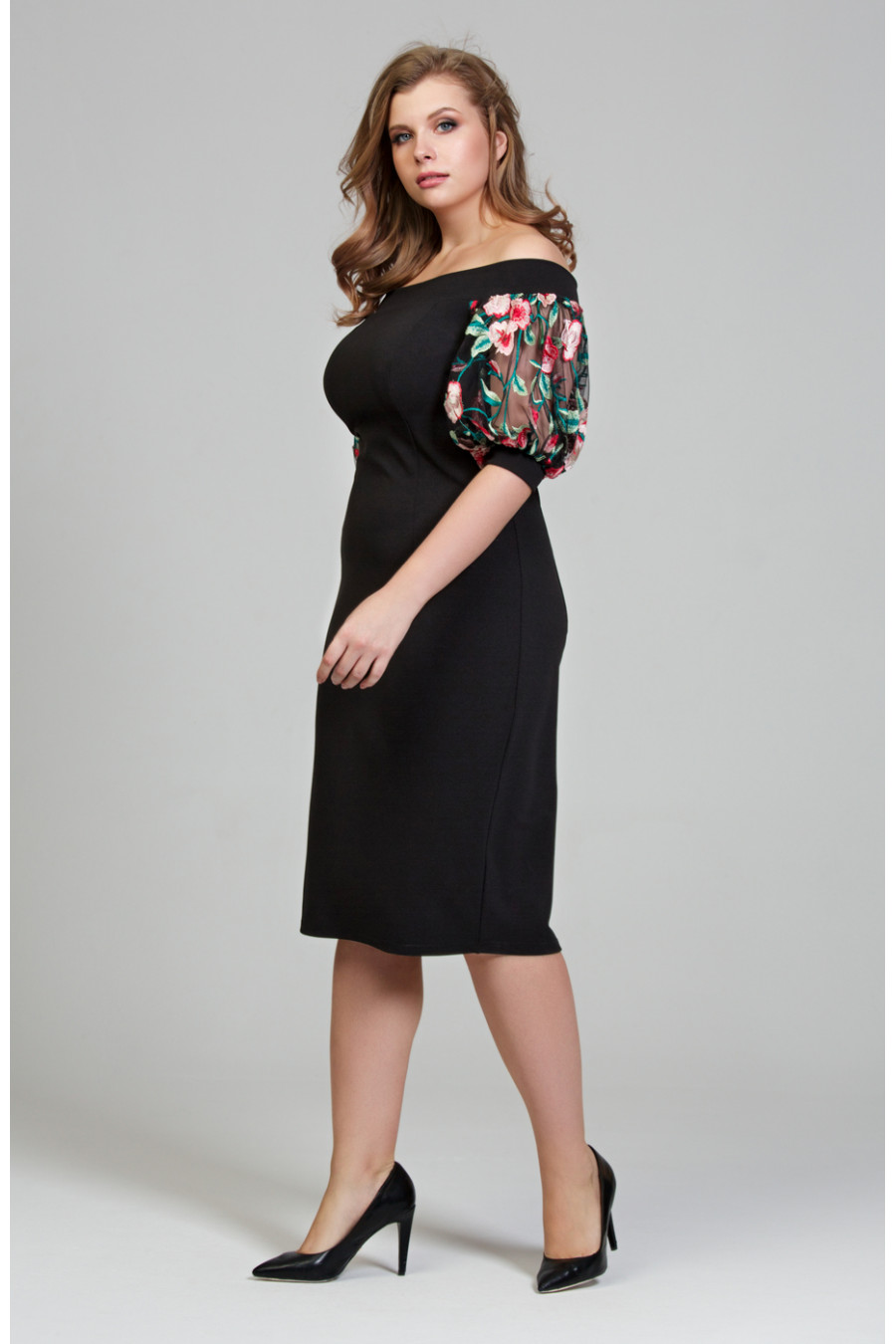 Платье-футляр из трикотажной ткани «поликреп». На полочке и спинке данной модели введены рельевы. Застежка на потайную молнию в среднем шве спинке. Вырез декольте глубокий с открытыми плечами. Рукава выполнены в виде объемных «фанариков», выполнены из сетки с шикарным шитьем на ней.