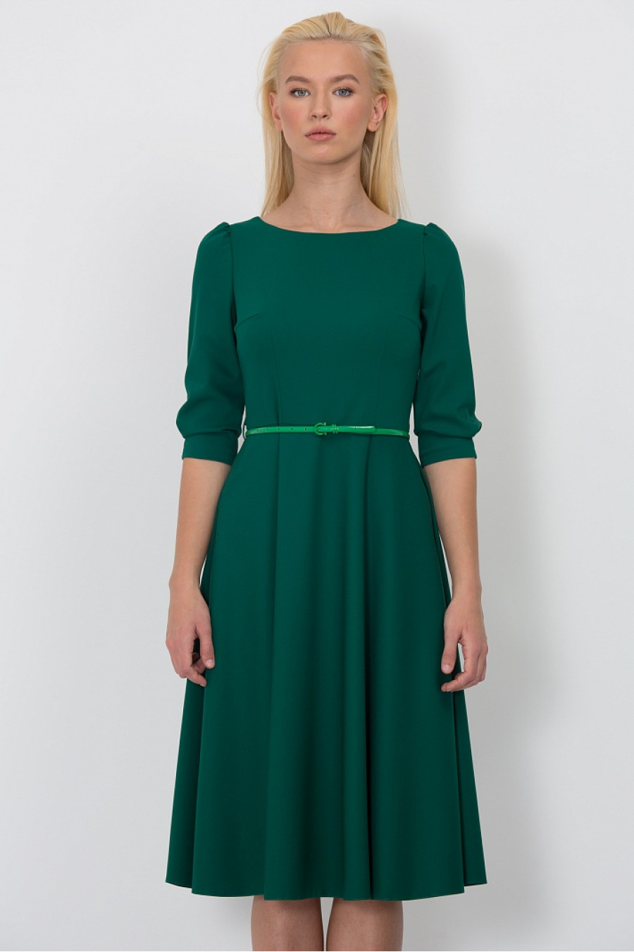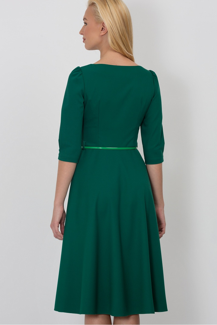 Оригинальное платье приталенного силуэта с расклешенной юбкой. Модель с округлым вырезом горловины и рукавами 3/4. В боковом шве-застёжка на потайную молнию. Прекрасный вариант для модных женщин, желающих подчеркнуть свою индивидуальность и хороший вкус. Длина: 107 см. Ремень не входит в комплект. Без подклада.