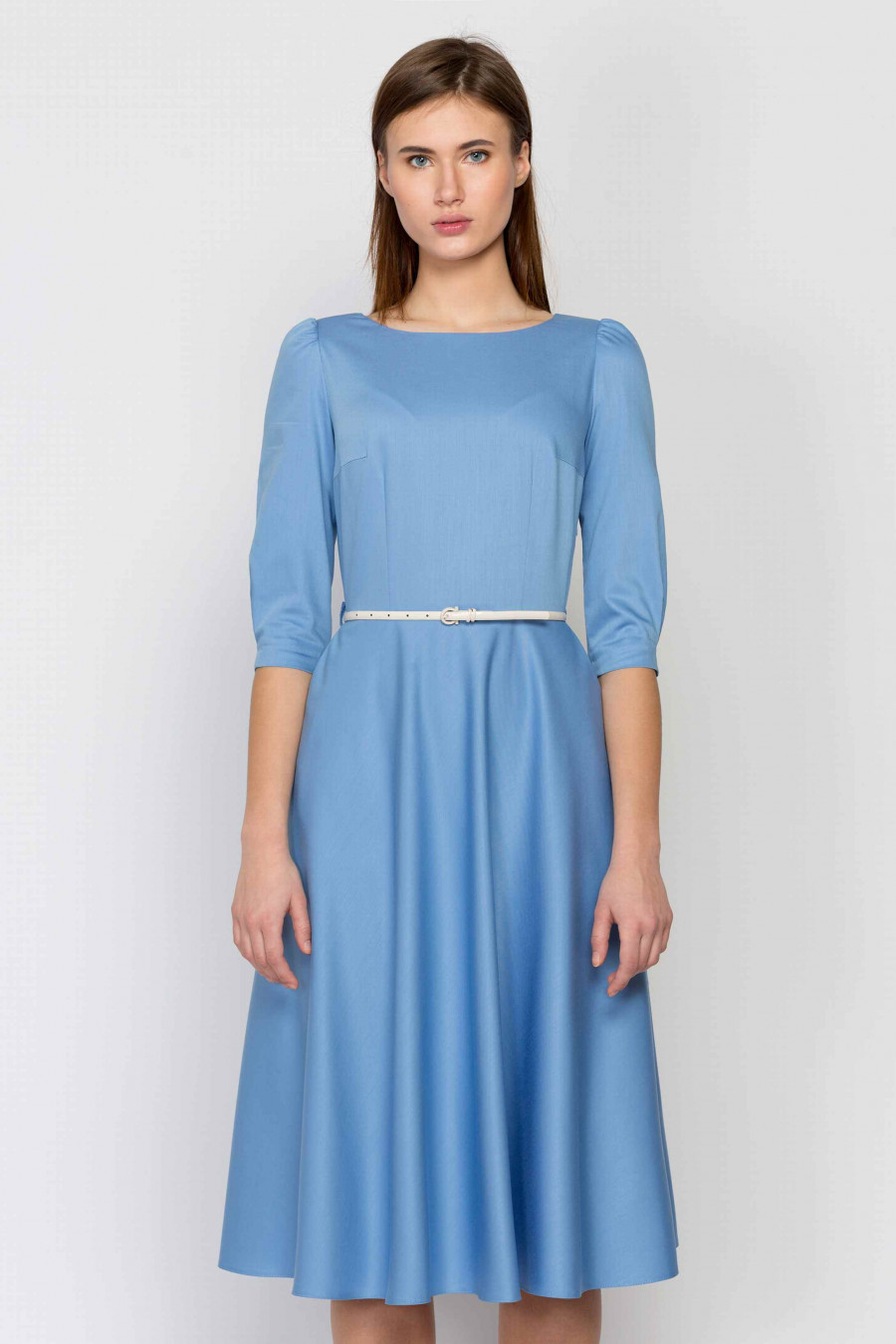 Женственное платье классического силуэта, который подчеркивает все достоинства фигуры. Ткань легкая пастельно-голубого цвета очень приятная на ощупь. Рукав 3/4 с легкими сборками по плечу, есть два элегантных кармана по бокам, застежка-молния с левого бока. На поясе есть шлевки, ремешок продается отдельно. Без подкладки. Платье отлично подойдет для повседневной носки, а с аксессуарами станет отличным выбором для романтического свидания.