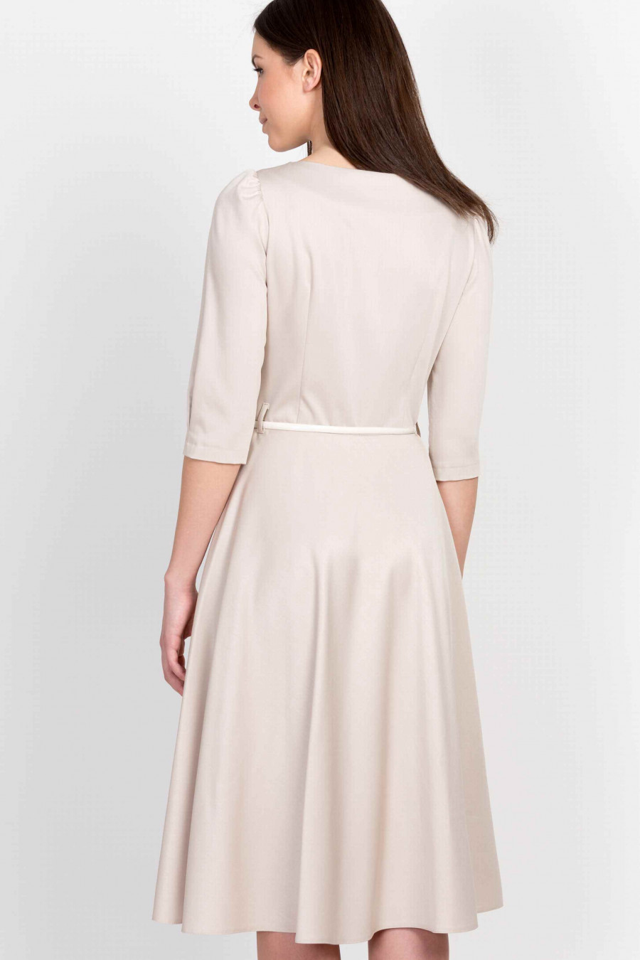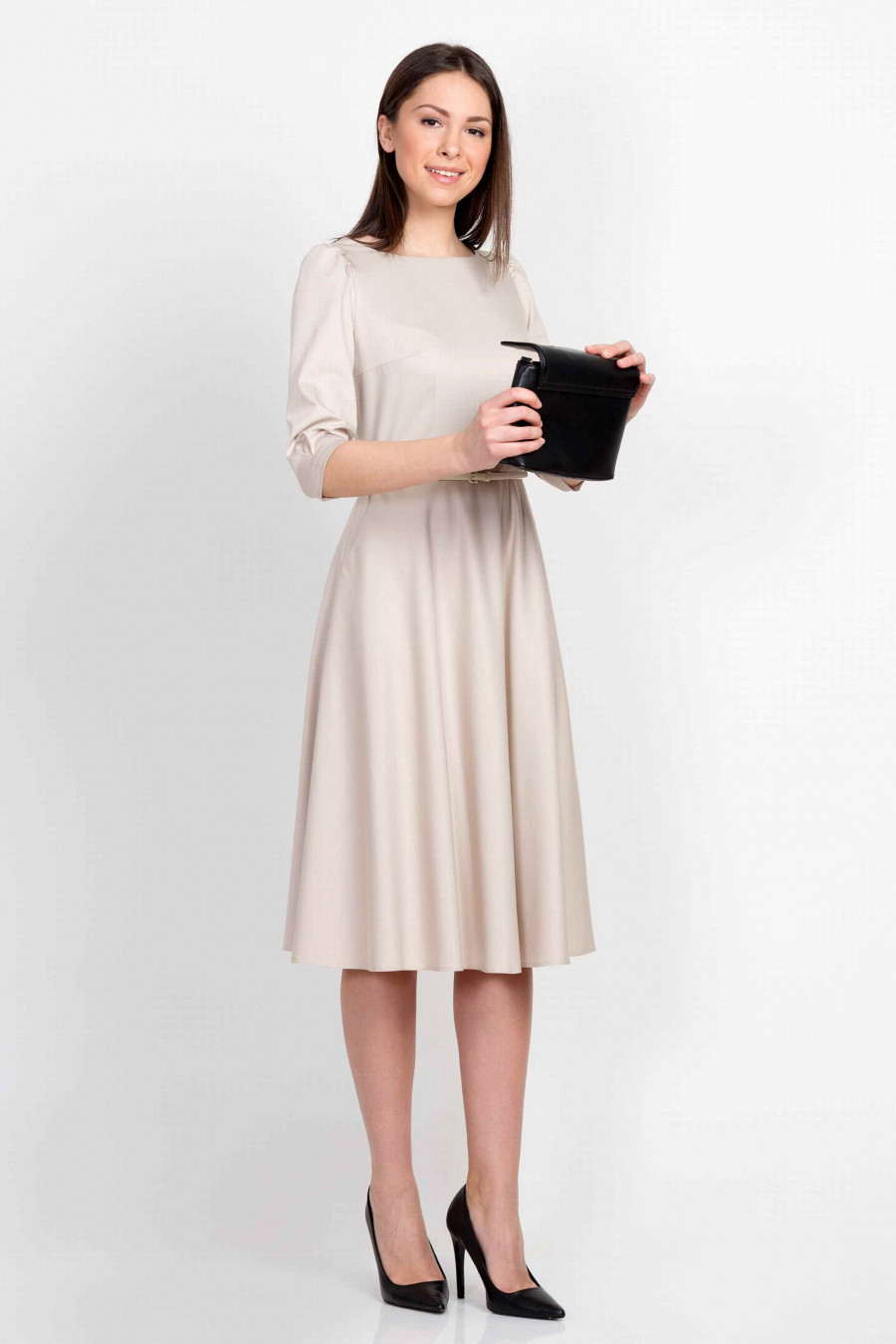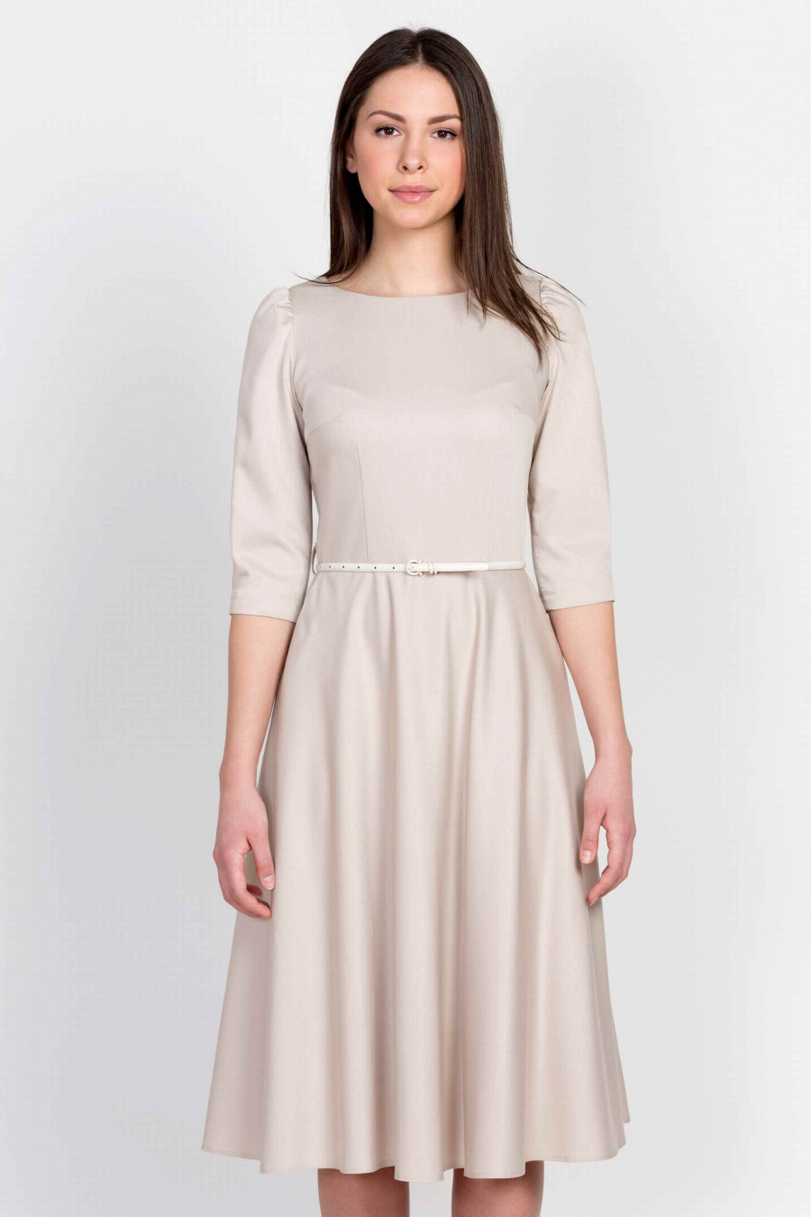 Женственное платье классического силуэта, который подчеркивает все достоинства фигуры. Ткань легкая светло-бежевого цвета очень приятная на ощупь. Рукав 3/4 с легкими сборками по плечу, есть два элегантных кармана по бокам, застежка-молния с левого бока. На поясе есть шлевки, ремешок продается отдельно. Без подкладки. Платье отлично подойдет для повседневной носки, а с аксессуарами станет отличным выбором для романтического свидания.