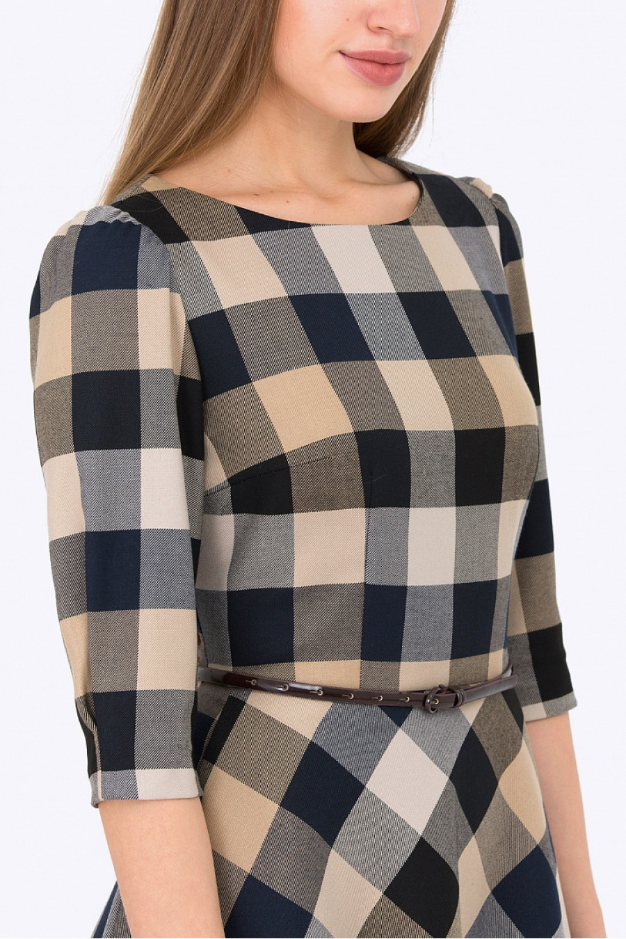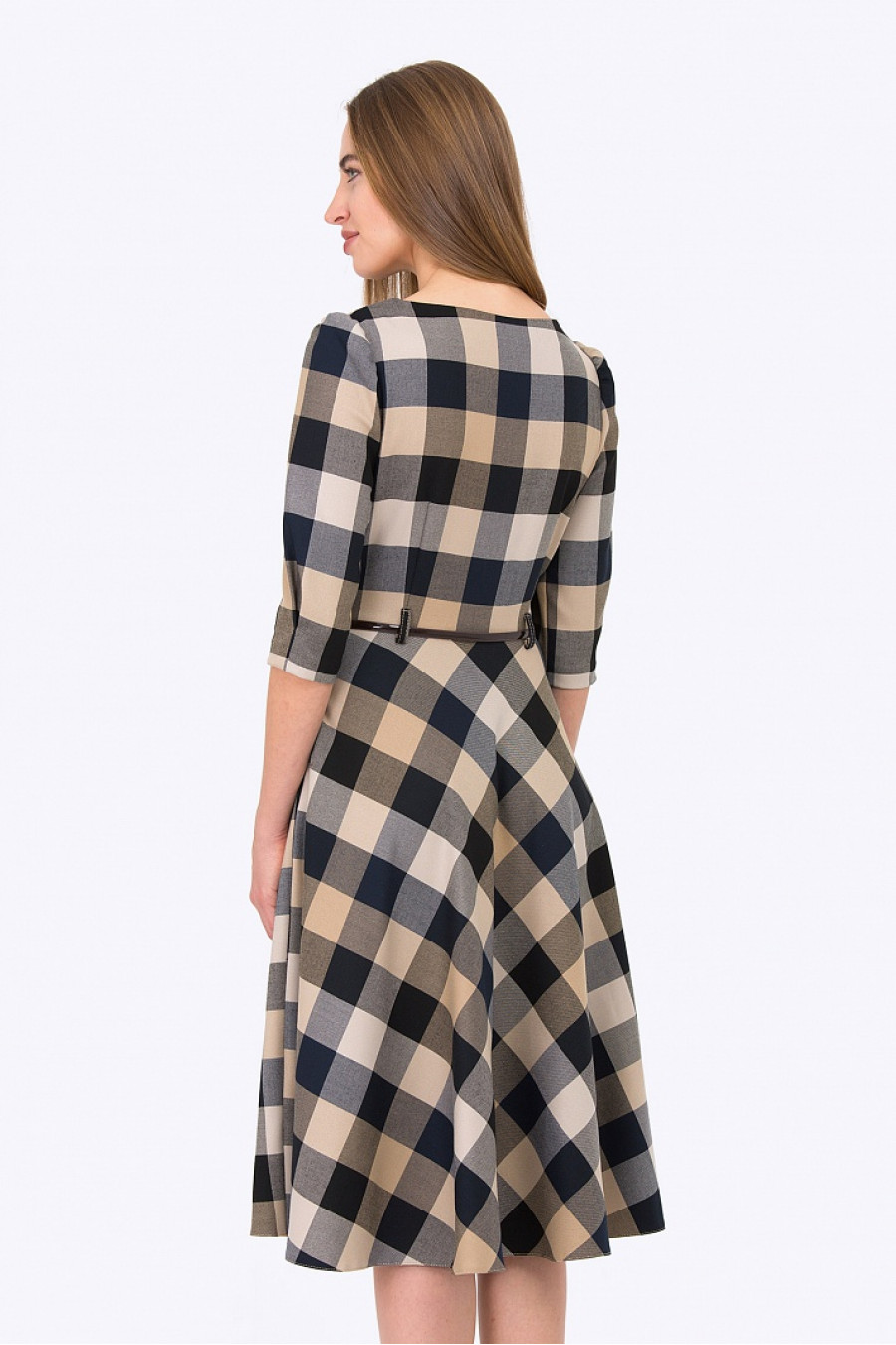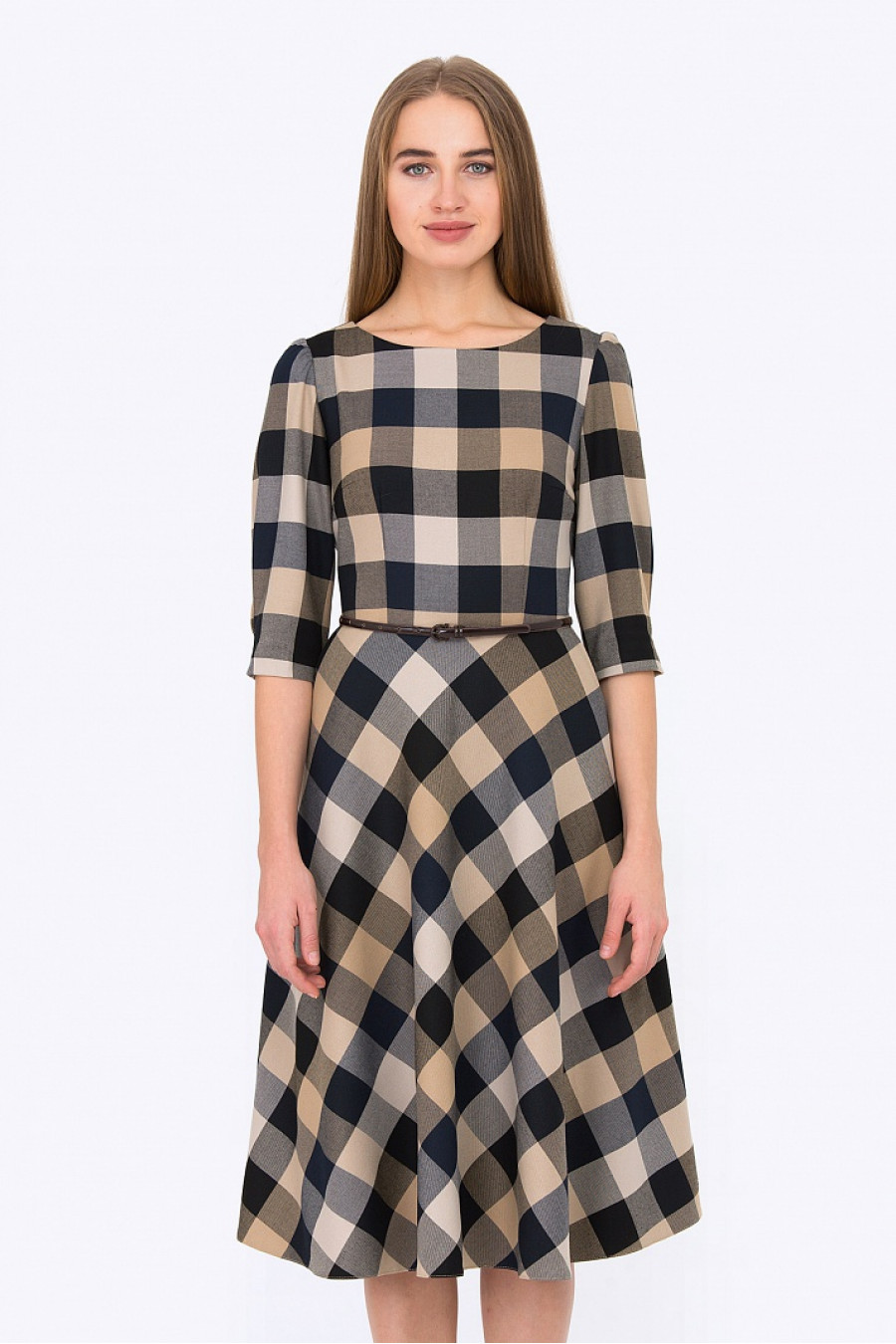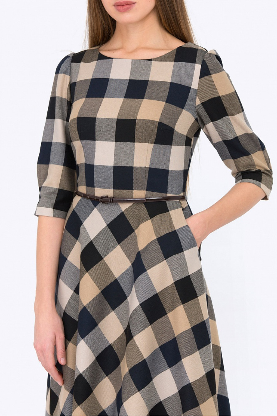 Женственное платье классического силуэта, который подчеркивает все достоинства фигуры. Ткань в клетку приятная на ощупь. Рукав 3/4 с легкими сборками по плечу, есть два элегантных кармана по бокам. На поясе есть шлевки, ремешок продается отдельно. Платье отлично подойдет для повседневной носки, а с аксессуарами станет отличным выбором для выхода в свет. Длина градируется от размера к размеру. Рост фотомодели 175 см.