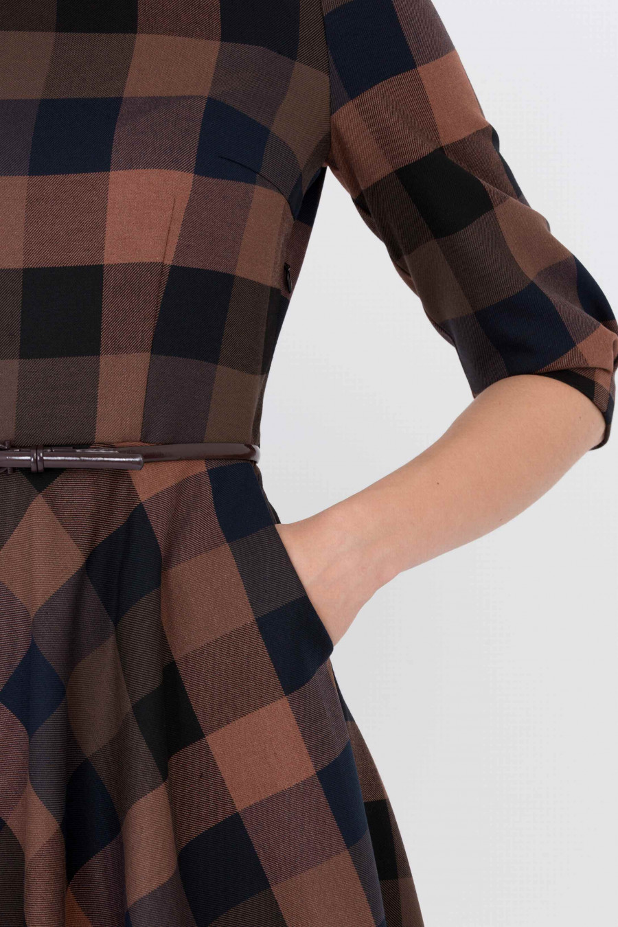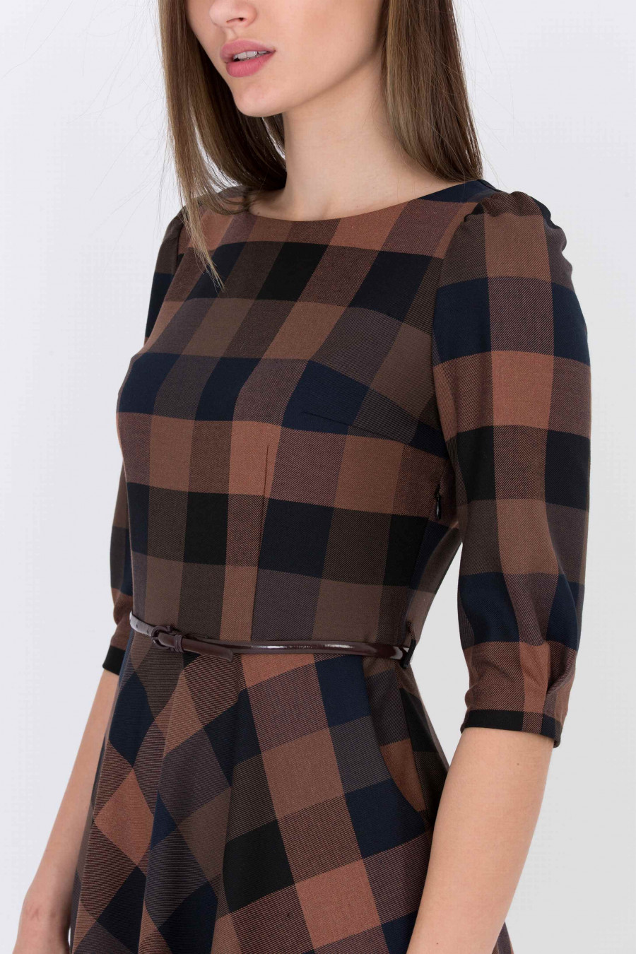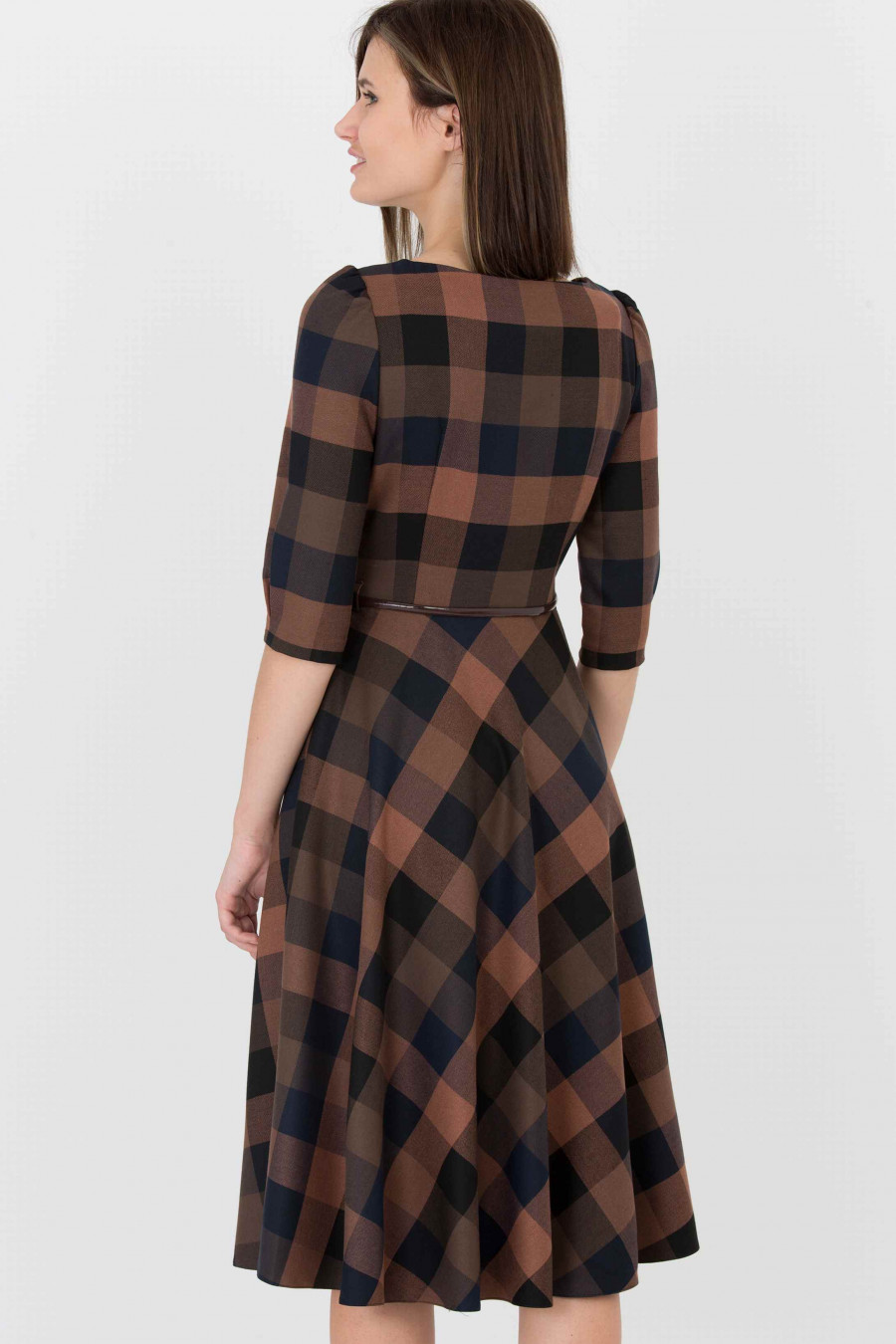 Романтичное платье классического силуэта, который подчеркивает все достоинства женской фигуры. Ткань в темно-коричневую клетку средней плотности, очень приятная на ощупь. Рукав 3/4 с легкими сборками по плечу, есть два удобных кармана по бокам, застежка-молния с левого бока. На поясе есть шлевки, ремешок продается отдельно. Длина градируется от размера к размеру: 42 размер - 106 см 52 размер - 114 см. Рост фотомодели 174 см. Длина: 110 см.
