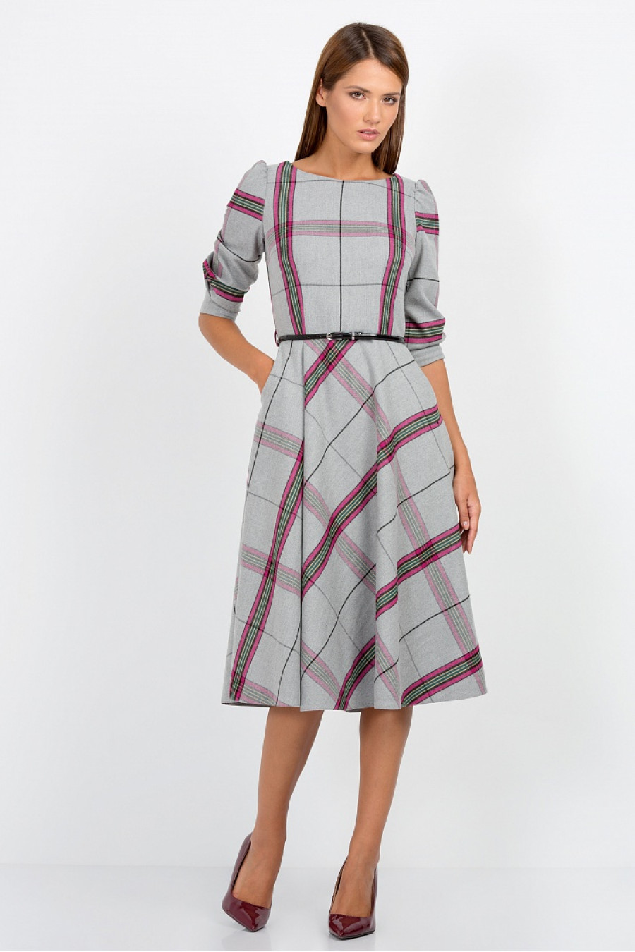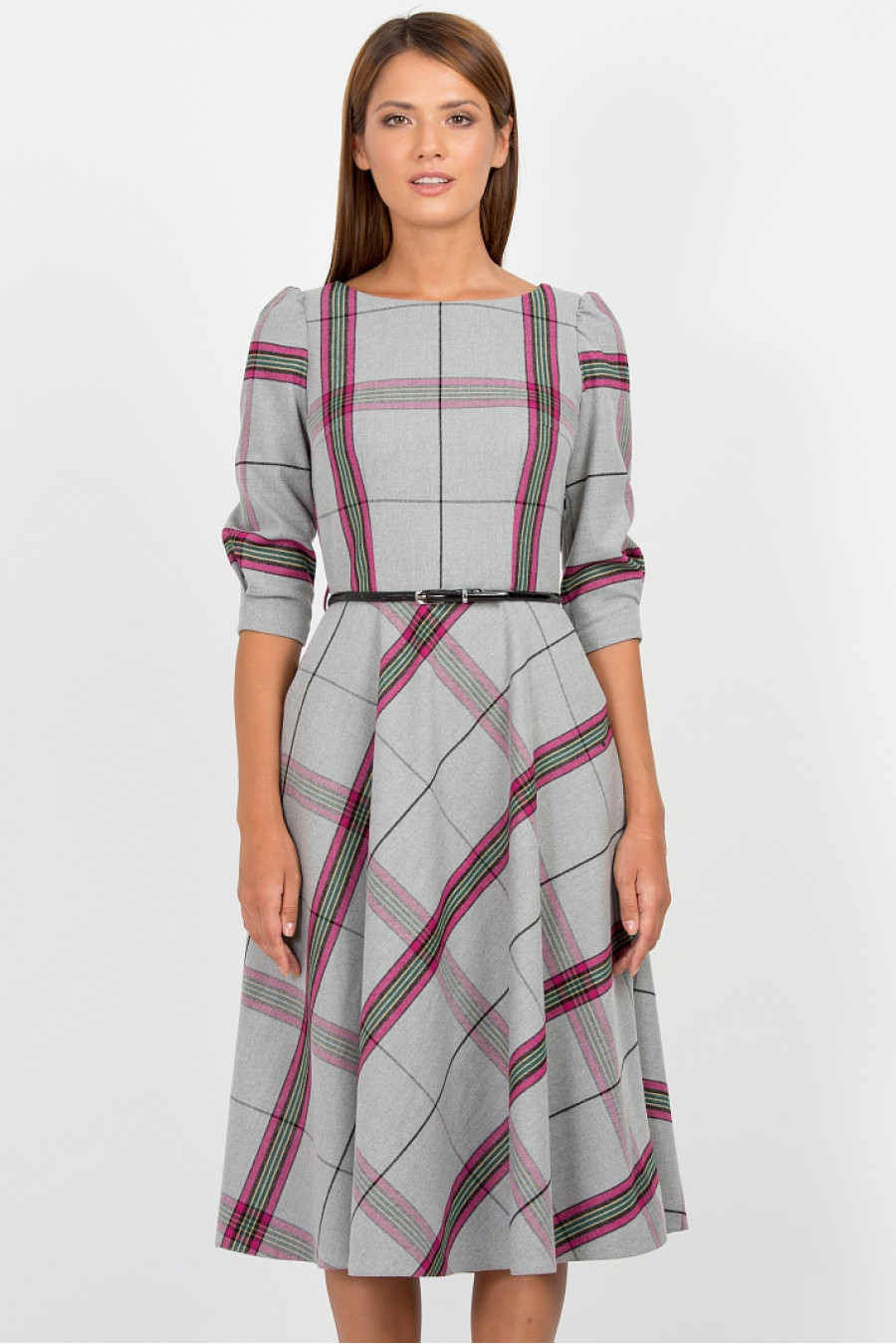 Оригинальное платье приталенного силуэта с расклешенной юбкой. Модель с округлым вырезом горловины и рукавами 3/4. В боковом шве-застёжка на потайную молнию. Прекрасный вариант для модных женщин, желающих подчеркнуть свою индивидуальность и хороший вкус. Длина: 108 см. Ремень не входит в комплект.Без подклада.