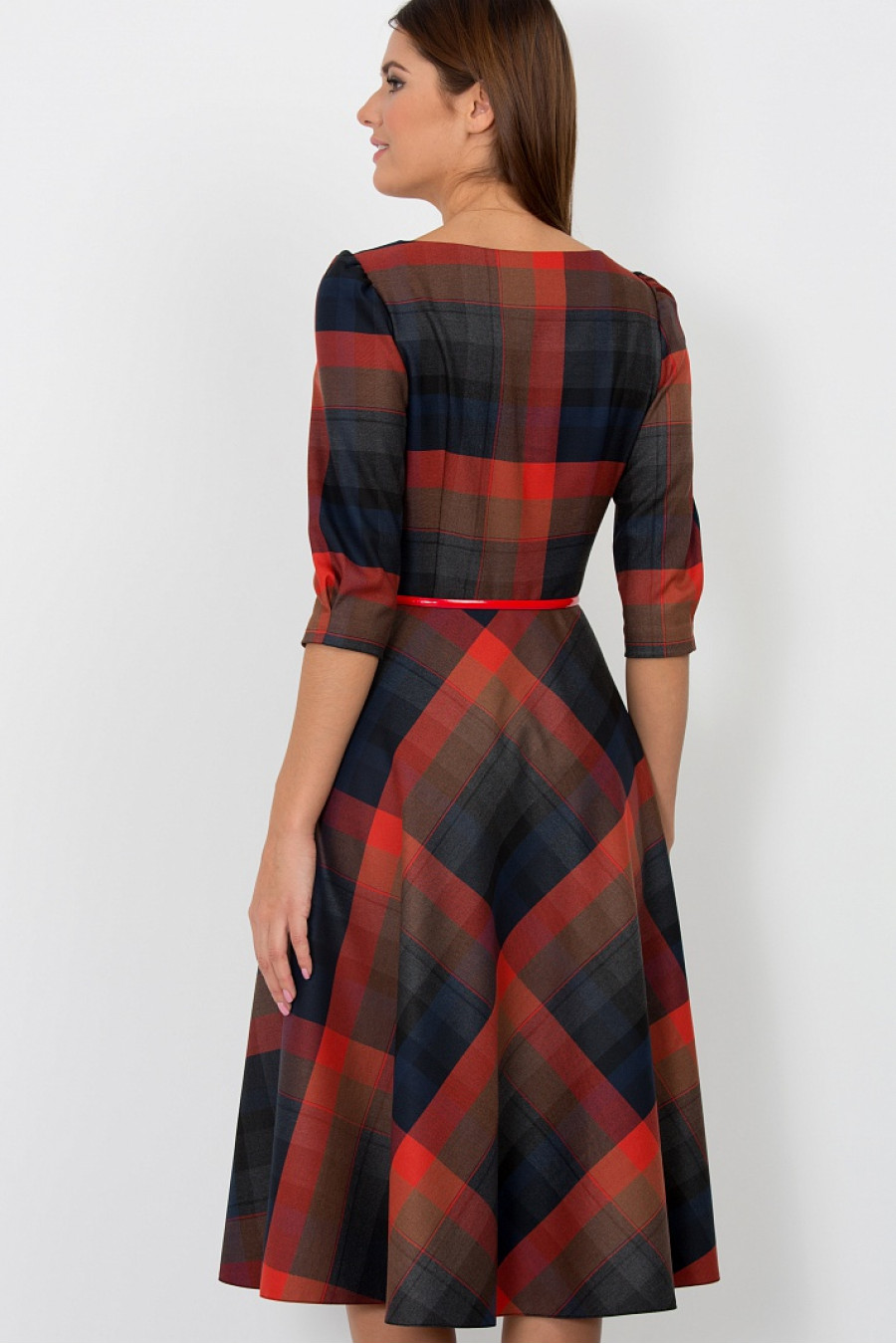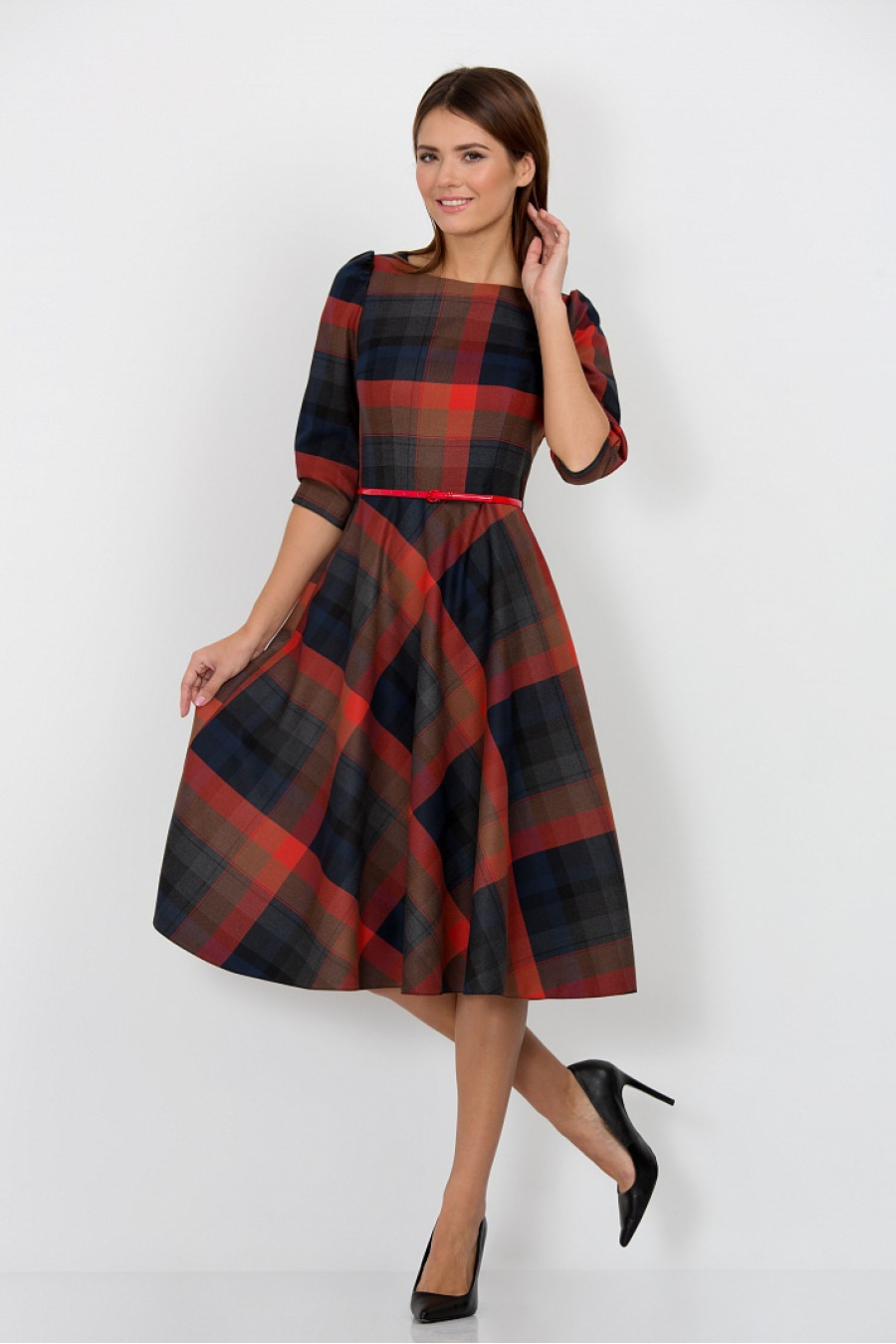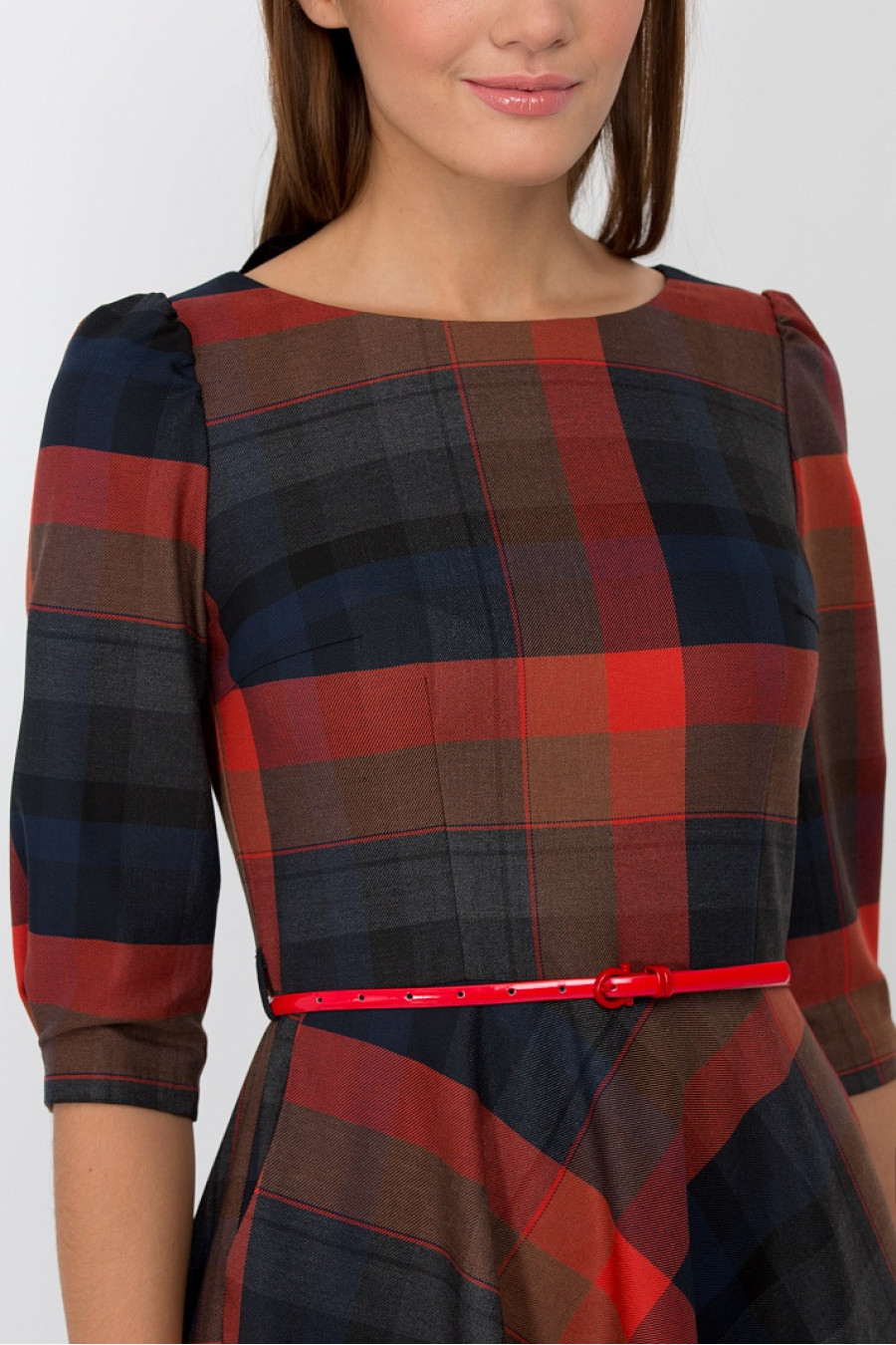 Оригинальное платье приталенного силуэта с расклешенной юбкой. Модель с округлым вырезом горловины и рукавами 3/4. В боковом шве-застёжка на потайную молнию. Прекрасный вариант для модных женщин, желающих подчеркнуть свою индивидуальность и хороший вкус. Длина: 108 см. Ремень не входит в комплект. Без подклада.