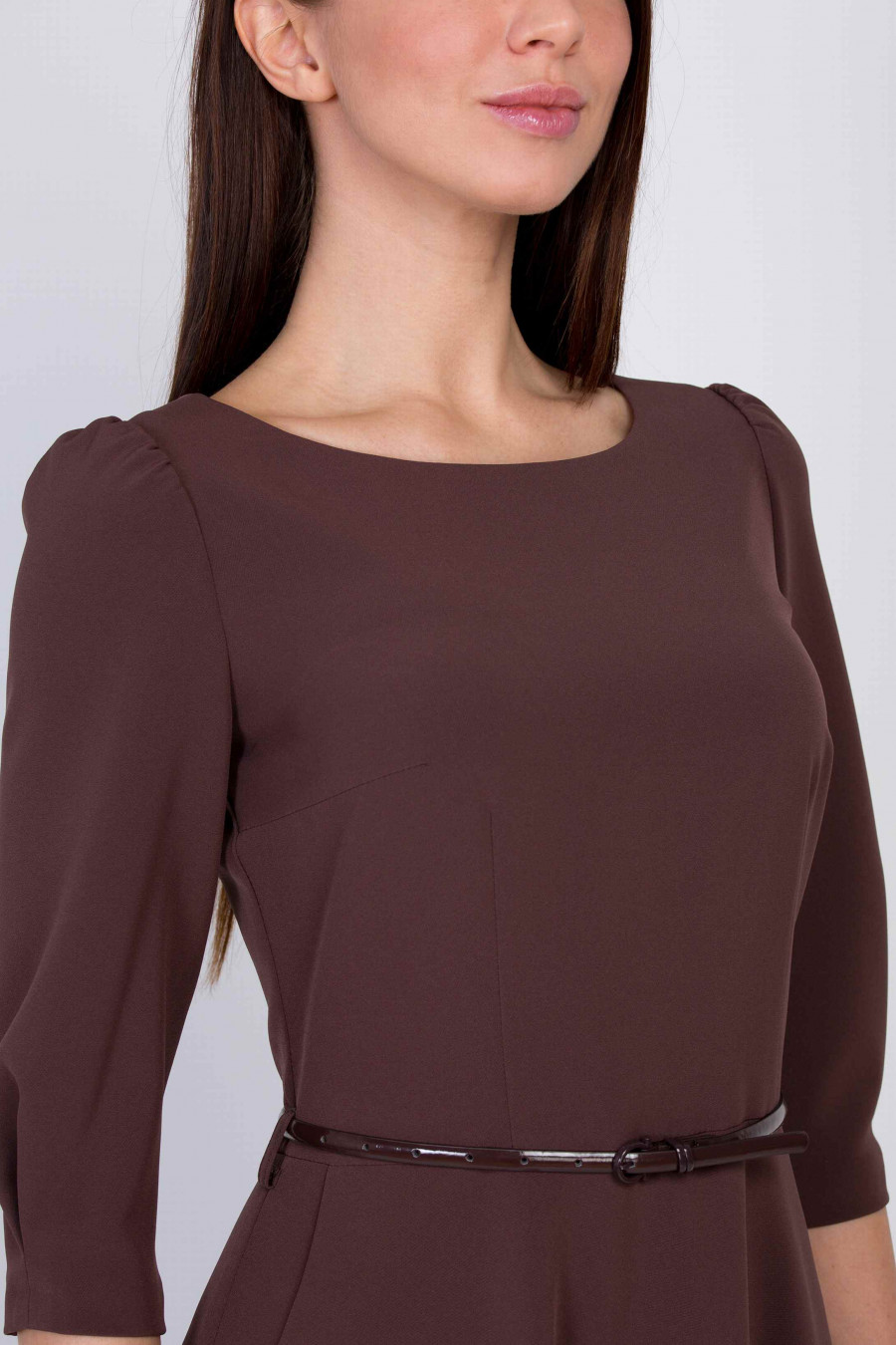 Женственное платье классического силуэта, который подчеркивает все достоинства фигуры. Ткань мягкого шоколадного цвета очень приятная на ощупь. Рукав 3/4 с легкими сборками по плечу, есть два элегантных кармана по бокам, застежка-молния с левого бока. На поясе есть шлевки, ремешок продается отдельно. Платье отлично подойдет для повседневной носки, а с аксессуарами станет отличным выбором для романтического свидания.