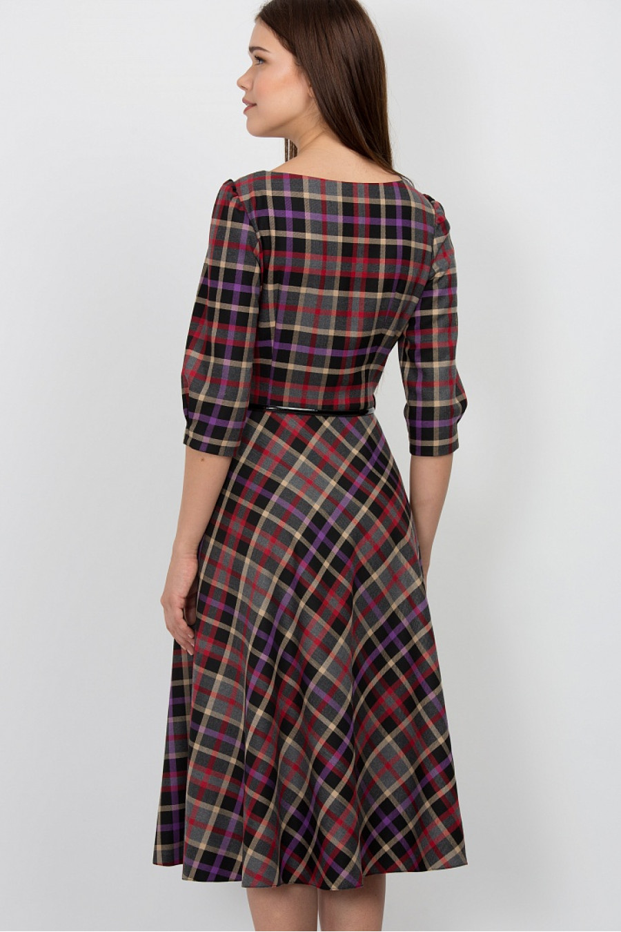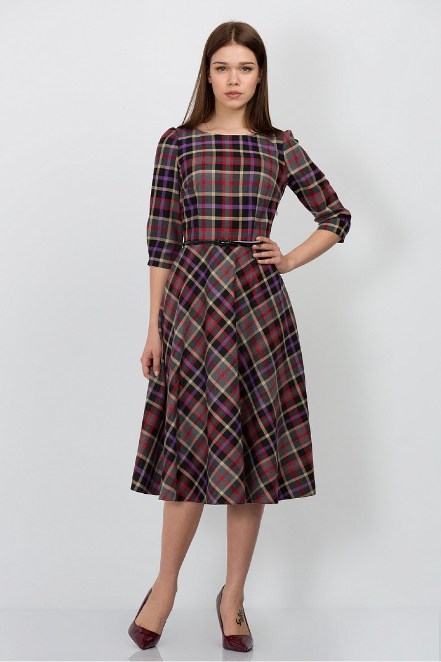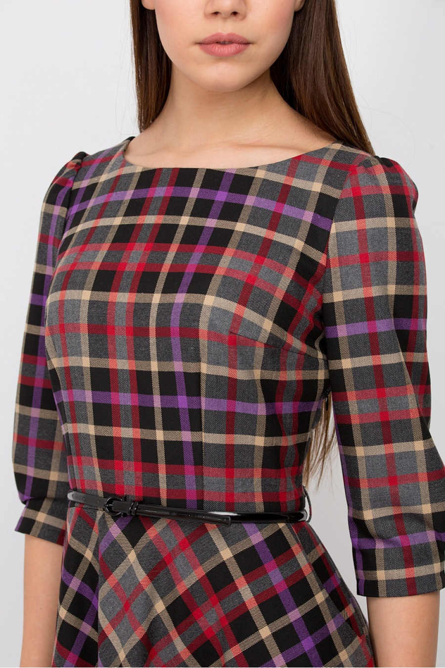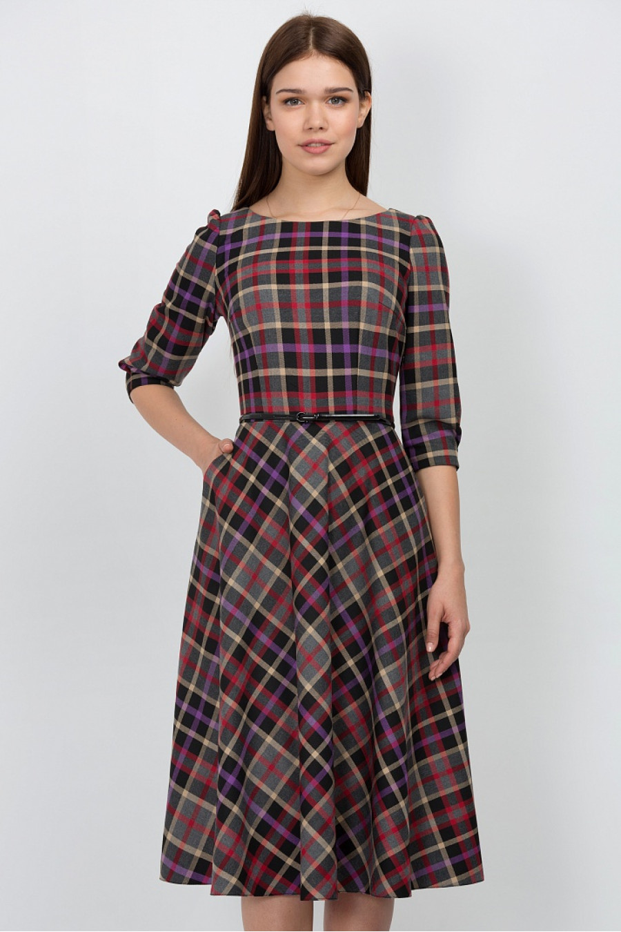 Оригинальное платье приталенного силуэта с расклешенной юбкой. Модель с округлым вырезом горловины и рукавами 3/4. В боковом шве-застёжка на потайную молнию. Прекрасный вариант для модных женщин, желающих подчеркнуть свою индивидуальность и хороший вкус. Длина: 108 см. Ремень не входит в комплект. Без подклада.