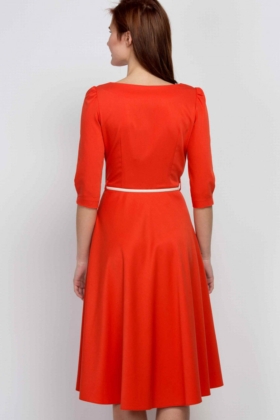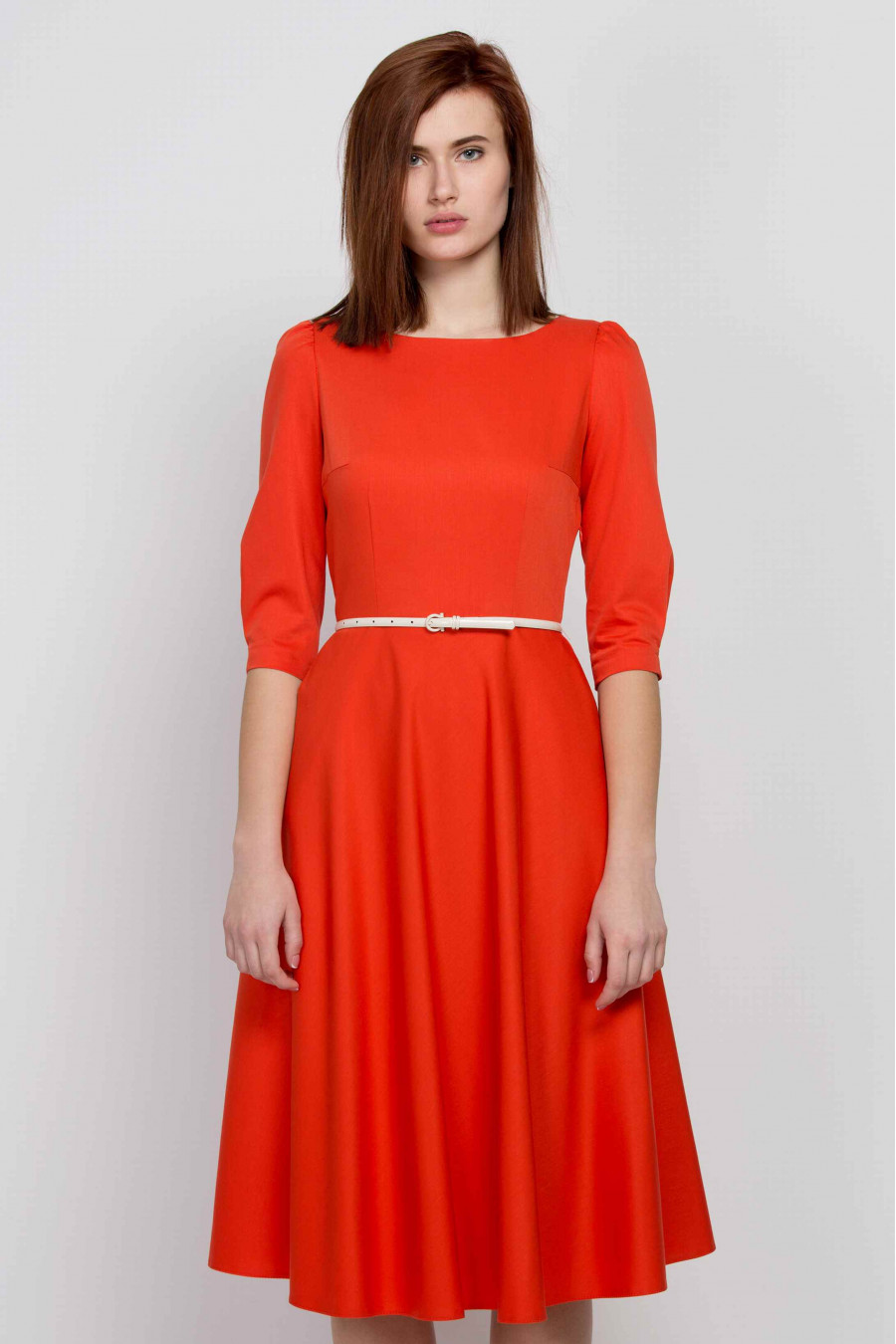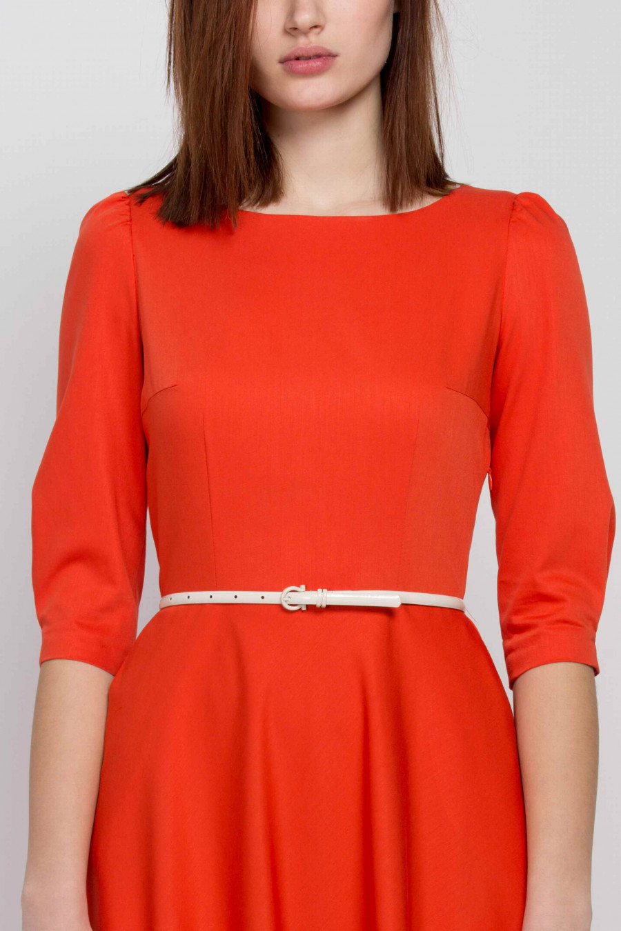 Романтичное платье классического силуэта, который подчеркивает все достоинства женской фигуры. Ткань легкая темно-оранжевого цвета, очень приятная на ощупь. Рукав 3/4 с легкими сборками, есть два кармана по бокам, застежка-молния с левого бока. Без подклада. На поясе есть шлевки, ремешок продается отдельно. Хорошо подойдет для офиса, а с аксессуарами станет отличным выбором для романтического свидания.