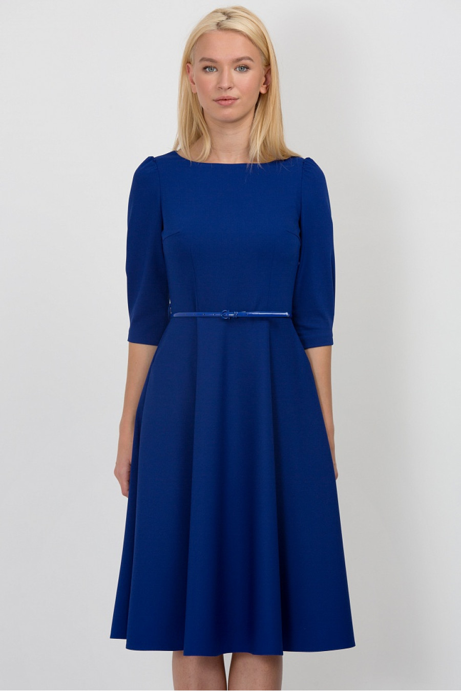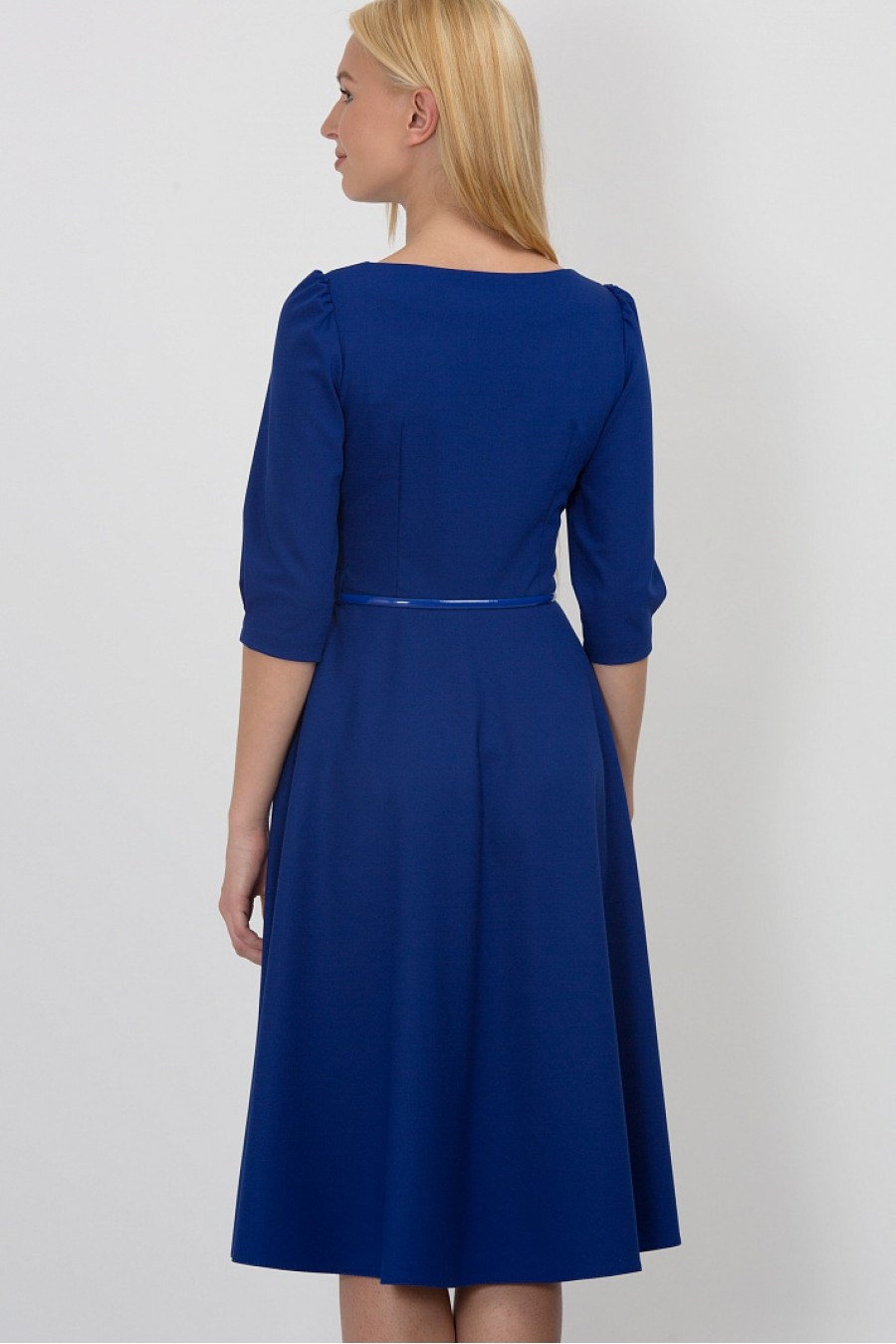 Романтичное платье классического силуэта, который подчеркивает все достоинства женской фигуры. Ткань цвета электрик средней плотности, очень приятная на ощупь. Рукав 3/4 с легкими сборками по плечу, есть два кармана по бокам, застежка-молния с левого бока. Без подклада. На поясе есть шлевки, ремешок продается отдельно. Идеально подойдет для выхода в театр.