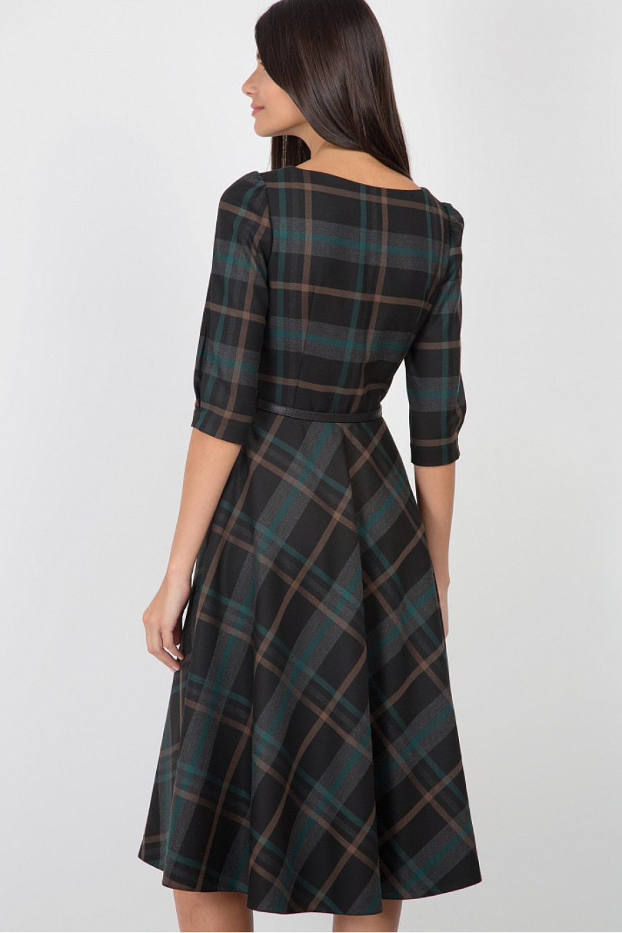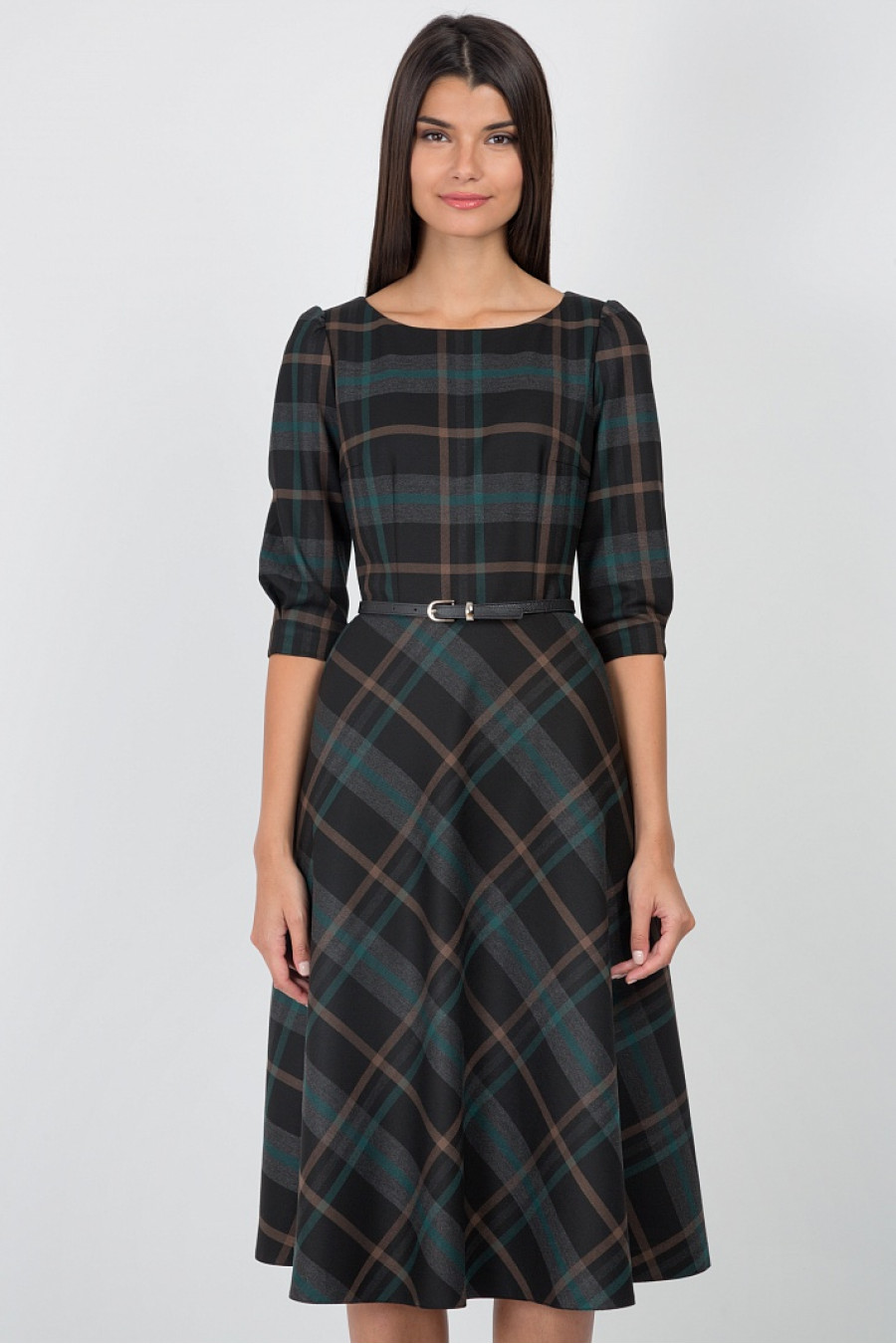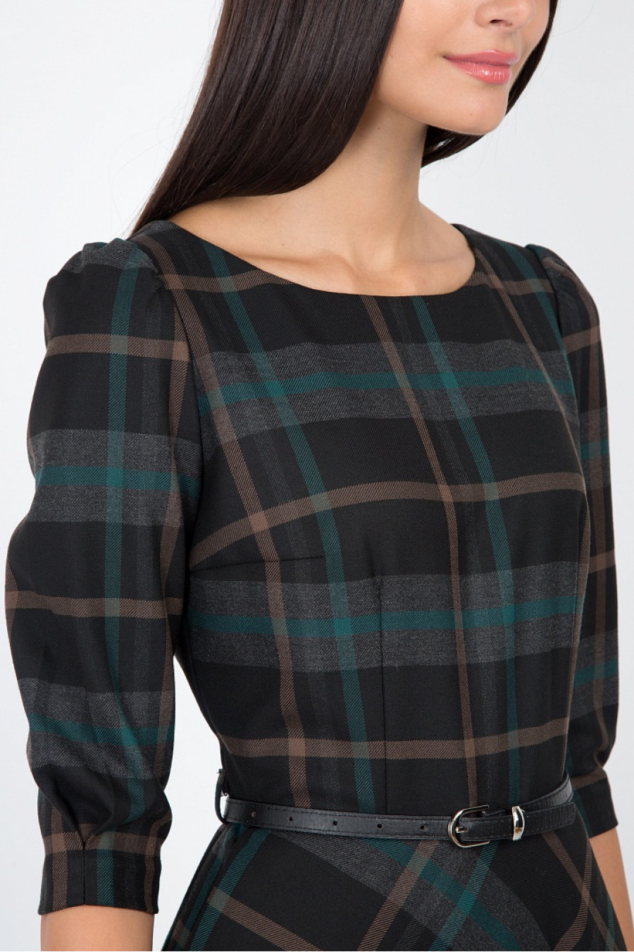 Оригинальное платье приталенного силуэта с расклешенной юбкой. Модель с округлым вырезом горловины и рукавами 3/4. В боковом шве-застёжка на потайную молнию. Прекрасный вариант для модных женщин, желающих подчеркнуть свою индивидуальность и хороший вкус. Длина: 109 см. Ремень не входит в комплект.