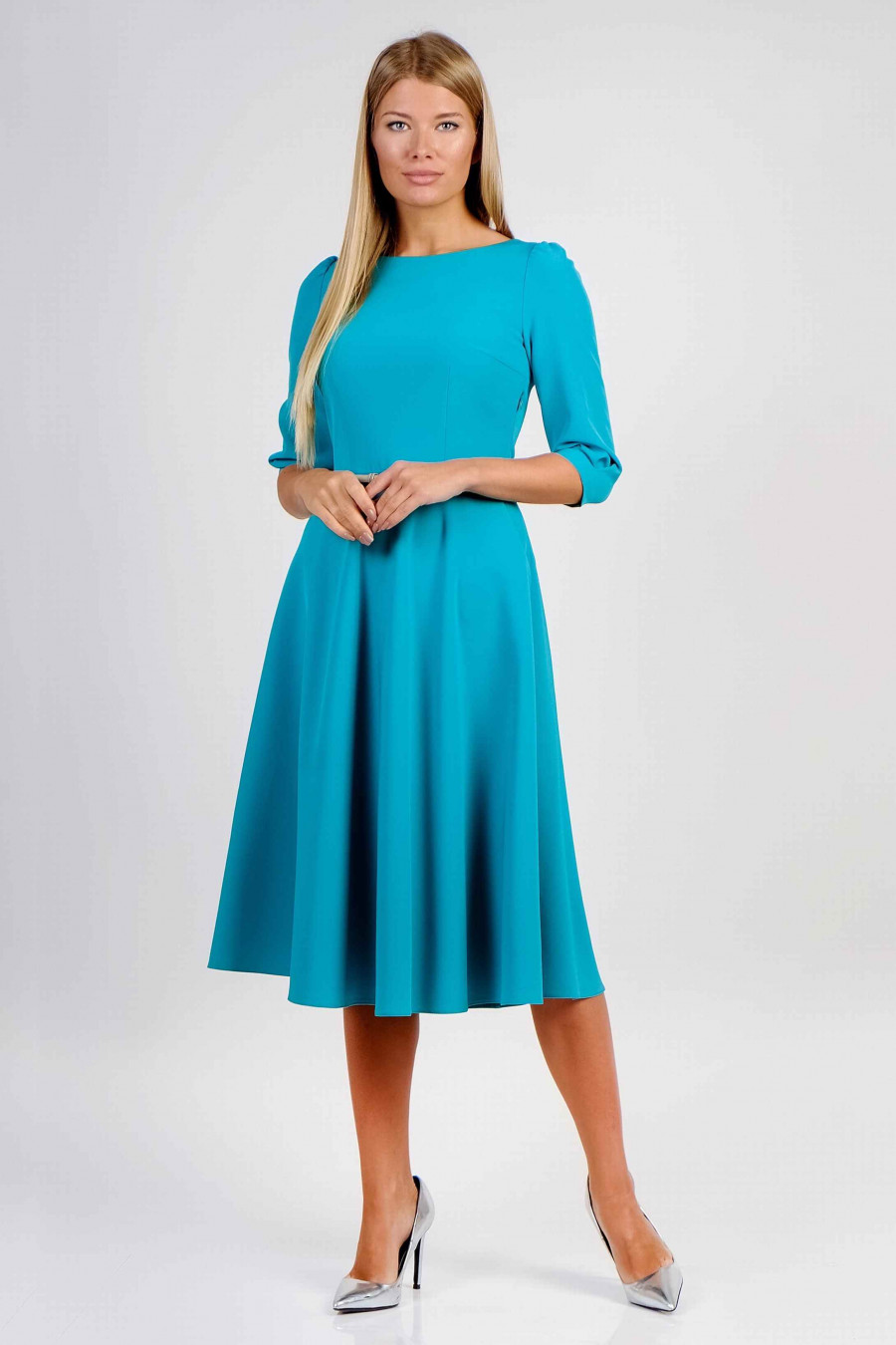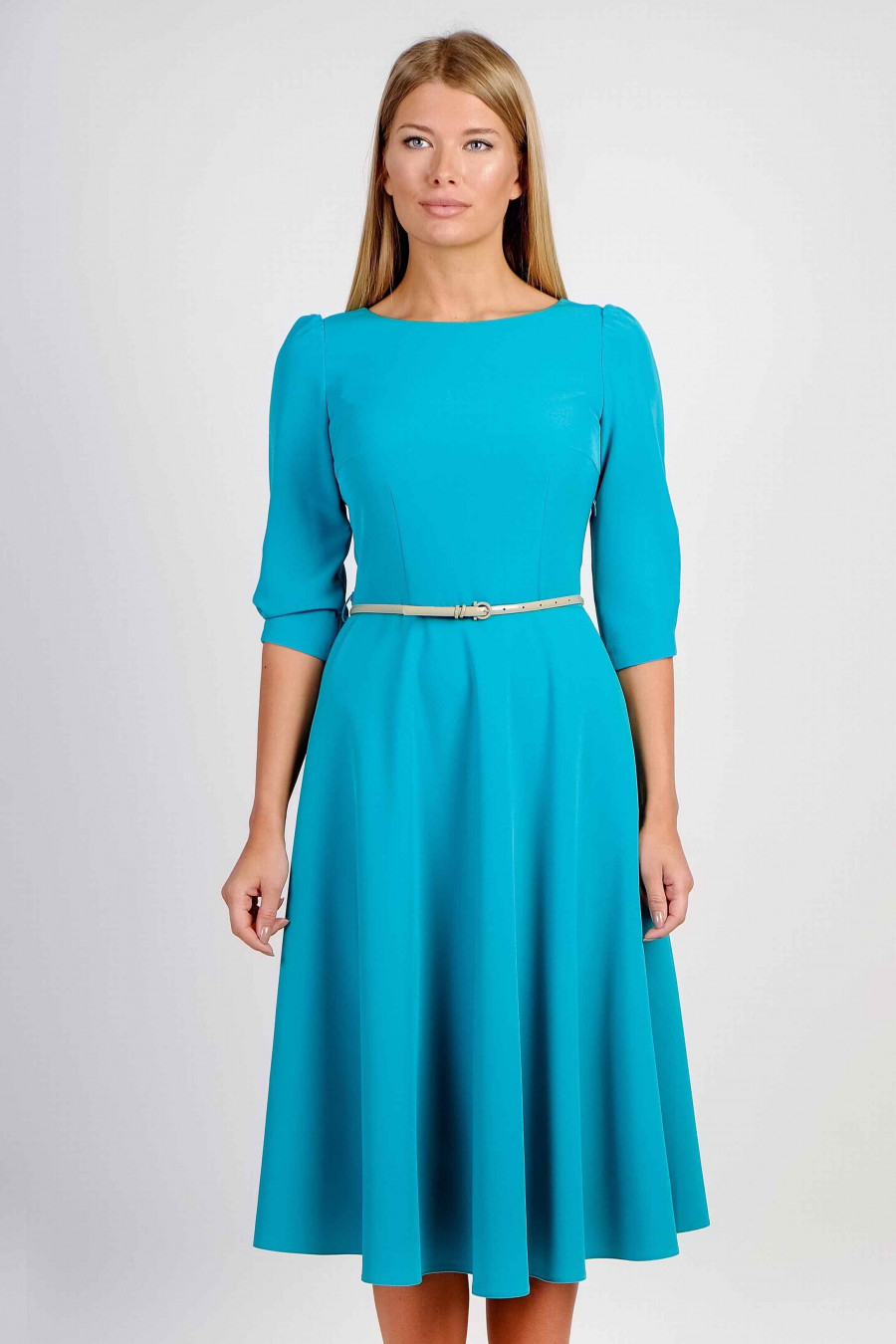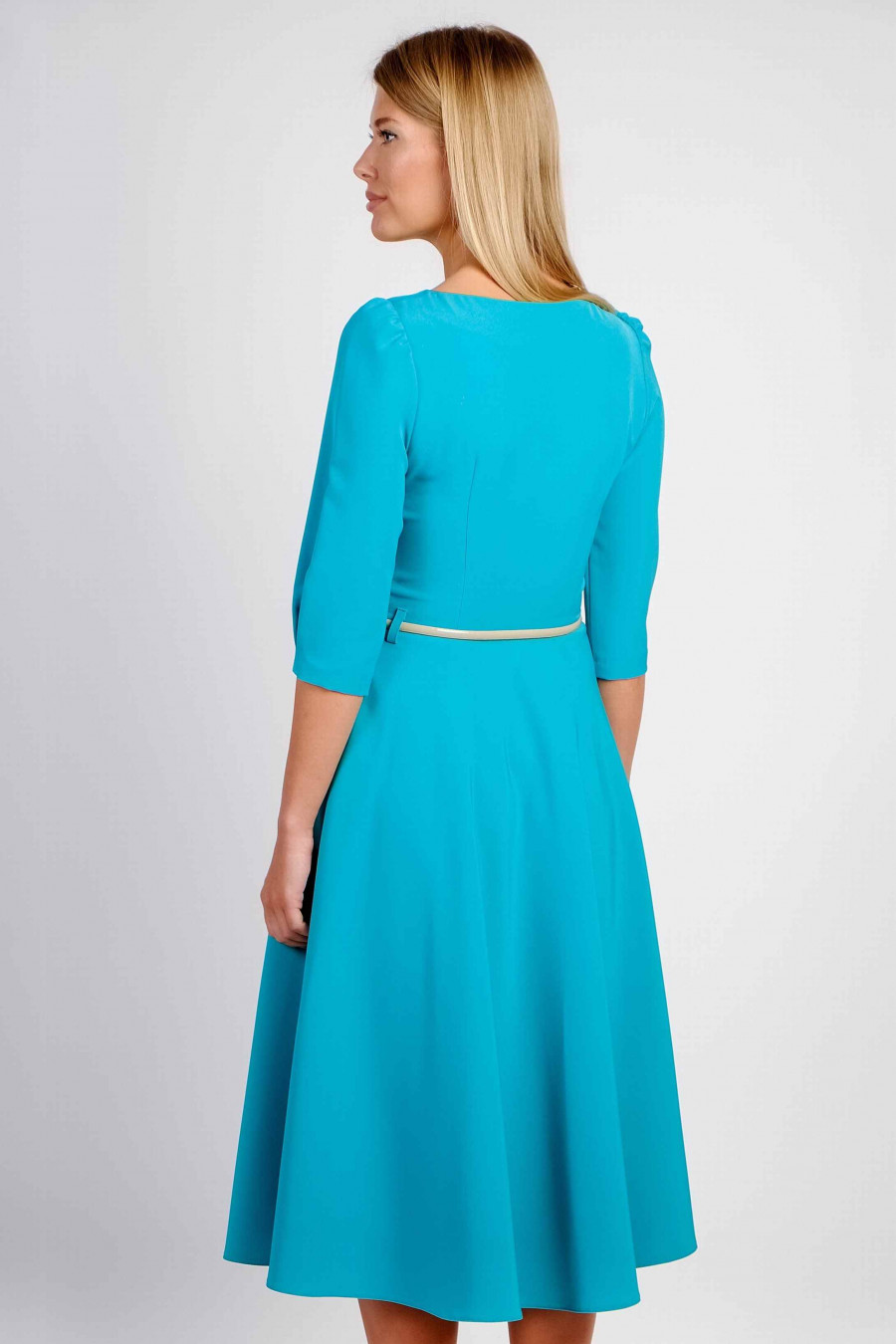 Женственное платье классического силуэта, который подчеркивает все достоинства фигуры. Ткань бирюзового цвета, очень приятная на ощупь. Рукав 3/4 с легкими сборками по плечу, есть два элегантных кармана по бокам, застежка-молния с левого бока. На поясе есть шлевки, ремешок продается отдельно. Без подкладки. Платье отлично подойдет для повседневной носки, а с аксессуарами станет отличным выбором для романтического свидания.
