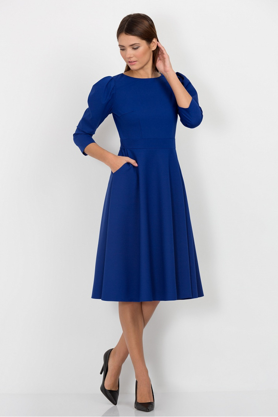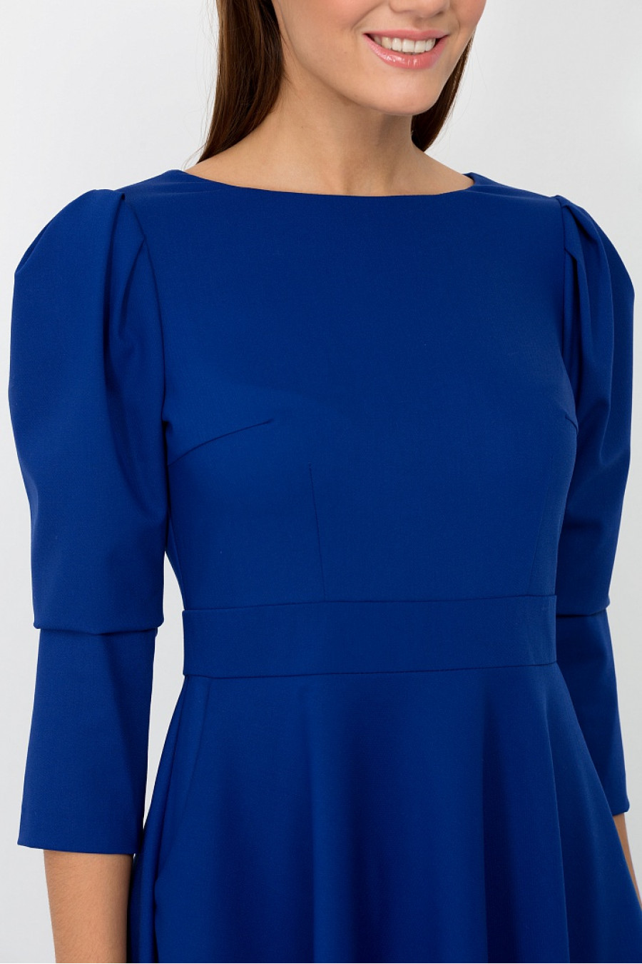 Оригинальное платье приталенного силуэта с расклешенной юбкой. Модель с округлым вырезом горловины и рукавами 3/4. В боковом шве-застёжка на потайную молнию. Прекрасный вариант для модных женщин, желающих подчеркнуть свою индивидуальность и хороший вкус. Длина: 107 см. Без подклада.
