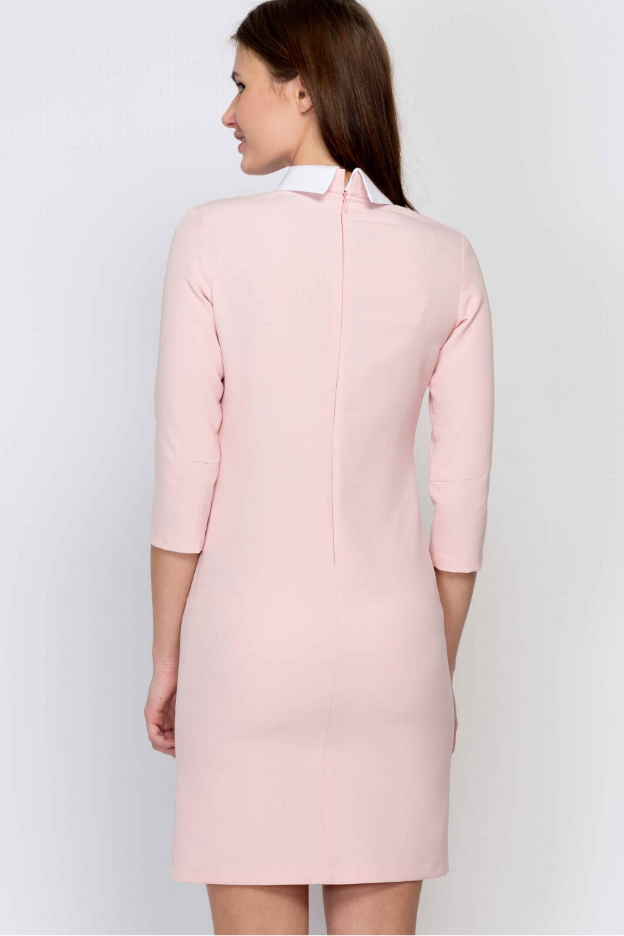 Стильное платье полуприталенного силуэта нежно-розового цвета. Ткань средней плотности, гладкая с легким эффектом глянца. Без подкладки, рукав 3/4, на спинке застежка-молния. Аккуратный белый воротничок пристегивается на пуговицах. Замечательное офисное платье.